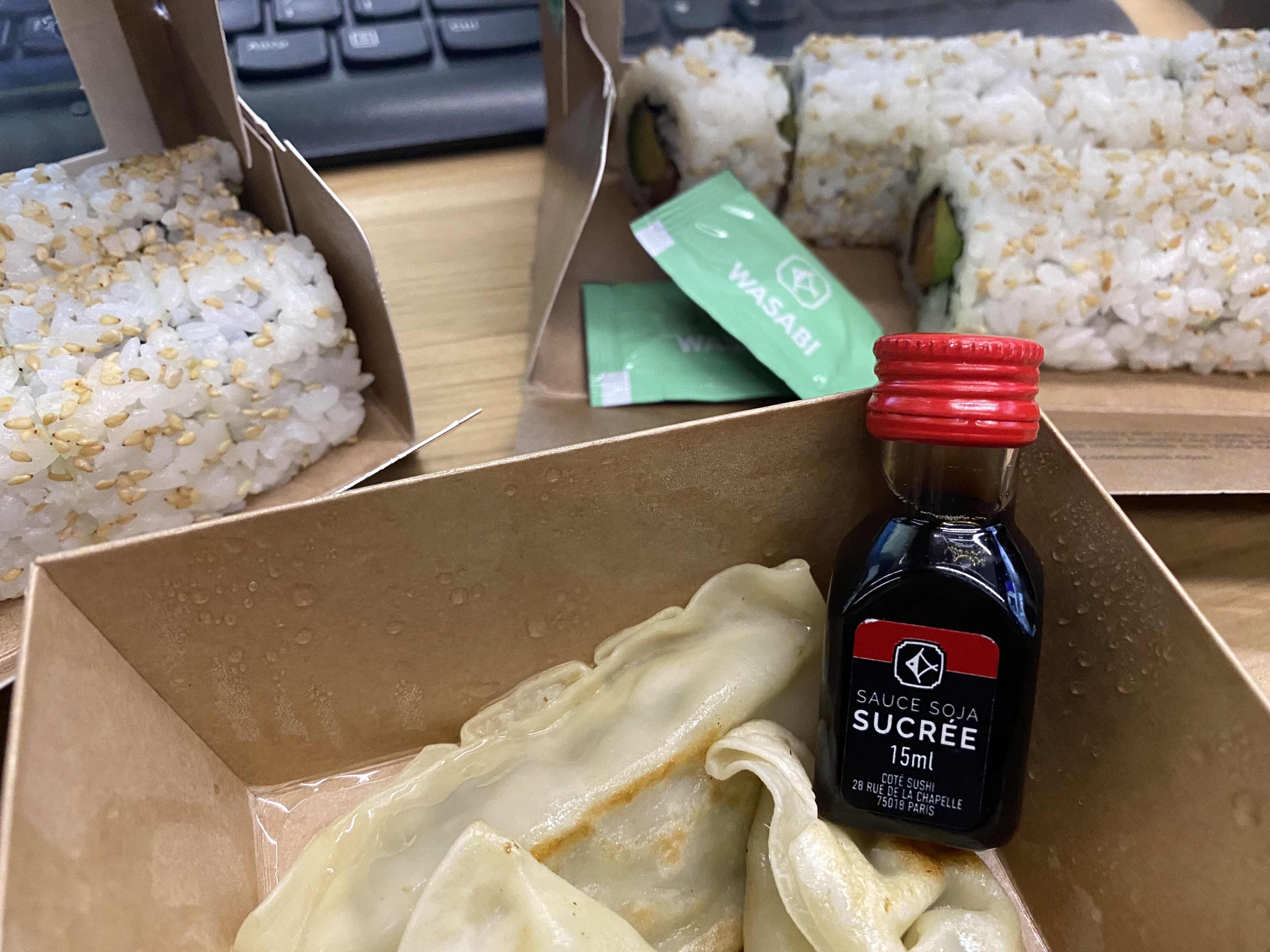 Que les sauces soient sucrées ou salées, les deux premières sont gratuites (enfin, comprises dans le prix) et les supplémentaires deviennent payantes : systématiquement, celles demandées en plus (et donc payées) ne sont pas livrées. Souvent ce qui a été commandé ne correspondant pas à ce qui est livré, comme une nouvelle fois ce soir où la moitié de la commande (la box n'ayant pas de sushis, voir photos) n'a jamais été commandée et est totalement erronée. Enfin, les livreurs ne montent jamais, bien que ce soit leur travail, et font tout pour ne pas monter (même s'il y a un ascenseur et qu'on propose de leur donner le code) alors que cela fait partie de leur travail. Au lieu de faire des remises de 5€ ou 10€ ridicules, Coté Sushi ferait mieux de simplement faire son travail et de faire en sorte que ce qui est commandé et payé soit ce qui est livré et que la livraison soit bien faite. (Apparemment, payer 40 balles ne suffit pas pour garantir cela.) Car ce n'est pas très compliqué de le faire, il suffit de lire la commande, de prendre les choses correspondantes, de les mettre dans le même sac etc, ce n'est pas de la physique théorique ni de la chirurgie de pointe, n'importe qui peut le faire. C'est la dernière fois que je commande dans ce restaurant.