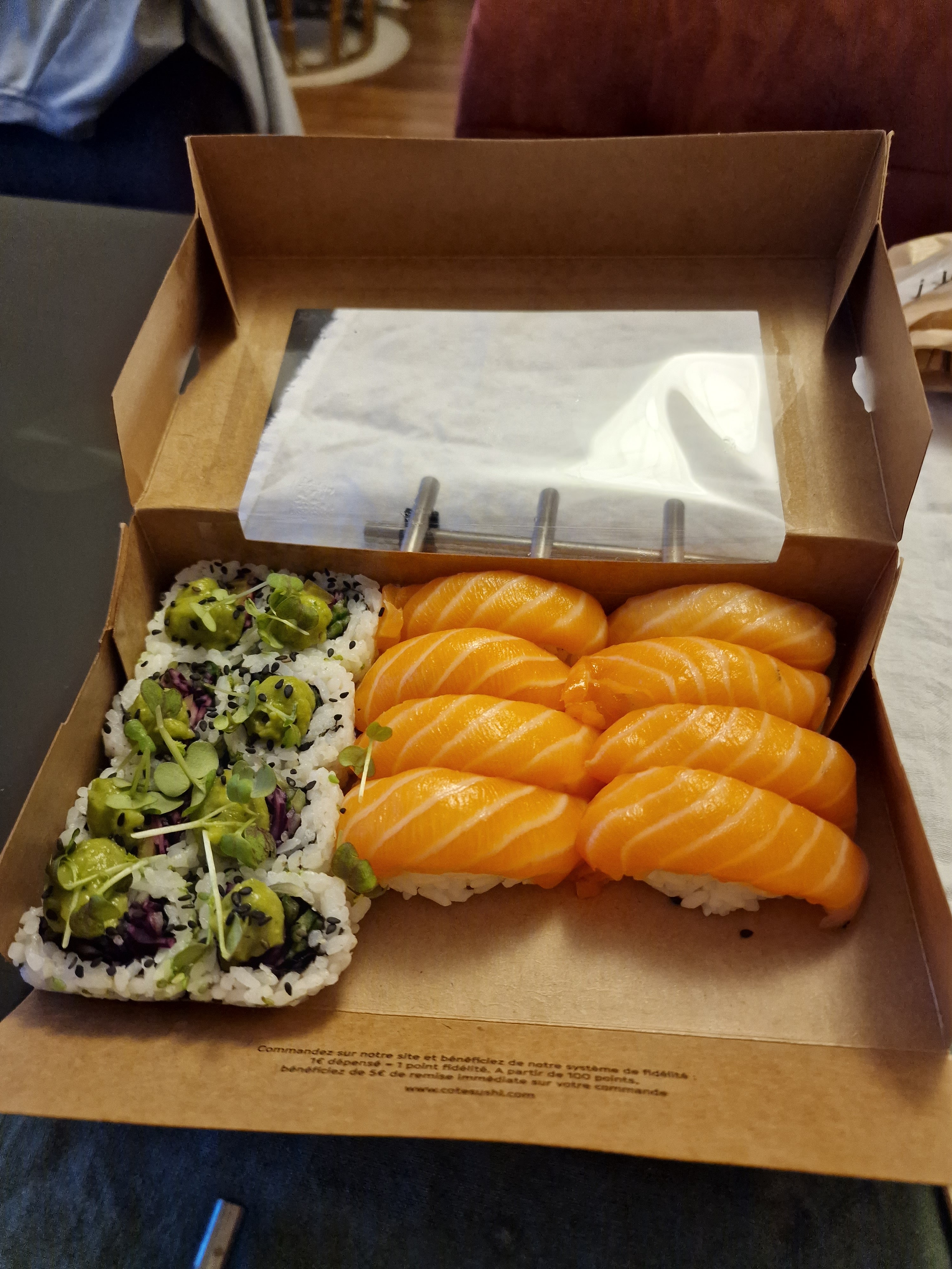 Livraison très rapide et la personne était très gentille. Par contre les sushi ne sont pas frais. Je suis une fanatique de nourritures japonaises et j’en mange minimum 1x par semaine. Mais là le saumon n’était pas bon et avait une odeur. 1ere fois que je testais CôtéSushi…