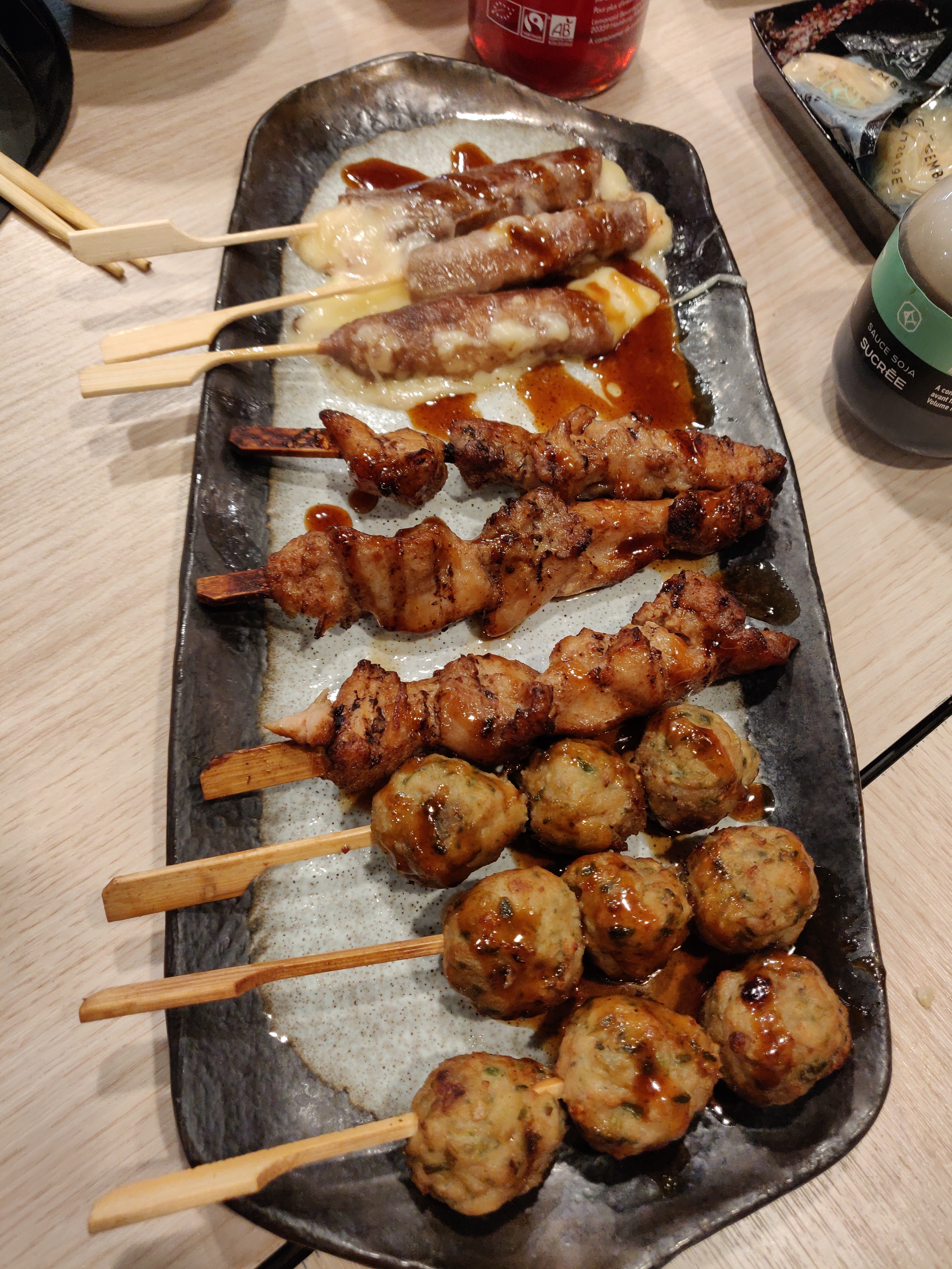 Très mauvaise qualité/prix, le texture de riz au sushi bizarre, on dirait ça a laissé longtemps. Le couleur de saumon a l’air laissé un peu longtemps et devient sec. Brochettes sont pas bons non plus.. Trop déçue.
