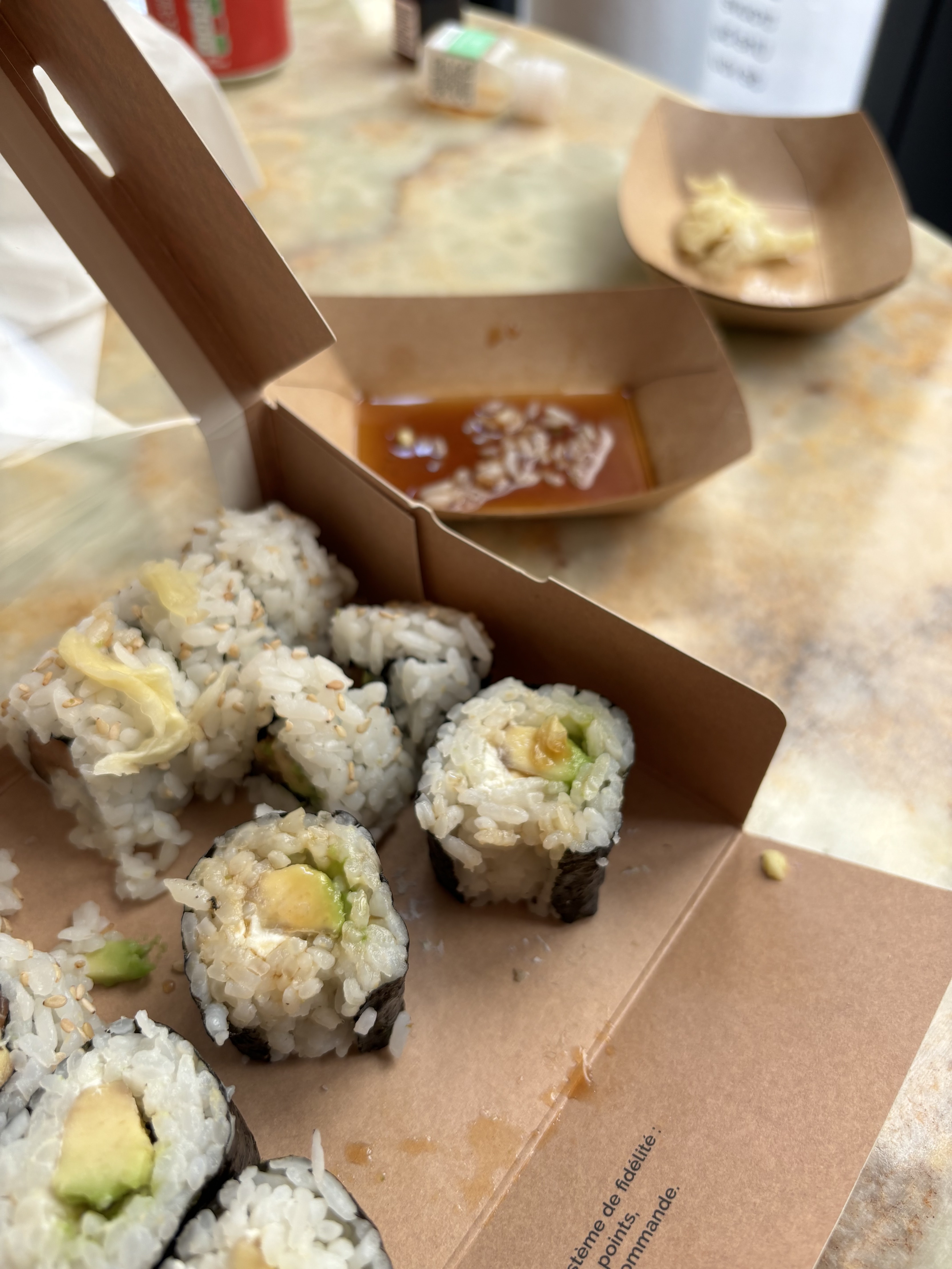 Commandé sur Uber Eats : c'est allé assez vite, mais le riz se disolquait trop facilement rendant les makis compliqués à manger. Le ponpon : sur 2 makis traînaient des morceaux de plastique.... allez savoir d'où ils viennent, toujours est il que c'est très moyen côté sécurité alimentaire !