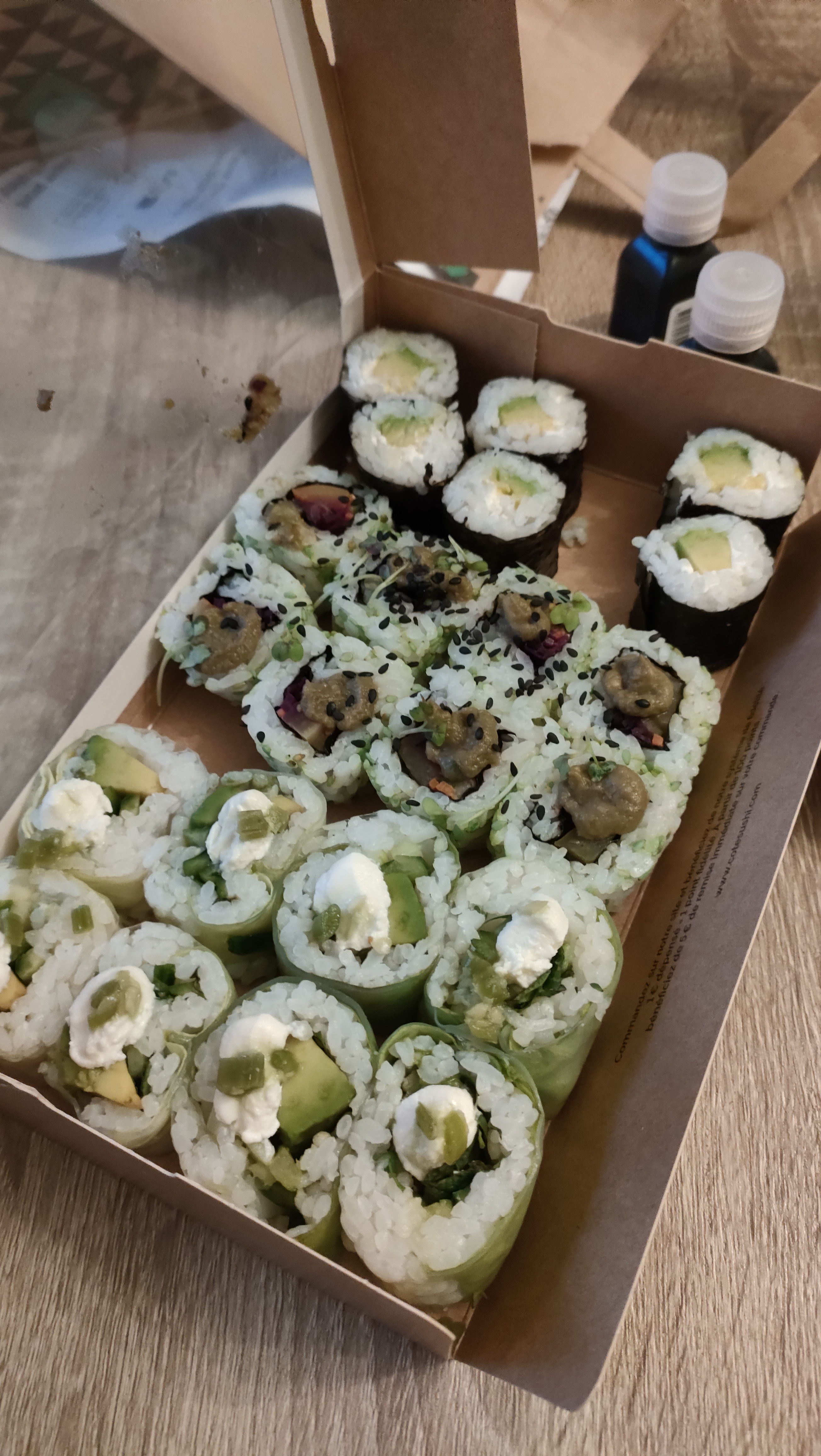 Commande en livraison. Ultra rapide. Surprenant. Sushi sec. Préparé largement en avance. Pas de goût. Le crispy était mou. Riz sec sans goût. Pas du tout vinaigre comme devrait être les sushi. Présentation décevante. Sushi avec des feuilles de riz sec. Même pas des feuilles de noiri. Algues japonaise. Ultra décevant
