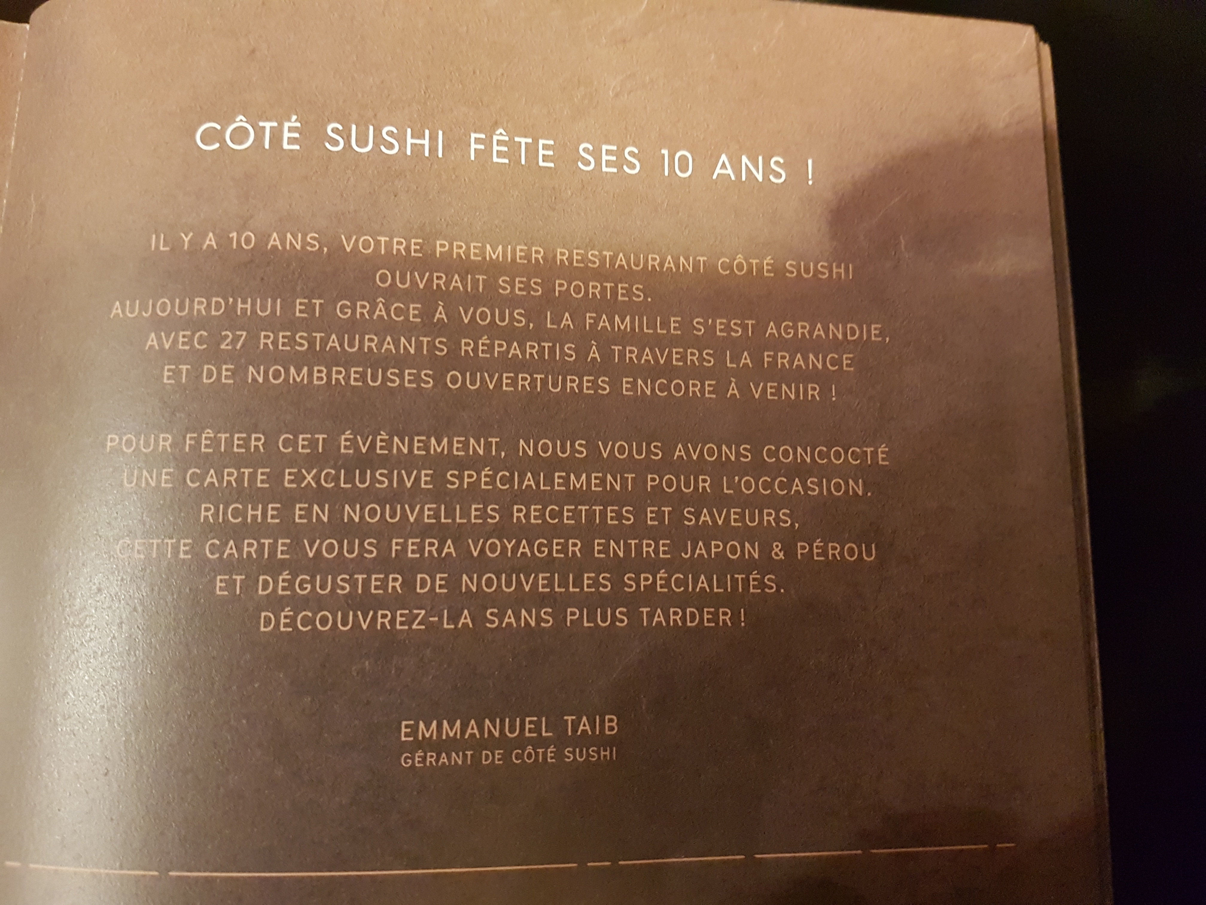 [Septembre 2018] Nous n’avons jamais mangé sur place. Mais les plats sont délicieux, et le prix en vaut la peine. [Mise à jour Juin 2019] Côté Sushi récupère nos informations personnelles illégalement (RGPD !), depuis les autres sites (just-eat, deliveroo, uber-eats...), ils les traitent et les stockent dans leur base de données. Du coup, moi qui n'ai jamais commandé chez Côté Sushi, j'étais accusé d'être déjà client et de pas avoir le droit aux avantages nouveau client. Sur de moi je m'en plaignait, en affirmant que c'était une erreur. Mais visiblement si ma copine ou ma soeur ont déjà passé commande chez eux... il vous considèrent clients ! 0 vie privée, RGPD 0.