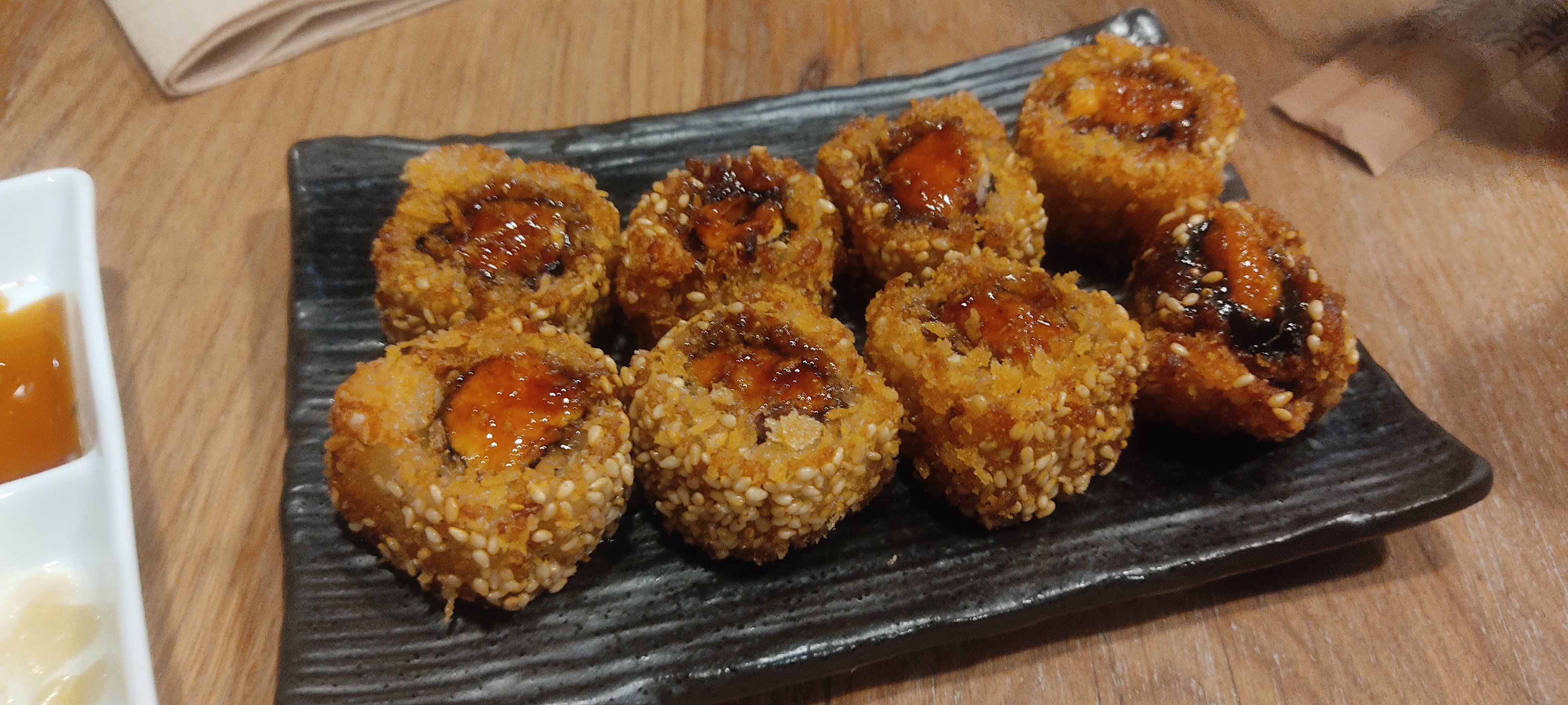 Le sushi cuit est carbonisé et excessivement huileux!!! Dès que mon mari et moi l'avons goûté, nous avons ressenti des nausées.