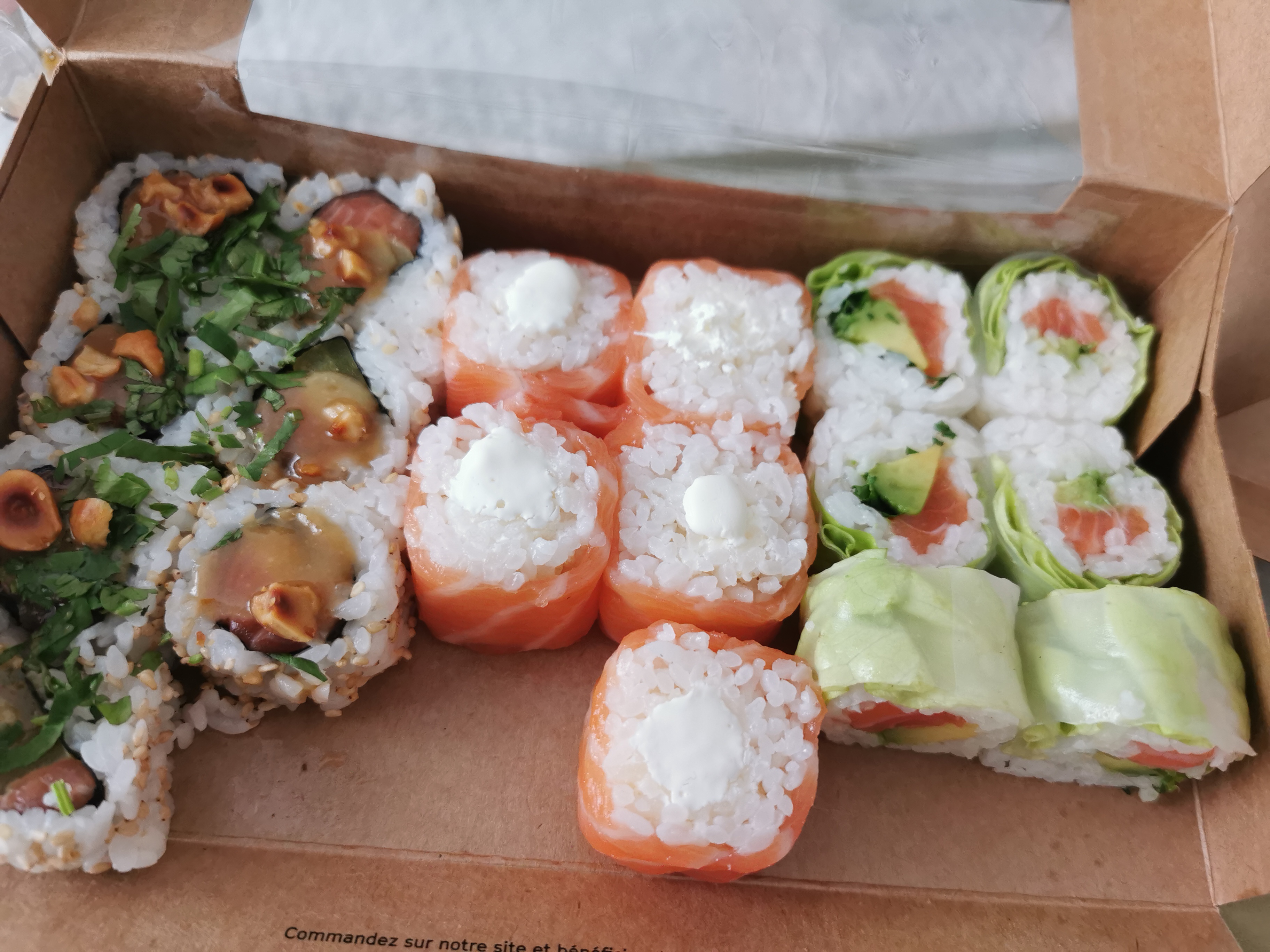 J'ai commandé 2 boxes de 64 sushis , je trouve que le riz étaient durs encore , le thon n'était pas très bon aussi, il y avait des sushis très bon mais d'autre avec un goût bizarre .
