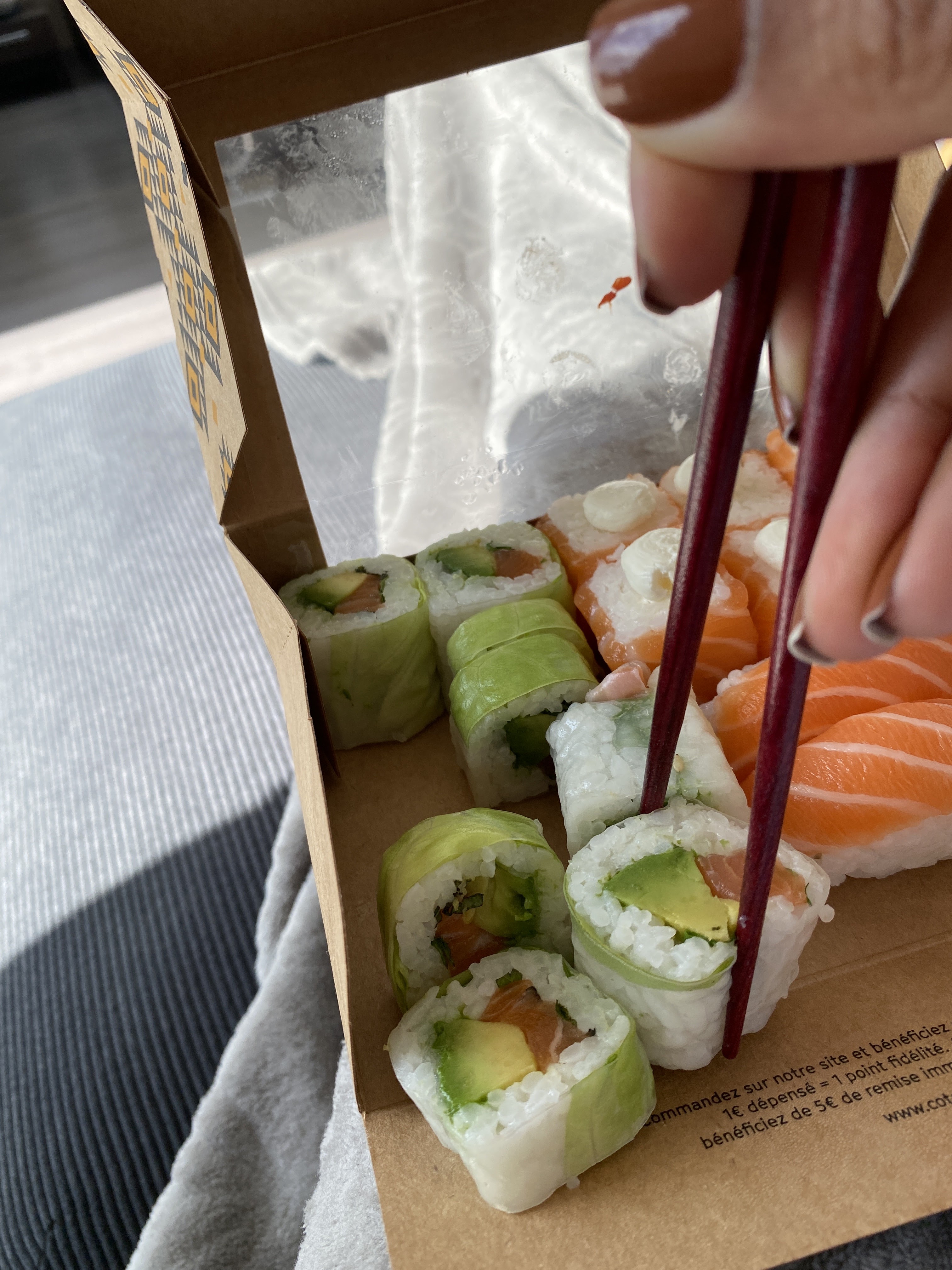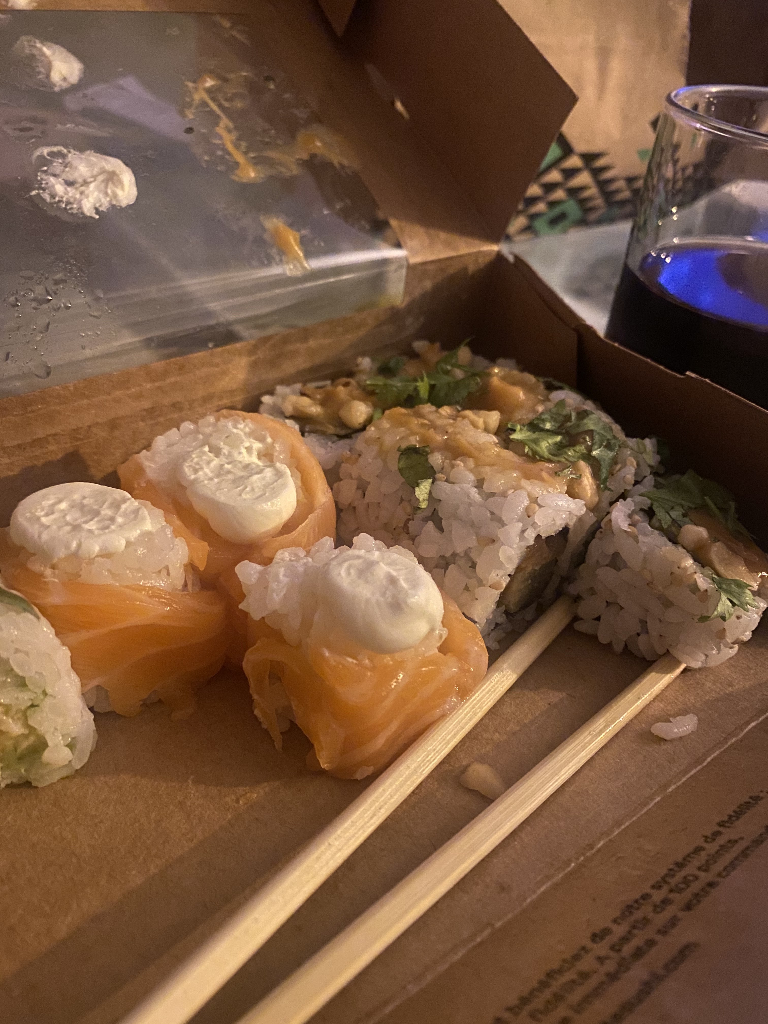 Commande uber eat, le riz était très mal cuit et le saumon plein d'arrêtes. C'est quand même la base des sushis...