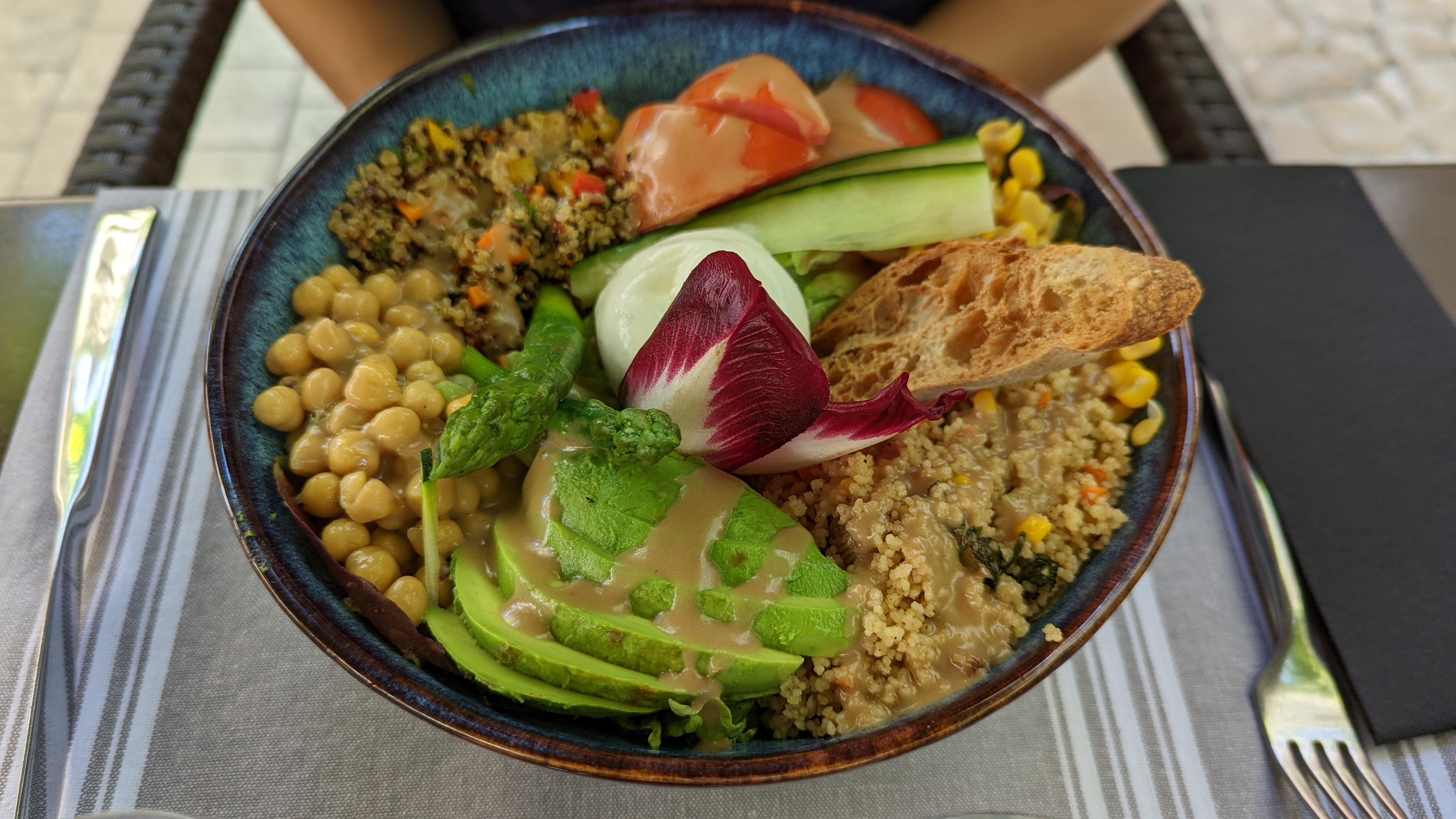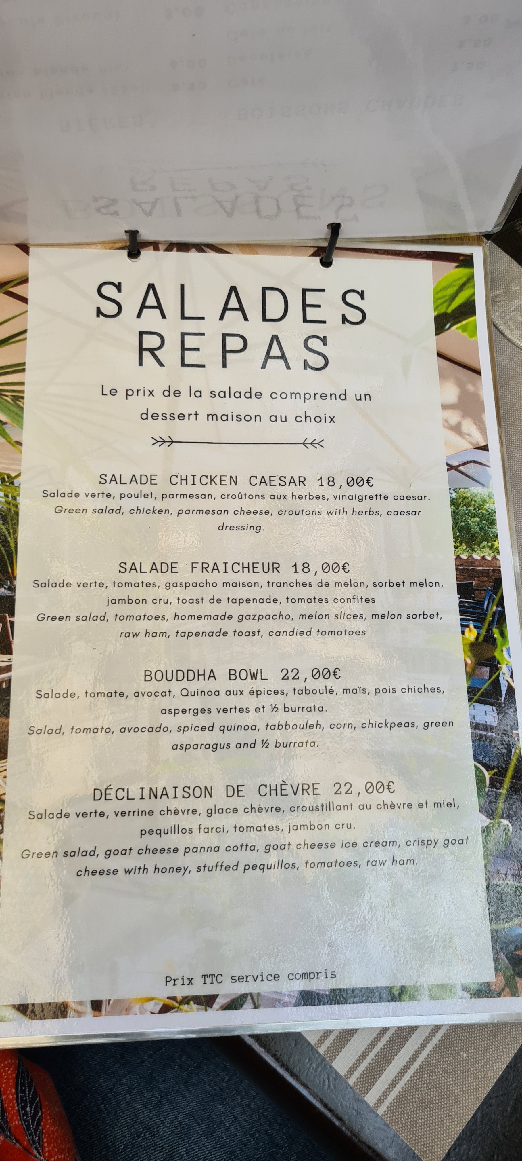 Cadre super en terrasse en cette fin du mois de mai. Service avec le sourire, rapport qualité/prix très correct. Nous avons pris un bouddha bowl, une salade repas déclinaison au chèvre (j'ai pu notamment goûter à la glace et au panna cotta de chèvre très bons), un supplément de frites, deux apéros bière et sirop de kiwi, et les deux desserts compris dans les salades repas --> 55€. Ma conjointe a fortement aimé le riz au lait. Par contre, tenter d'avoir une table sans réserver est très risqué (on a en effet vu bcp de monde se faire refuser une table car déjà complet). Un resto à conseiller sur Seguret!