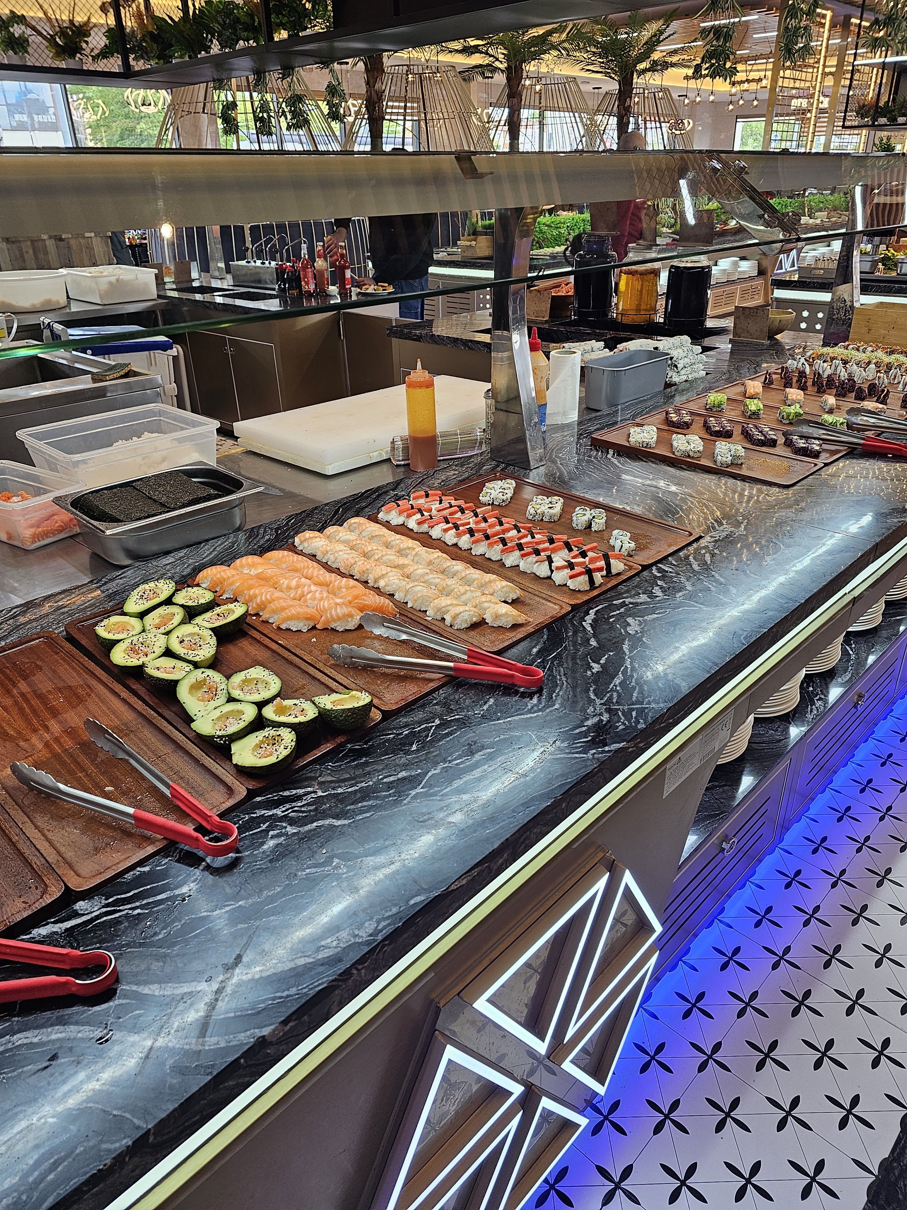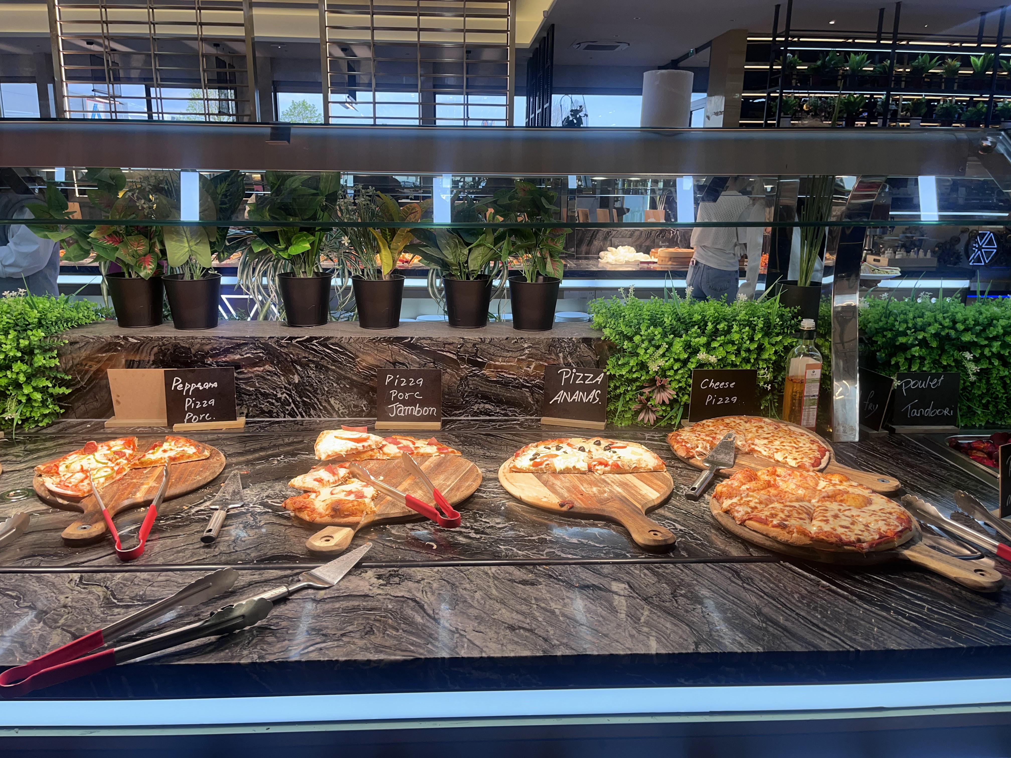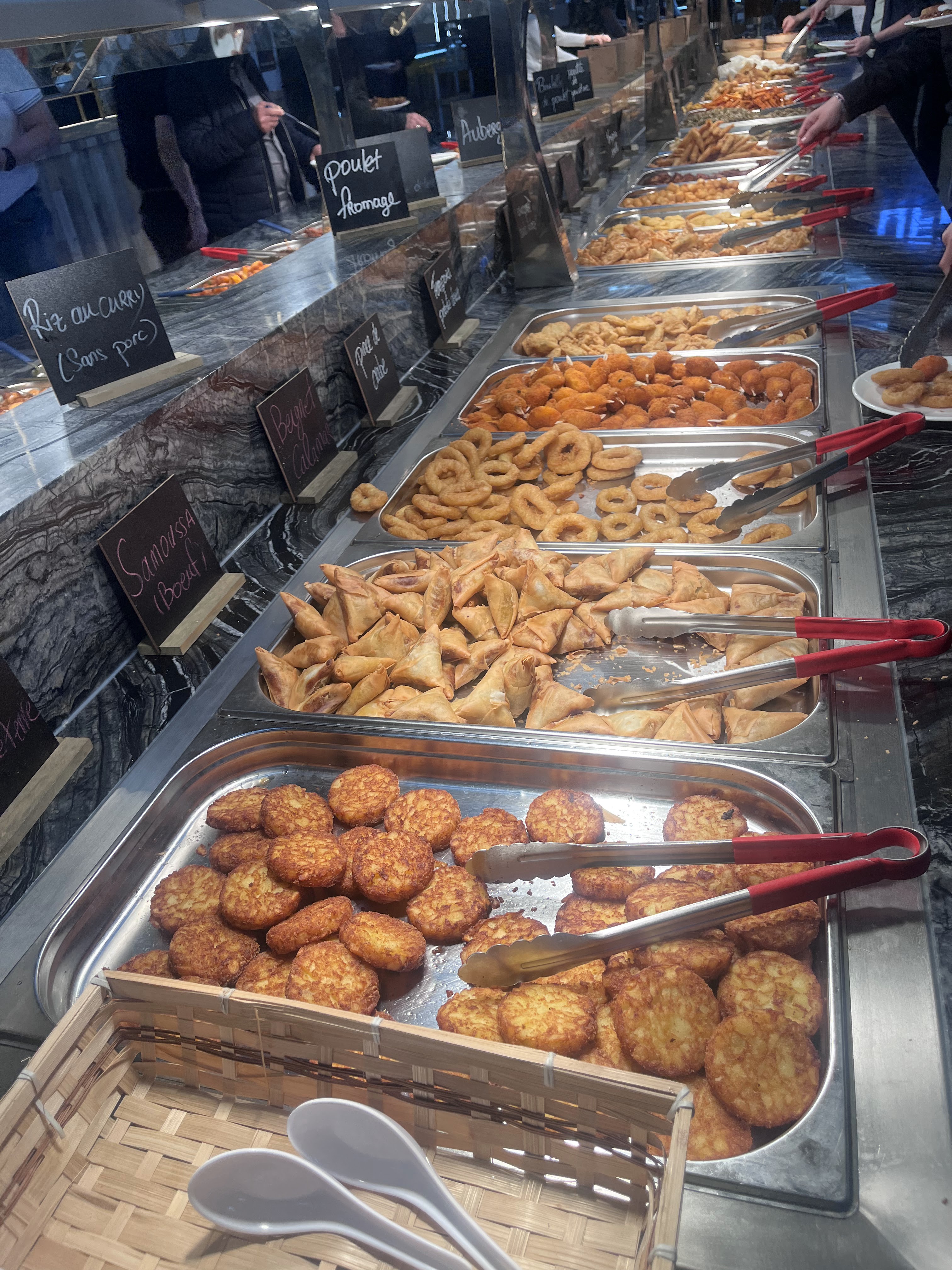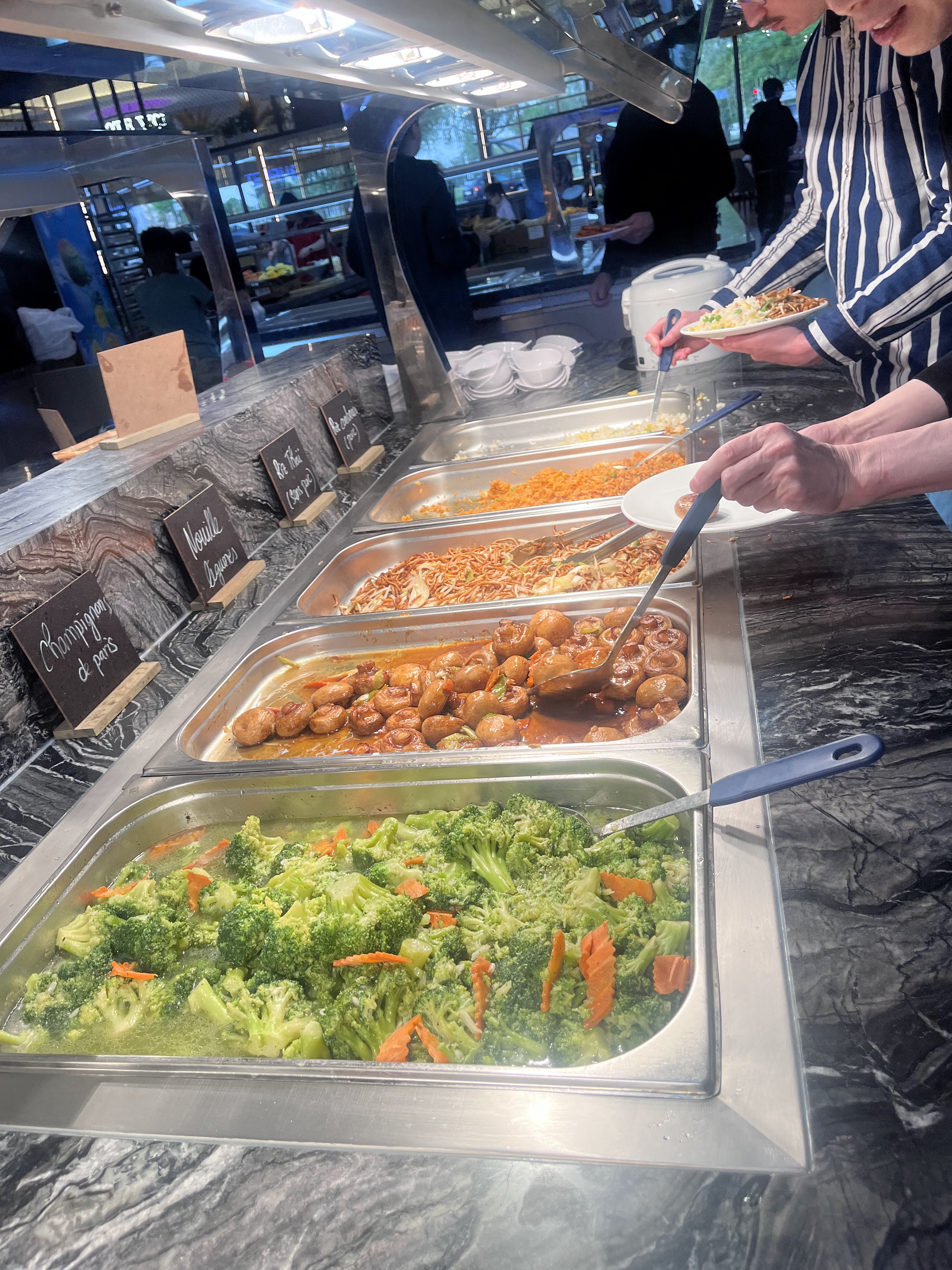 Bonne variété de plats differents, le personnel est en général assez agréable. CEPENDANT les 2 personnes responsable du bar a sushi, à remplacer, désagréable et se bizarres: regarde tout le monde qui passe et surtout tente de me shadowban des sashimi saumon: remplit uniquement après mon départ et se plaignent que j'en prend trop, je me fais une reserve car ils ne servent pas les sashimi en ma présence, entré dans un cercle vicieux. Reste de l'équipe agréable et sympathique.
