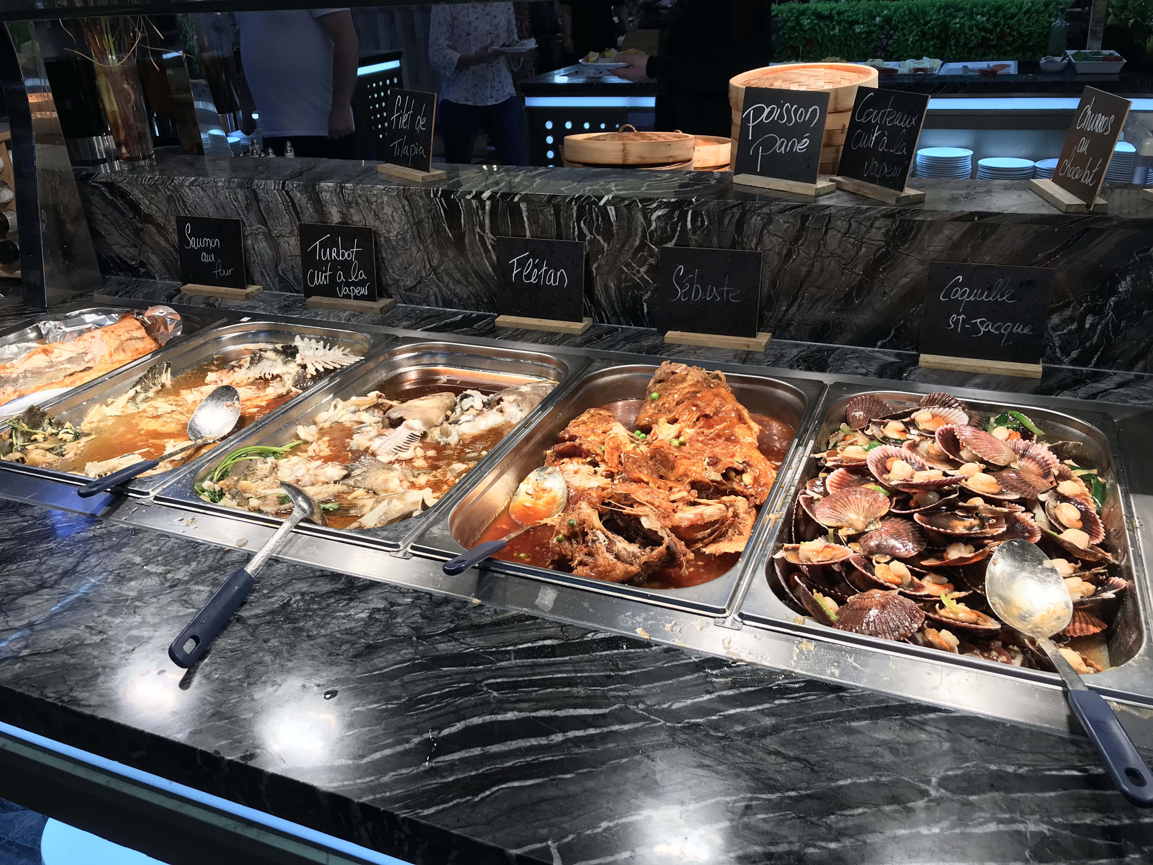 Très bon buffet à volonté. Équipe réactive et aimable. Le choix est monstrueux que ce soit en plats salés et sucrés. Les fruits de mer sont frais. Vous avez un côté wok et grillade. Vous choisissez vos viandes et poissons, le personnel se charge de les cuire. En termes de variétés, les plats sont chinois, japonais, indiens et français. Des pizzas sont à disposition. Les Saint Jacques cuisinées et les moules au persil sont excellentes. Ps: tickets restos acceptés Je recommande !
