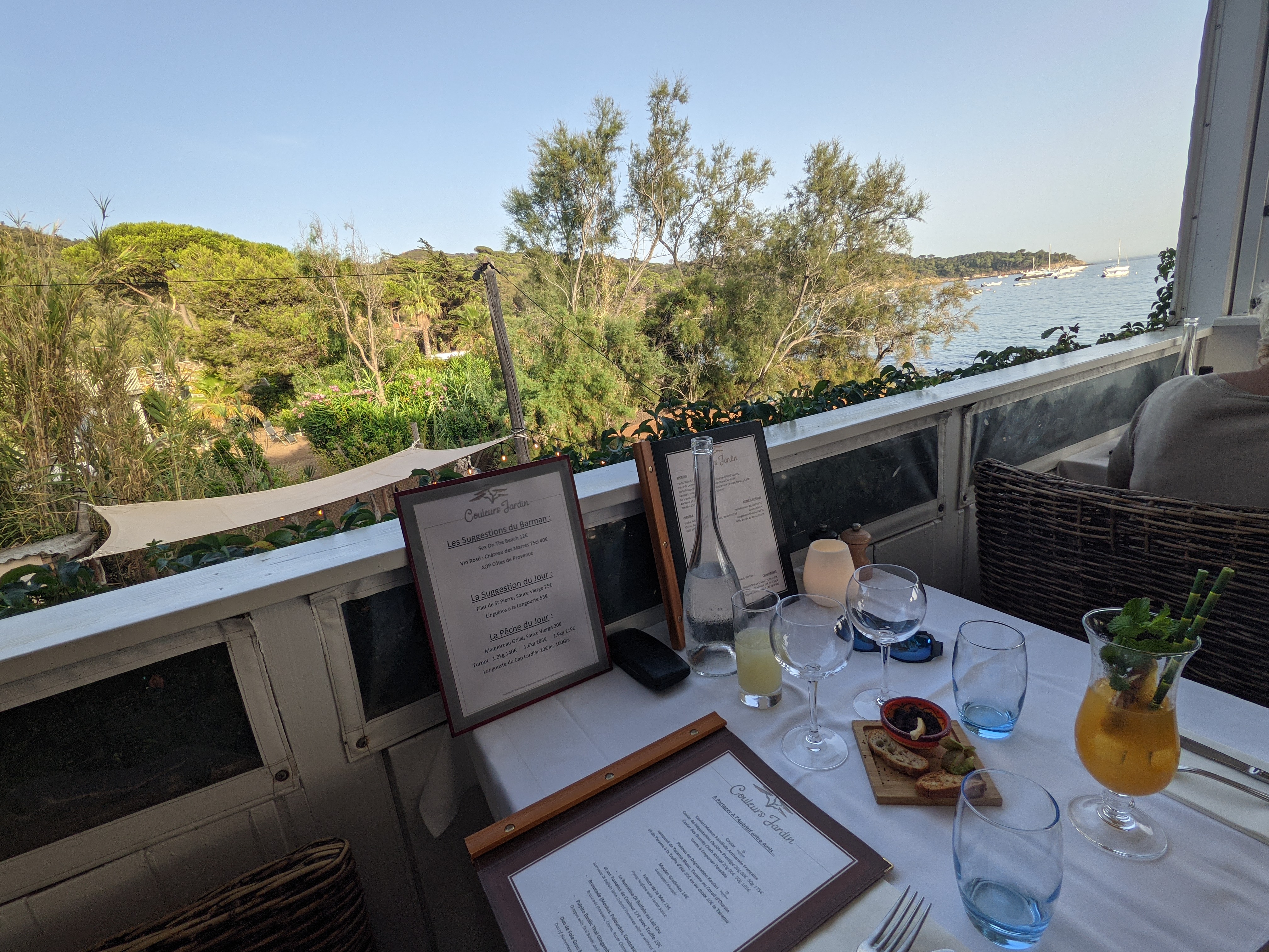 Terrasse ombragée baignée de lumière et de l'air du large... la Méditerranée danse sous nos yeux... le Chef nous régale de sa cuisine fraîche et estivale... un très agréable moment, notamment grâce à la qualité du service : nous avions la sensation d'être en croisière au large des îles d'or !