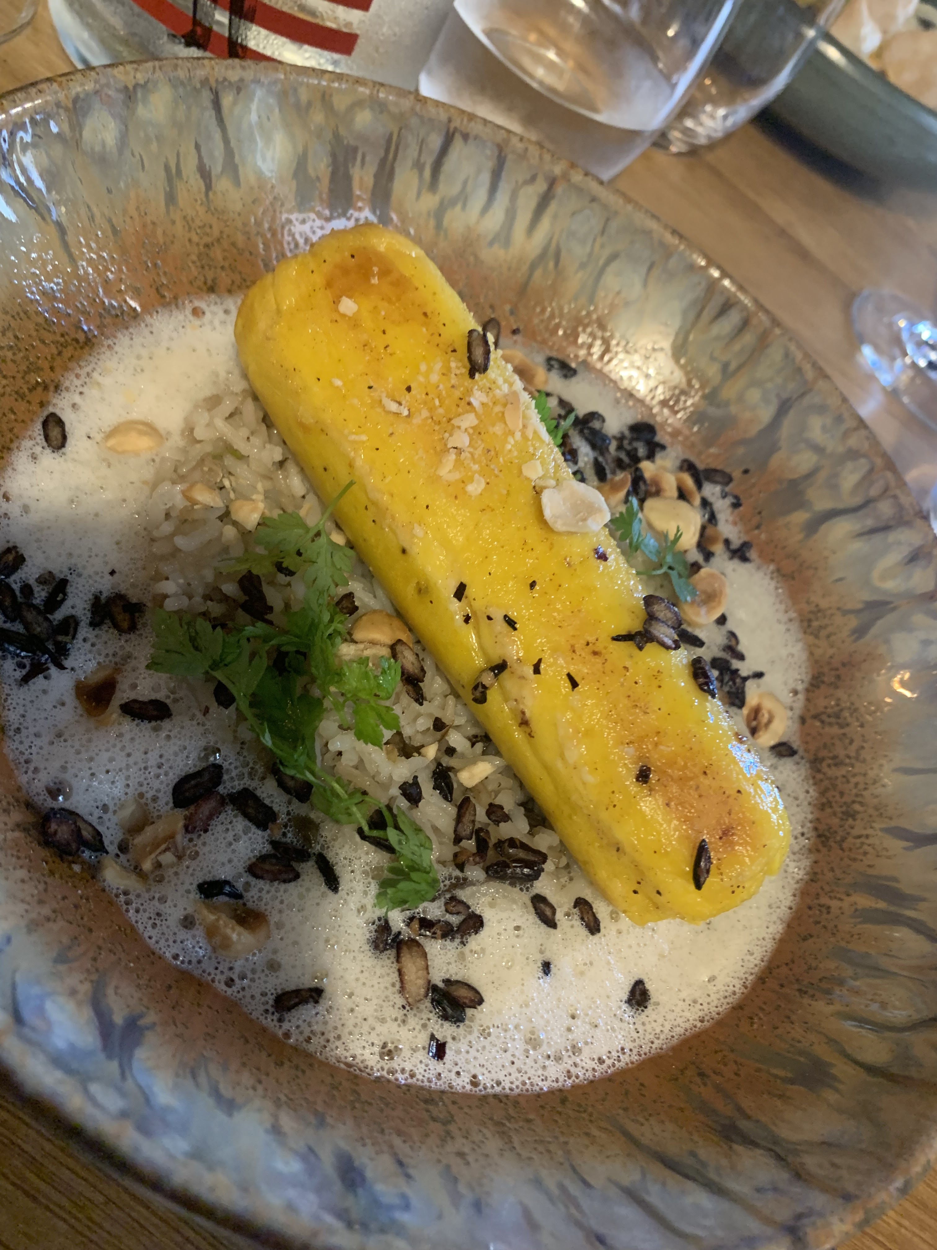 Super petit resto à l'écart de la foule du Vieux Lyon. L'entrée à base d'aubergine était très savoureuse et avec beaucoup de goût. Le tartare de daurade était super frais et très bon également. Le risotto était bon mais petit bémol sur le corn chèvre où on ne sentait pas du tout un goût de fromage de chèvre prononcé... Le dessert était bien mais manque de goût au niveau de la noix de coco. Par contre le biscuit avait très bon goût. La terrasse est top et le personnel super sympathique.