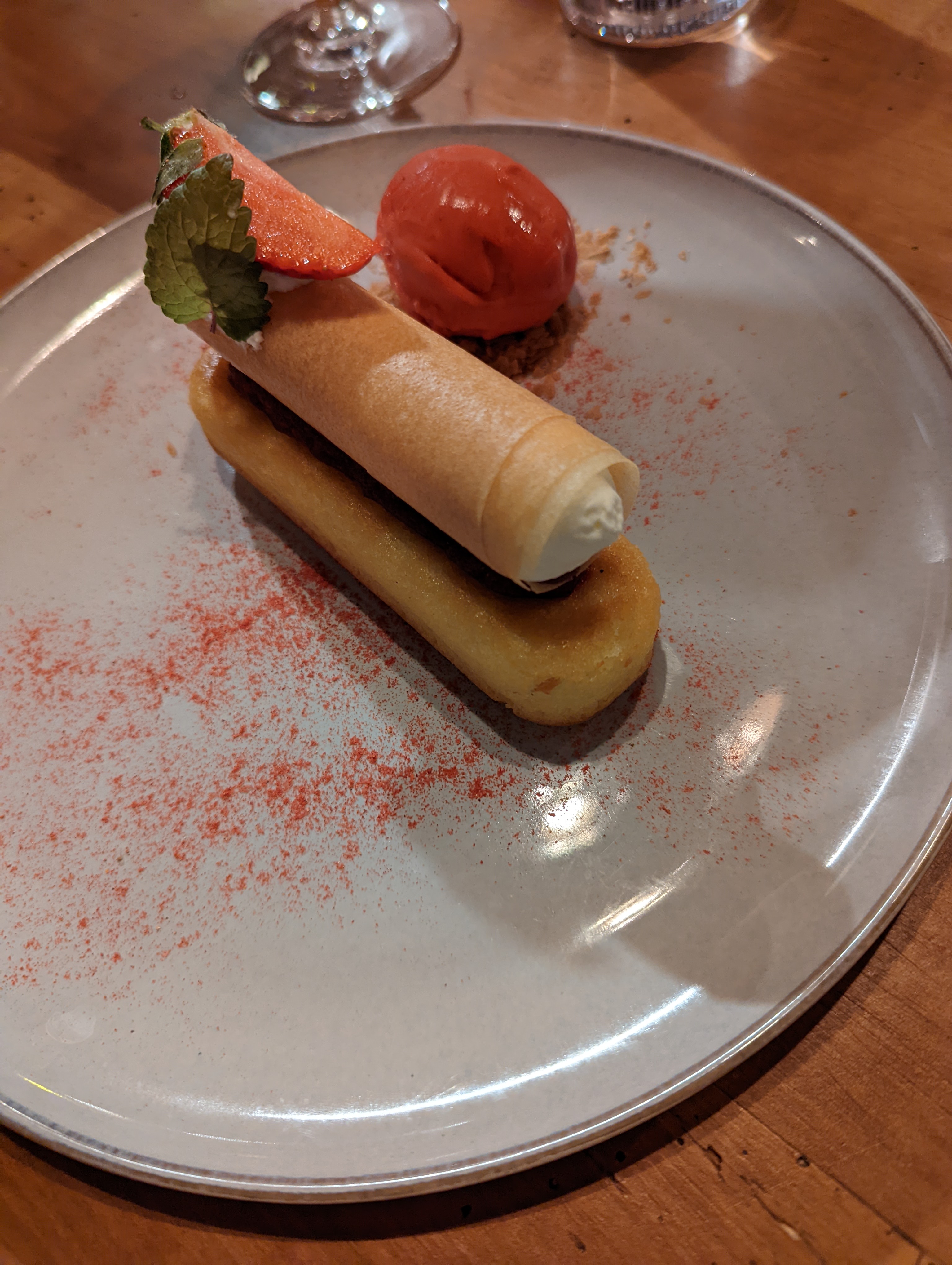 On a bien mangé, l'expérience a été très plaisante. On sent qu'il y a un vrai cuisinier et un vrai pâtissier dans la cuisine pour faire des desserts maison. La présentation est raffinée, le menu qualité prix on est conquis. L'entrée tout végétal avec la gaufre salé était une très belle surprises. Quand au plat pour ma part qui était le poisson, je pense que cela manquait un peu d'audace sur les saveurs par rapport aux intitulés. Une belle adresse que je recommande. Merci pour cette bonne soirée