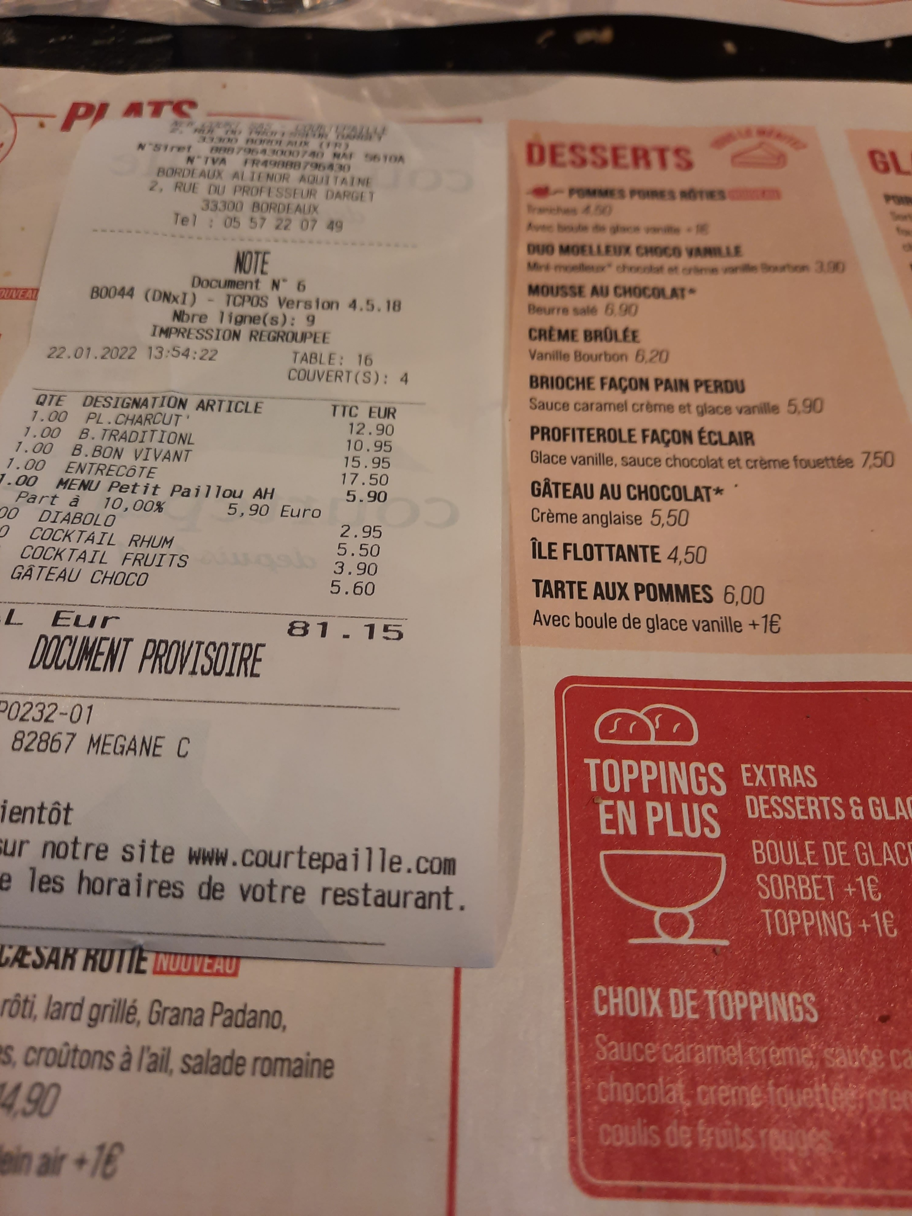 Plus de 28 minutes entre les plats service désastreux pas de suivi . Obligé d'interpeller la serveuse pour des oublis de menus En ce qui concerne la facture on nous a facturé un repas en plus bref. qualité bof Prestation minable . Et au niveau gustatif vraiment pas extraordinaire qualité très très très moyenne..