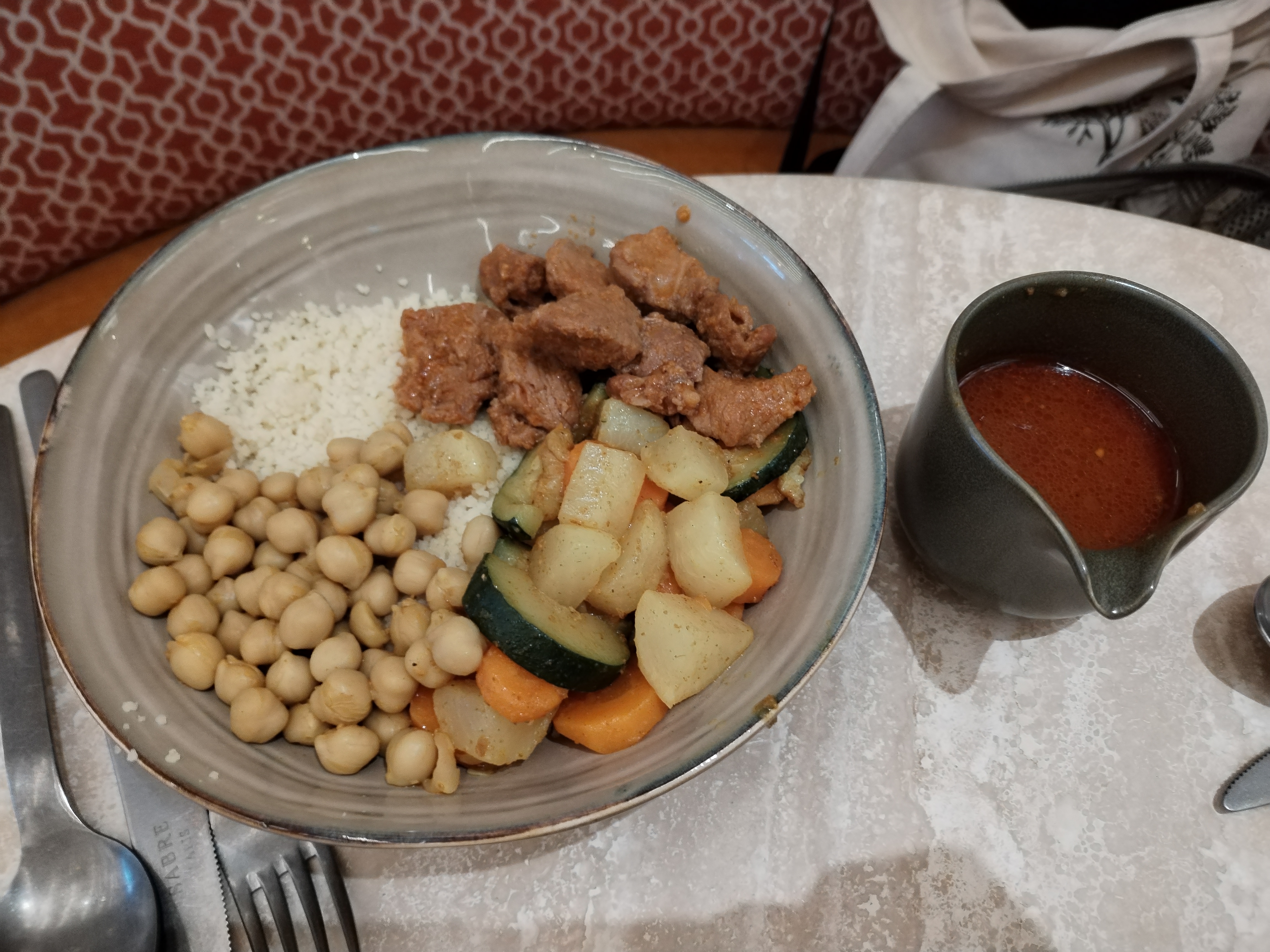 Je suis fan du cadre : une décoration épurée mais chaleureuse avec cette dualité de tons beige et marron foncé. L'endroit respire la propreté et le service est courtois sans être froid, ce qui est très appréciable. Mon couscous (merguez, légumes, pois chiches et semoule) arrive entièrement disposé dans une assiette creuse, accompagné du bouillon servi dans un petit contenant. C'est assez inhabituel. À la dégustation , je suis un peu déçu : l'ensemble semble manquer de goût, de caractère. À cela s'ajoute le format de la graine de semoule : un format moyen que je trouve bourratif, ma préférence étant nettement pour une semoule fine. En somme, une expérience gustative très mitigée.