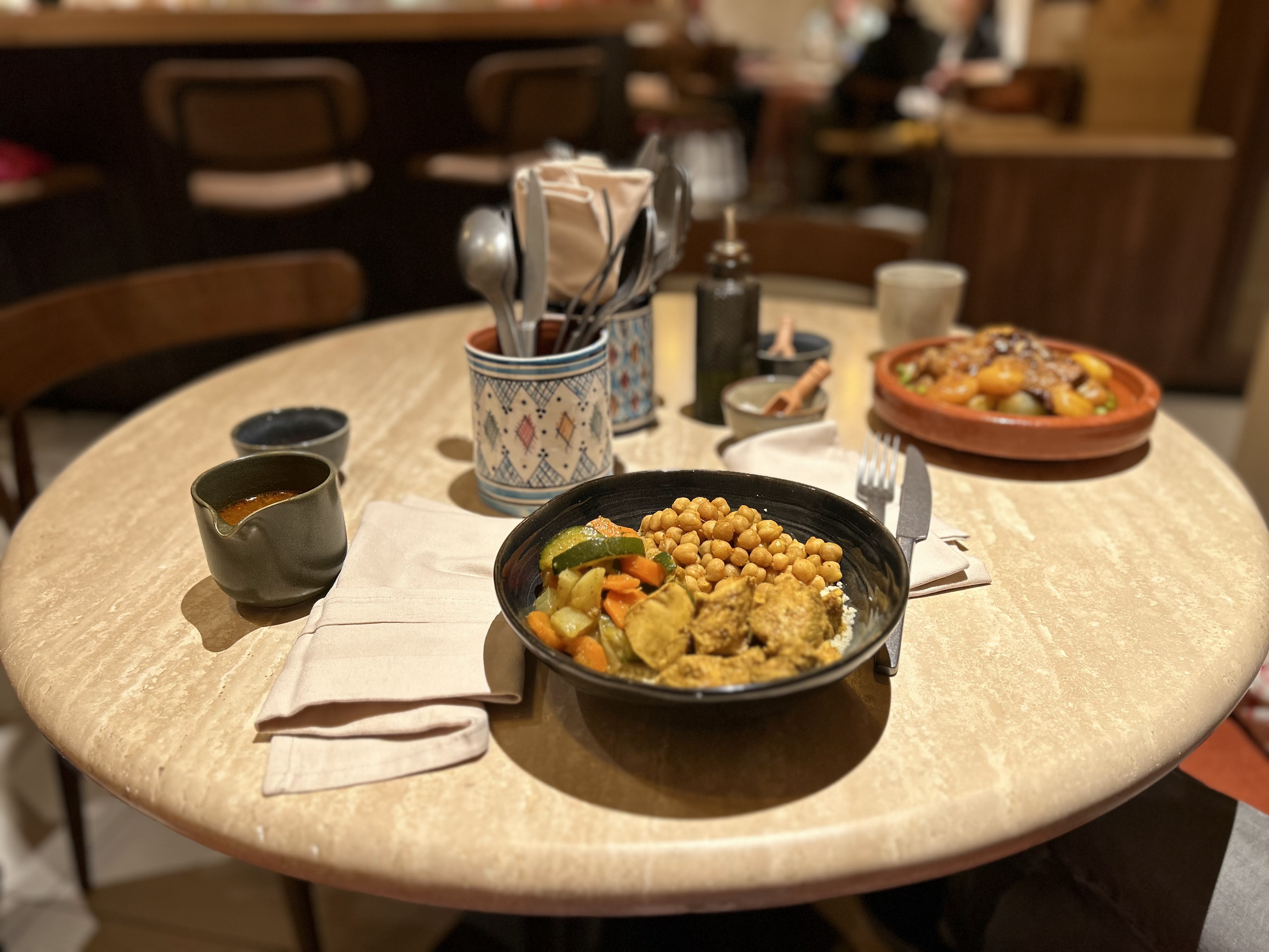 Récemment ouvert nous avons été très bien accueillis le personnel est au top. Très belle décoration avec un joli four et de très belles couleurs au ton du Maghreb. Le dépaysement est total. Très bon hoummous et tajine kefta Le couscous bon dans l ensemble.