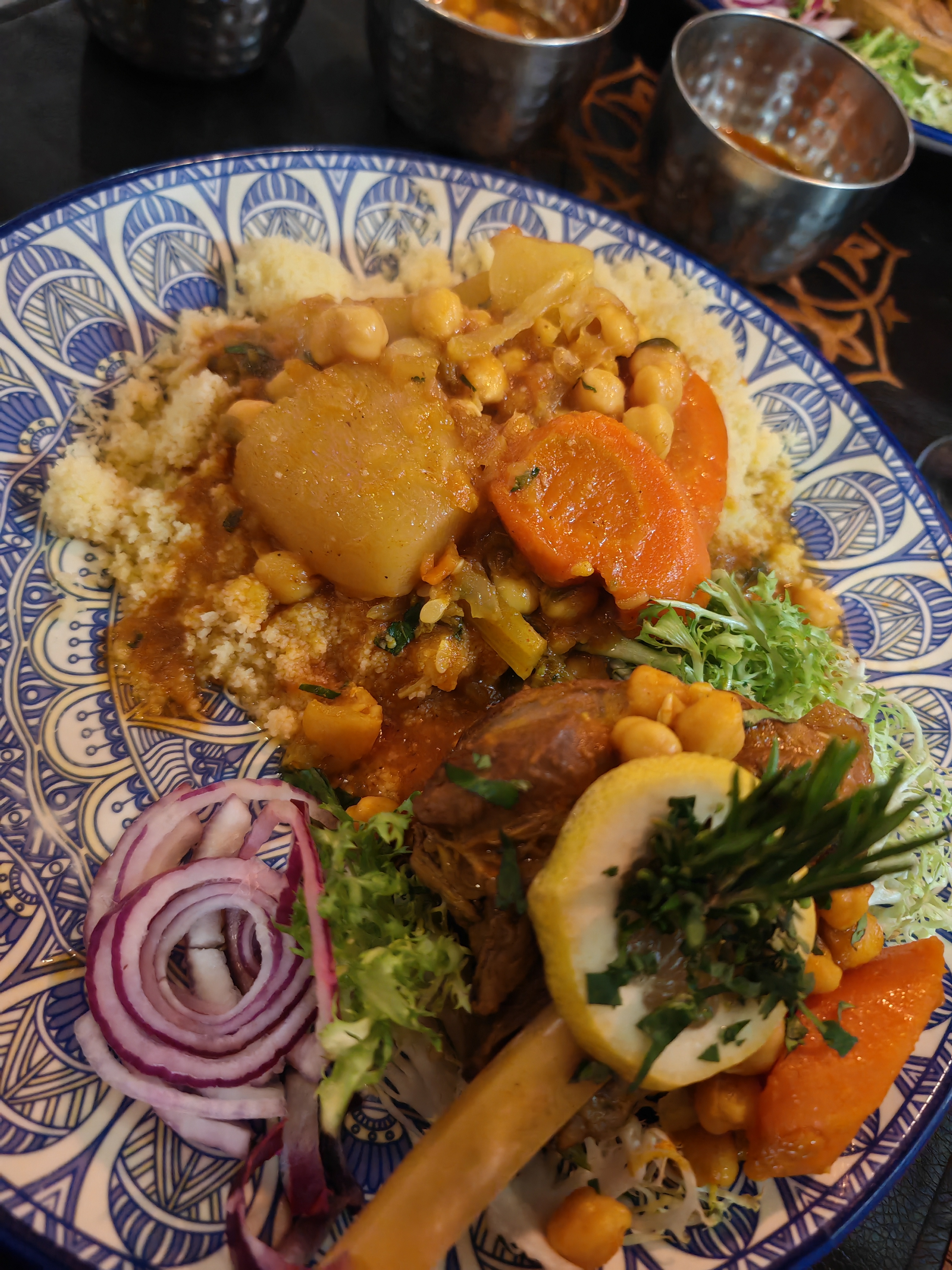 Un endroit chaleureux et acceuillant. Le cadre typique oriental. Le couscous excellent, pas gras et savoureux. La viande d'une grande qualité, les portions plus que honnêtes. Les desserts bien présentés et un goût à se damner. Je recommande vivement cet endroit sans modération.