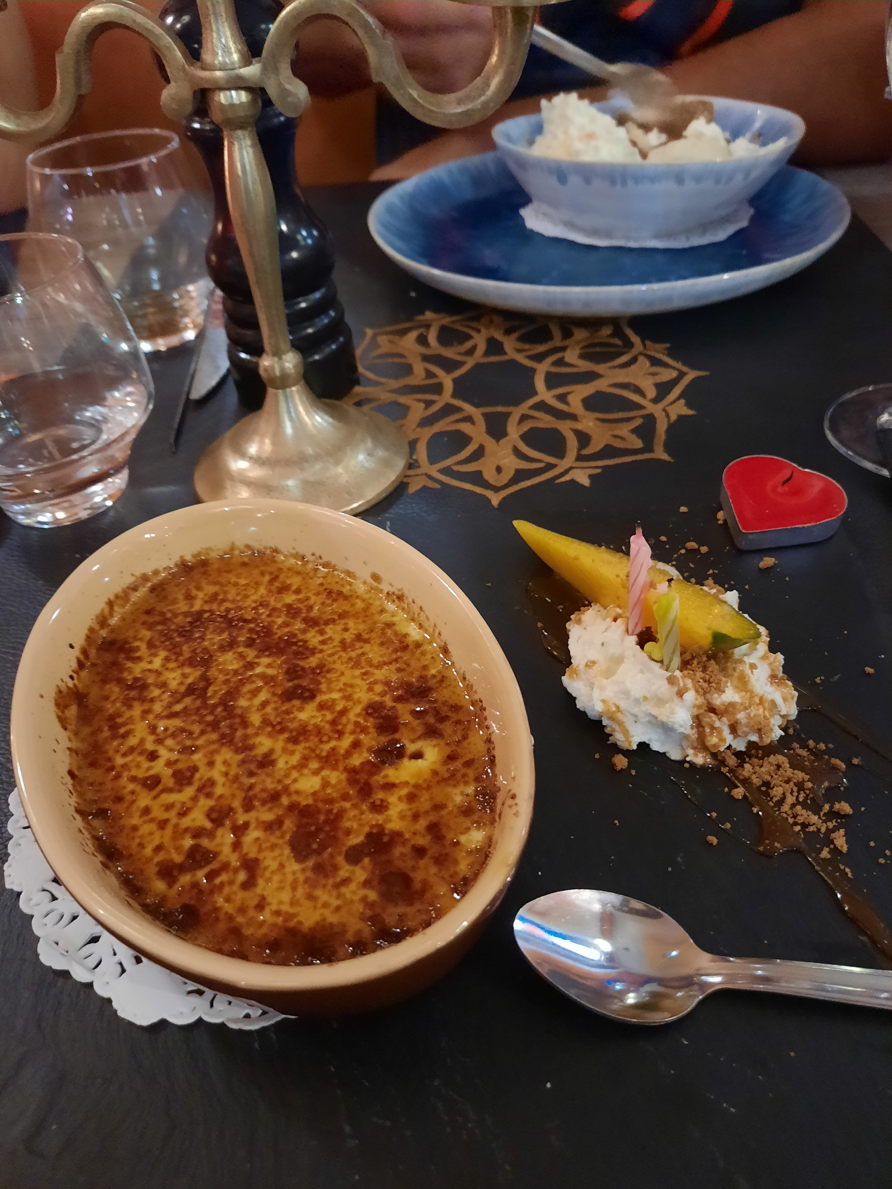Nous avons passé une soirée d'anniversaire dans ce restaurant et, à notre arrivée, nous avons appris que c'était également l'anniversaire du restaurant. Un menu spécial à 50 euros par personne était imposé pour l'occasion. Premier point à améliorer : la mise en bouche était déjà sur la table à notre arrivée, ce qui n'est pas très hygiénique mais passons... Ensuite, le serveur nous a informé que tous les plats seraient préparés à la minute, car un critique gastronomique était présent ce soir-là (est-ce à dire que ce n'est pas le cas en temps normal ?). Il nous a également proposé un vin qu'il a présenté comme abordable sans préciser le prix, qui s'est avéré être de 37 euros pour une bouteille vendue 8 euros en magasin. Les entrées ont été servies sans problème, puis un spectacle de danse a commencé. Les plats principaux (brochettes d'agneau et couscous) ont été servis sans couverts pendant que le serveur filmait les danseuses. Les brochettes étaient correctes mais comportaient beaucoup de gras et n'étaient pas les meilleures que nous ayons goûtées. Par contre la semoule et le bouillon étaient bon. Concernant les desserts, nous avons dû les réclamer à plusieurs reprises. La commande avait été prise mais a dû être repassée, et nous avons attendu longtemps. Les enfants se sont même endormis, peut-etre pas plus mal car leurs glaces ne sont jamais arrivées au final... Les tiramisus aux spéculoos ressemblaient davantage à des mousses qu'à des tiramisus, de plus certaines etaient liquide...mais après 4 heures passées au restaurant, nous voulions juste partir. Pour obtenir l'addition, nous avons dû la demander plusieurs fois. Heureusement, une serveuse très sympathique et prévenante a pallié les manquements de son collègue. Merci à elle ! Un conseil pour le restaurant : quand un critique gastronomique vient manger chez vous, n'oubliez pas que les autres personnes présentes sont également des clients. Au final, je donne 3 étoiles, en grande partie grâce à la serveuse qui a pris soin de nous. Sans elle, j'aurais mis seulement 2 étoiles.