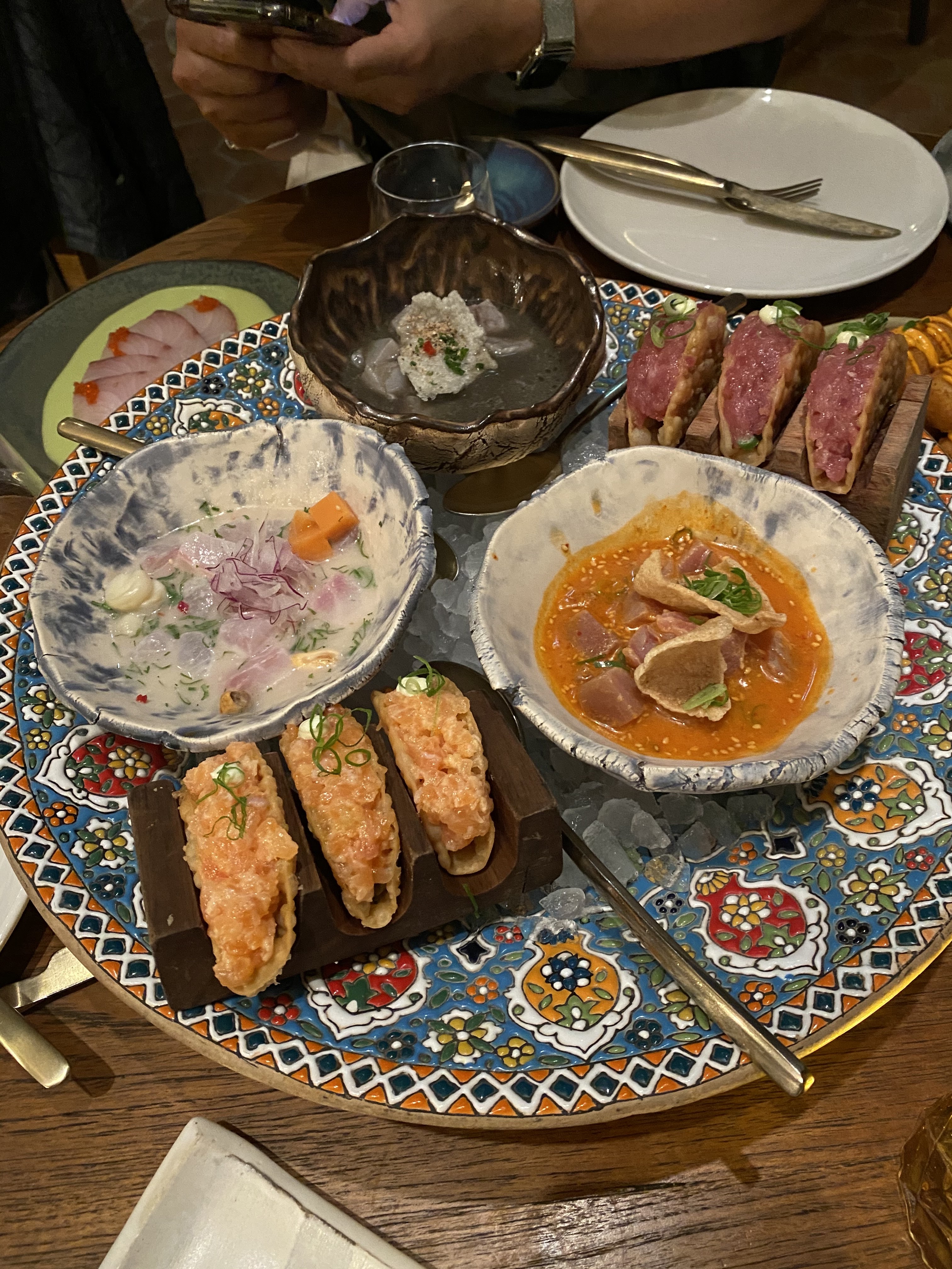 Belle découverte! Une amie et moi adorons les ceviches et nous testons les différents endroits de la capitale ! Nous avions réservés assez longtemps en avance ( endroit très demandé) Nous avons très bien dîner ! Le guacamole est a tomber, le trio de ceviche parfaitement assaisonné !pas les meilleures patatas bravas mais elle restent bonnes. En dessert les churros sont top ! Nous avons été quelques peu refroidie par le service .notre hôtesse avait visiblement hâte de nous voir partir....vu qu on ne commandait pas suffisamment ou selon sa recommandation ( 3 entrées 2plats etc..) si on se lâche on peut vite se retrouver avec une note salée ! Et un peu trop de personne venait touiller notre ceviche ;-). L accueil n en reste pas moins agréable mais un peu trop envahissant. Une très belle adresse, cadre charmant et calme ( pour un mercredi soir) Pensez à réserver en avance !