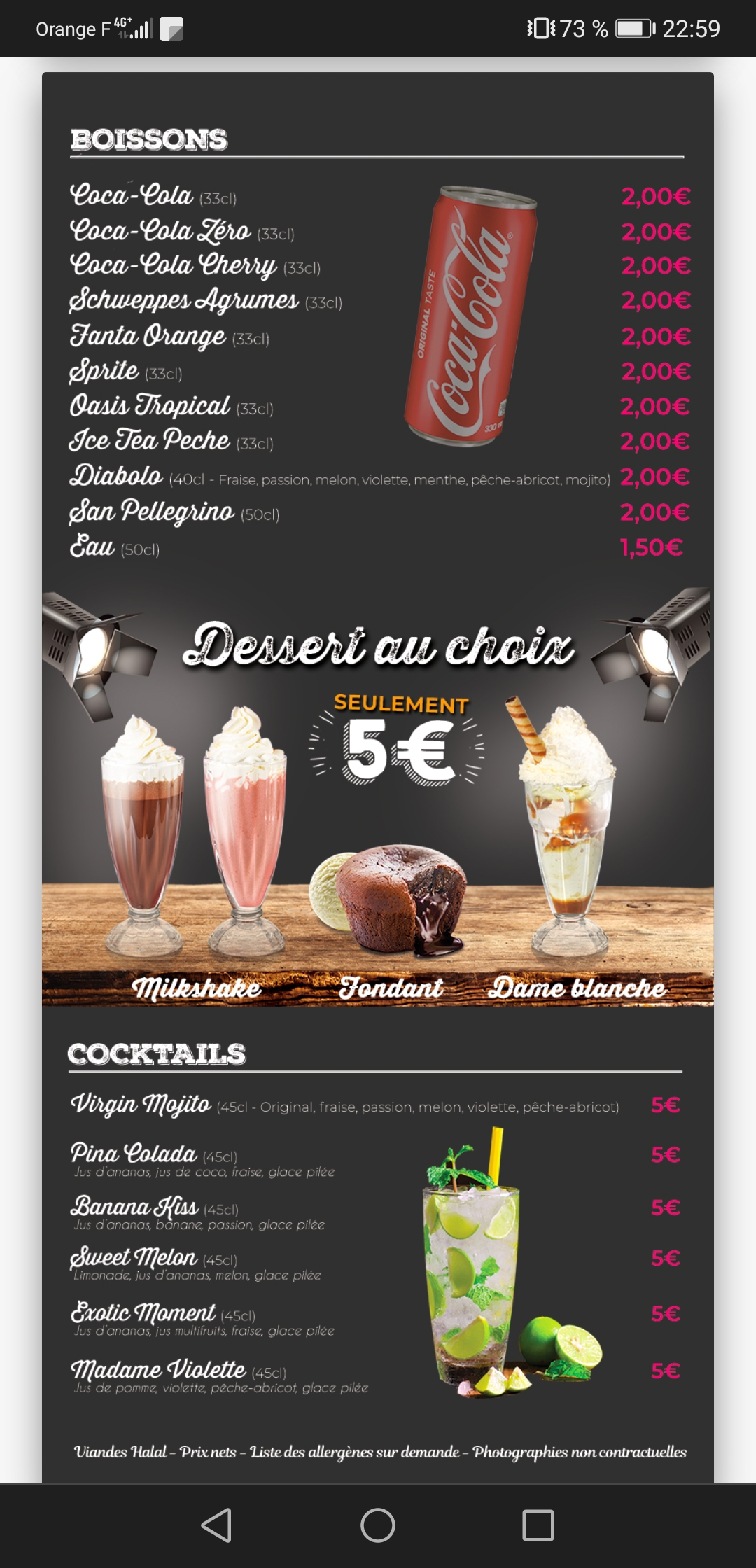 Franchement surcoté je suis pas un haineux je suis parti 2 fois et sa c’est mal passé la 1er fois nous somme arrivé il y avait plus rien pas de choix plus de 15€ pour un burger tout classique et froid. Pas de propositions alternatives de la part du serveur si ce n’est que acquiesce a tout se que je dit Cocktail c’était du jus je sui sorti pour plus de 45€ pour une escalope avec des frite et un burger froid aucun geste commercial rien . J’ai voulu aller une 2eme fois pour pas rester dur un mauvais avis et la le serveur ma reconnu et directement il c’est excusé car qil avait plus rien du tout une fois de plus . Bilan trop cher pour rien surcoté tout sa pour un fromage qui coule servi a table sa vos vraiment pas le coup. Passer votre chemin v’est mieux
