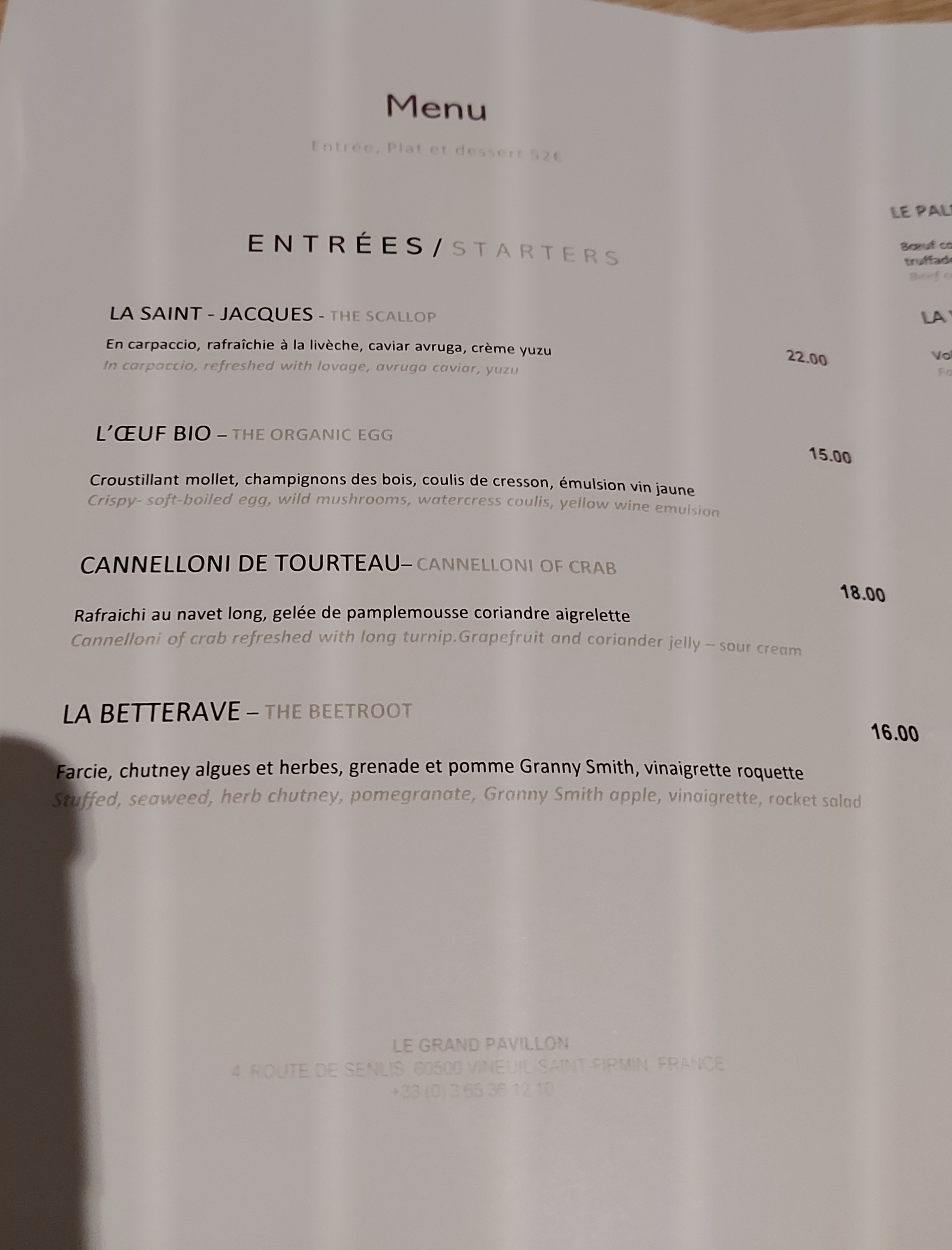 Le menu nous a été présenté très vite nous embrouillant plutot! Nous n'avons pas eu les coupes de champagne pour l'apéritif! mais apportées non frais à la fin du repas. L'oeuf en croute commandé en plat était tiède, sans goût, ni saveur: un peu léger! les frites maison avec le steak tartare étaient desséchées , affreuses ! les desserts, des patisseries bourrées de crème étaient sans goût! les fruits , clémentines, étaient inmangeables! Menu du dimanche pour 49 euros par personne, nous ne recommandons vraiment pas car c'est honteux !