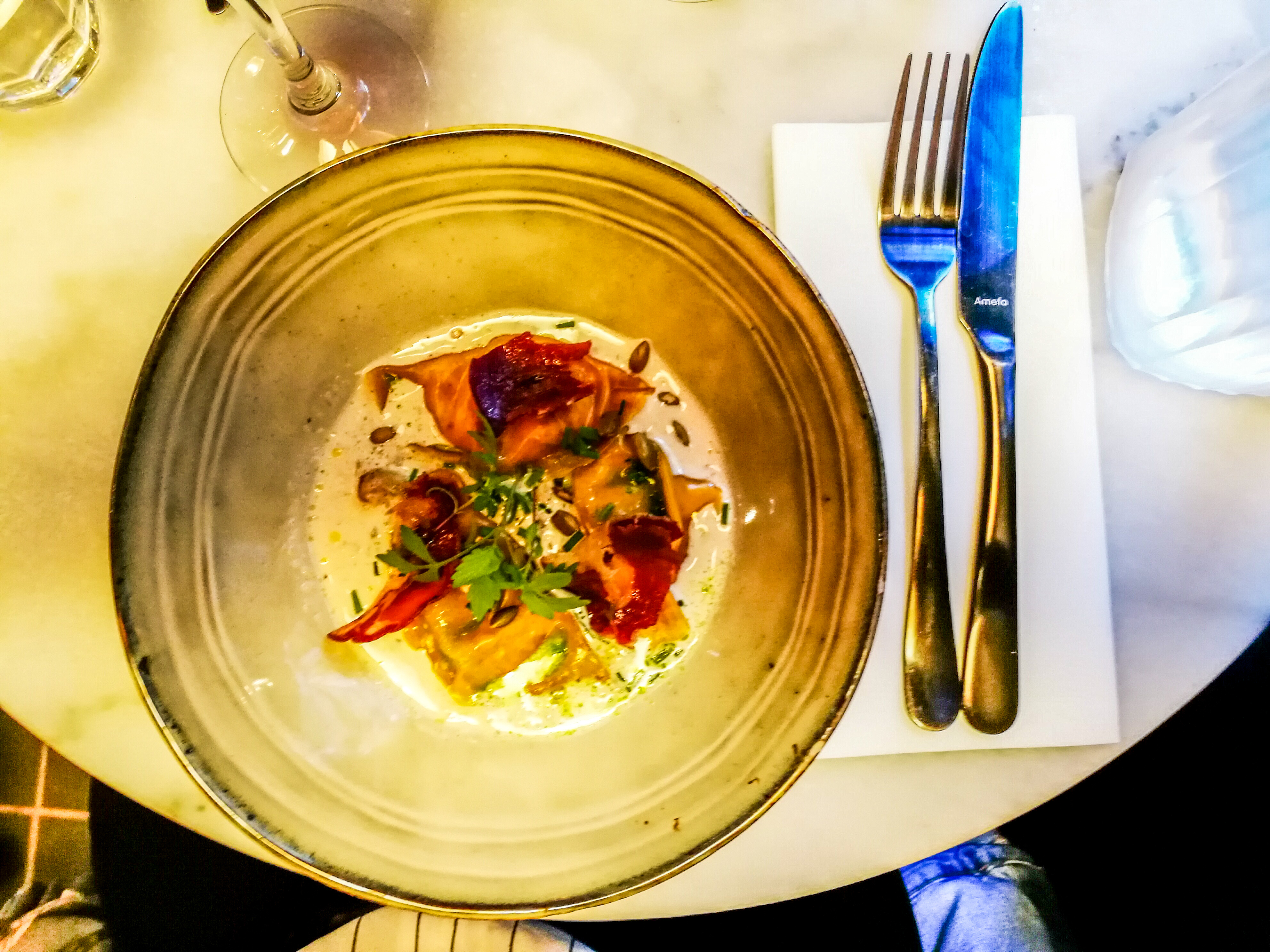 Plats recherchés et bien décorés mais rapport qualité/prix un peu élevé, les ravioles manquaient un peu de goût par exemple mais les entrées sont délicieuses ! Et surtout n’y aller pas à l’avance !