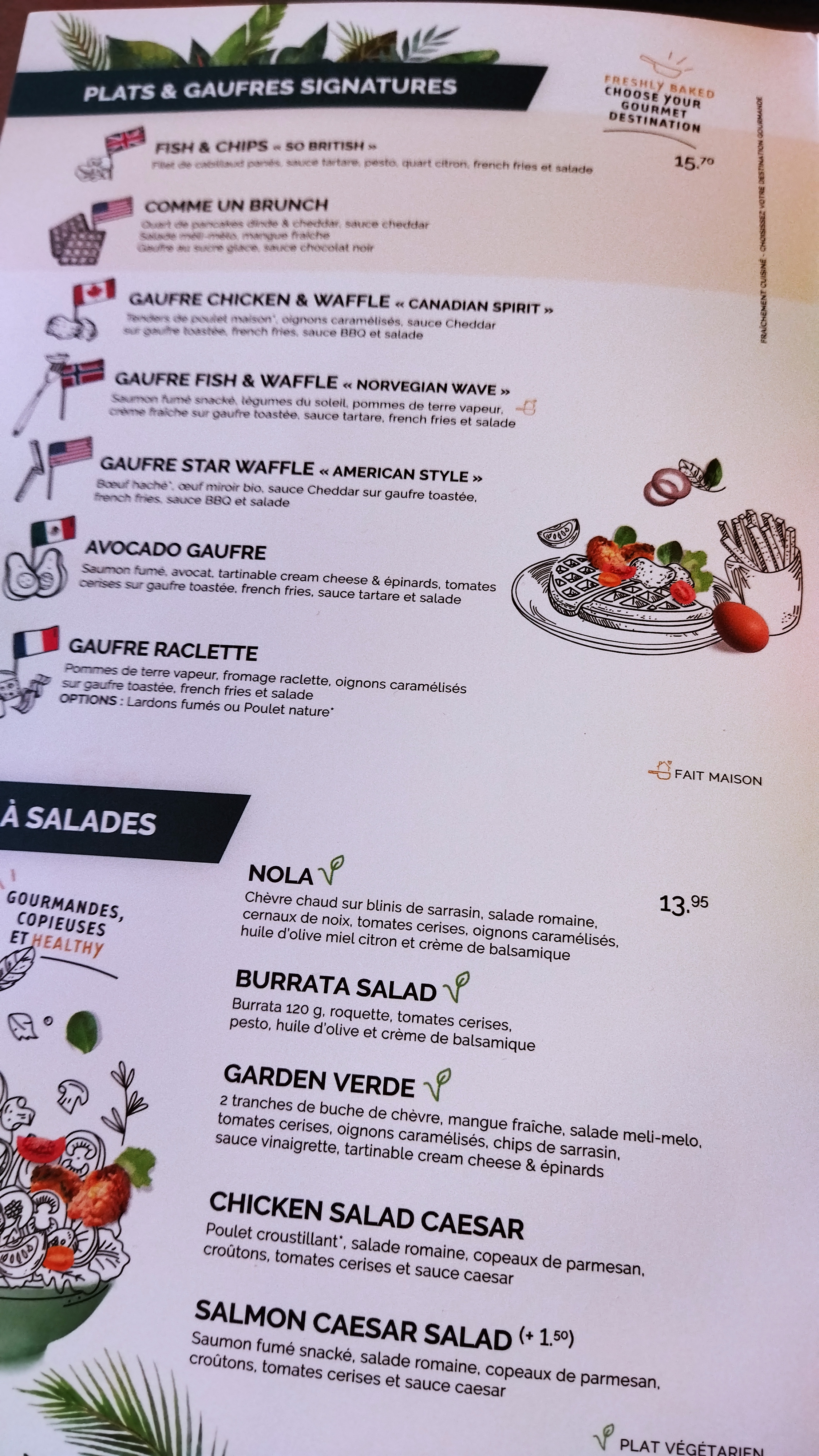 Repas certes tres copieux ( mettre des frites en plus de la gauffre salé...) Mais je trouve que les saveurs ne sont pas là. Ce n était pas mauvais mais plutot insipide Plutôt déçue