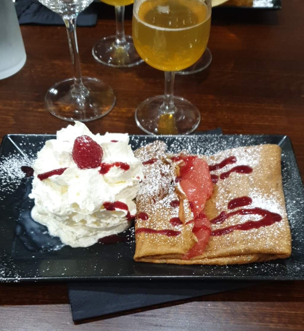 Le cadre est plutôt sympa, en centre ville mais pas directement sur la route. Cidre rosé bon, crêpe Almaty très bonne également (mais boule de glace portée disparue...), chantilly maison à priori. Mais... la serveuse était distraite, il a fallu lui rappeler de nous donner des couverts pour manger les crêpes, puis à 2 reprises, rappel d'une boisson. Sans compter certains cidres de la carte qu'ils n'avaient pas/plus, glace vanille en rupture - ok pour café mais du coup, absente lorsque crêpe servie... Bref un moment sympathique mais malheureusement déception sur le service. A refaire peut-être quand il y aurait moins de monde...