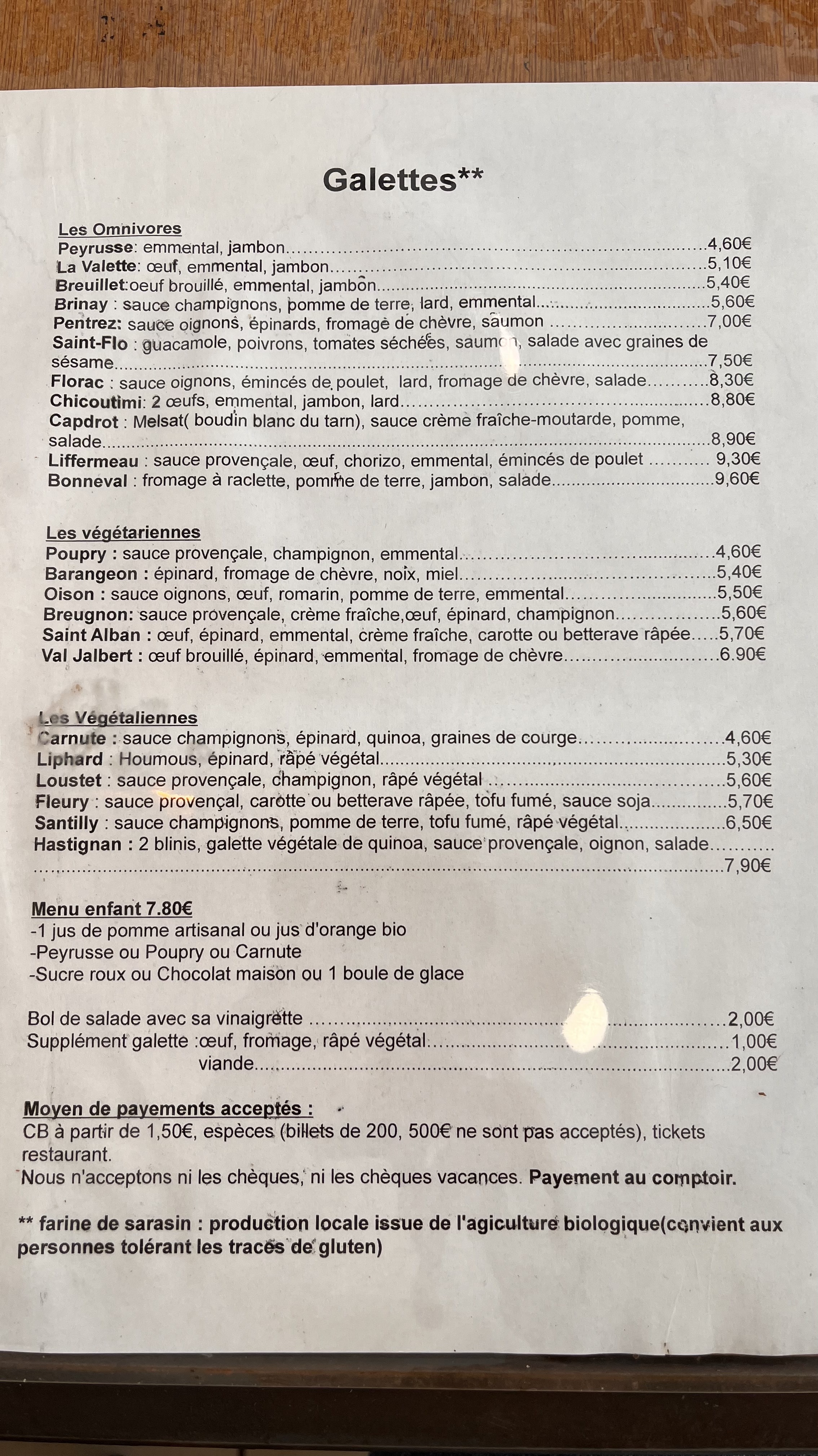 Petite crêperie super bonne, réserver avant de venir car que 12 places. Apéritif, galette, dessert pour 2 personnes et que 43.60€. accueil sympa aussi.