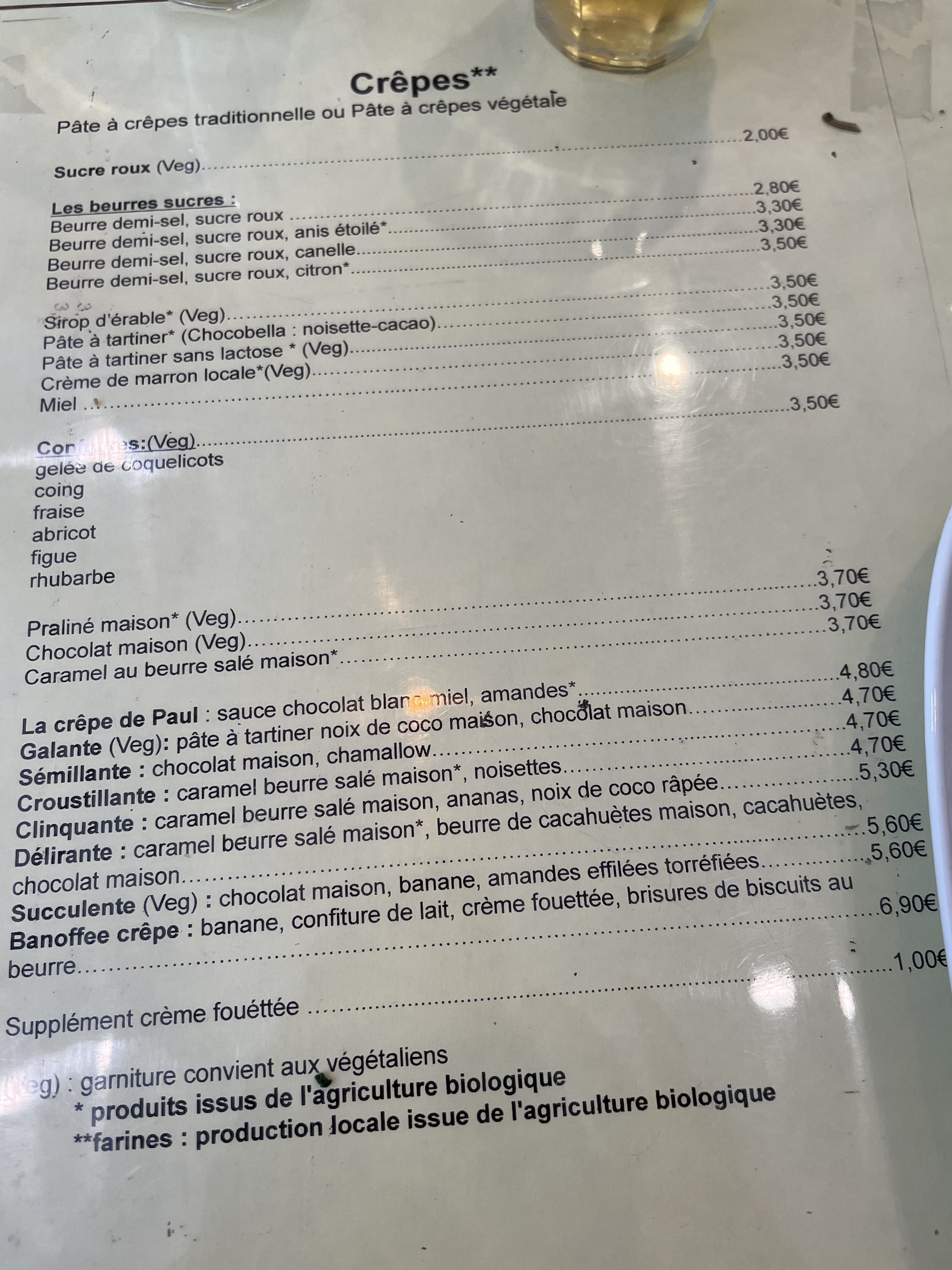 Le crêpier est fort sympathique, j'ai mangé une mezidon fort goûtue mais j'ai regreté de ne pas tester les spécialités végétariennes et veganes. Les glaces valent vraiment le détour.