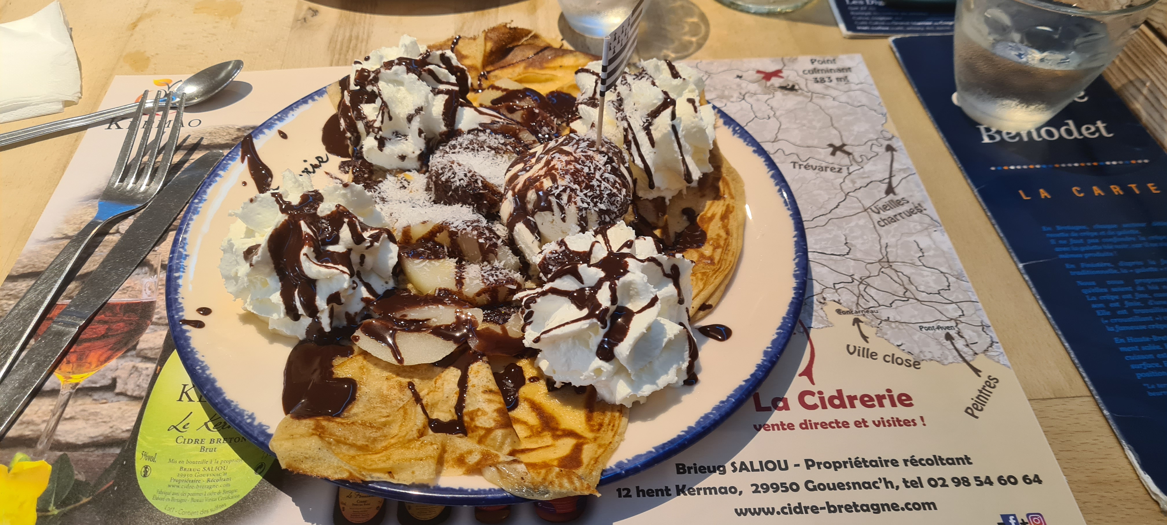 Nous n'avions pas pu y manger le midi car à 11h50 c'était déjà complet 🧐 Nous avons retenter notre chance le soir, c'était vraiment très très bon, le kir breton est au top, (crêpe gambas) la benodetoise, l'hermine (camembert lard oeuf) et en dessert la brocéliande et la poire belle Hélène..tout était excellent 👌 Merci encore!