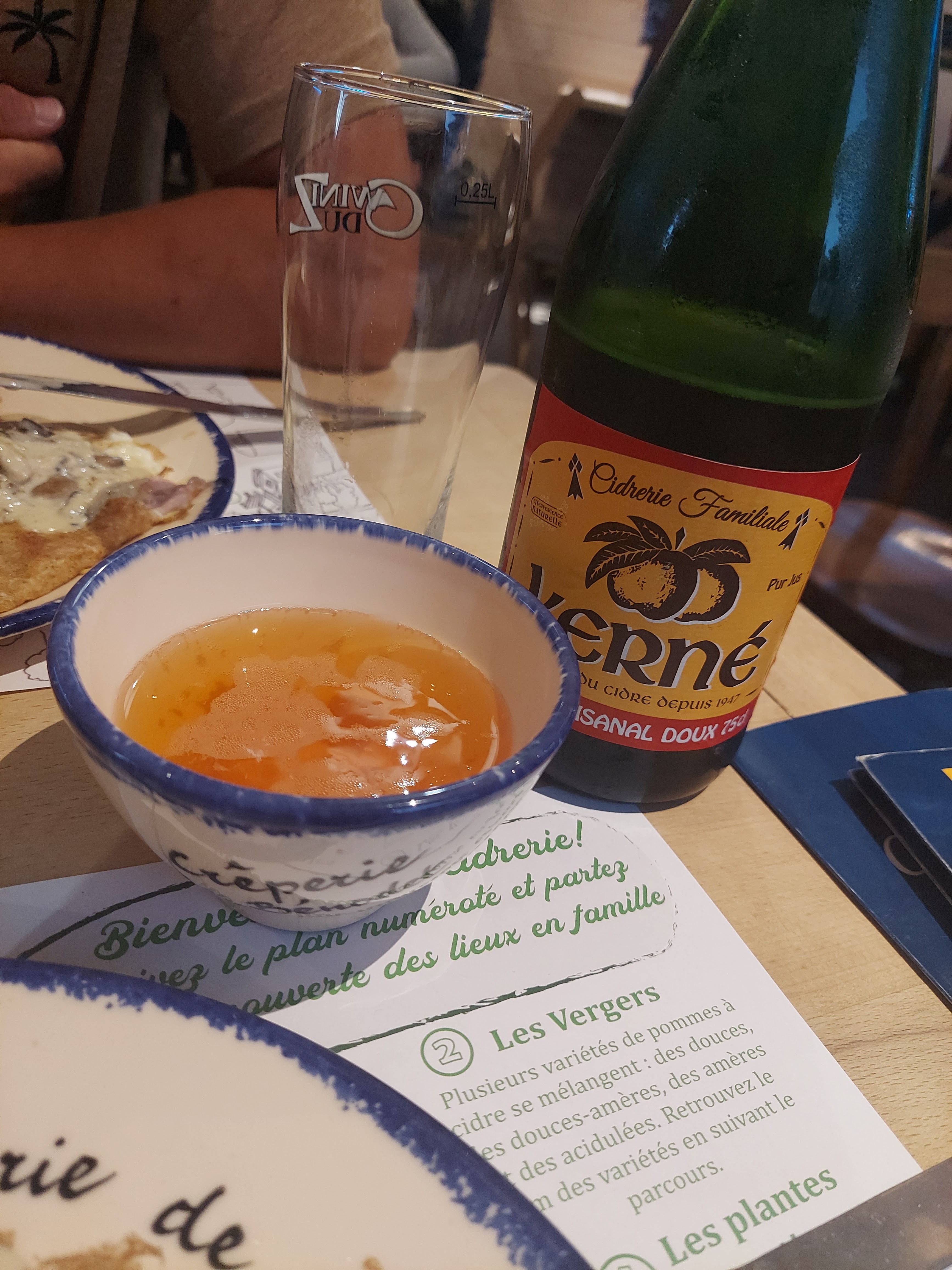 Pause déjeuner ce jour avec en appéro, le cidre KERNE conseillé et très apprécié 👍🏻 ainsi qu’une bonne bière locale SANT ERWANN. Ensuite nous avons pris une galette Andouille fromage et une saucisse fromage, un vrai régal !! Et l’apothéose au dessert une crêpe Pommes rissolées, caramel fait maison, crème fouettée 😋. Serveur très sympa et addition plus que correcte : 42 euros avec les cafés !!