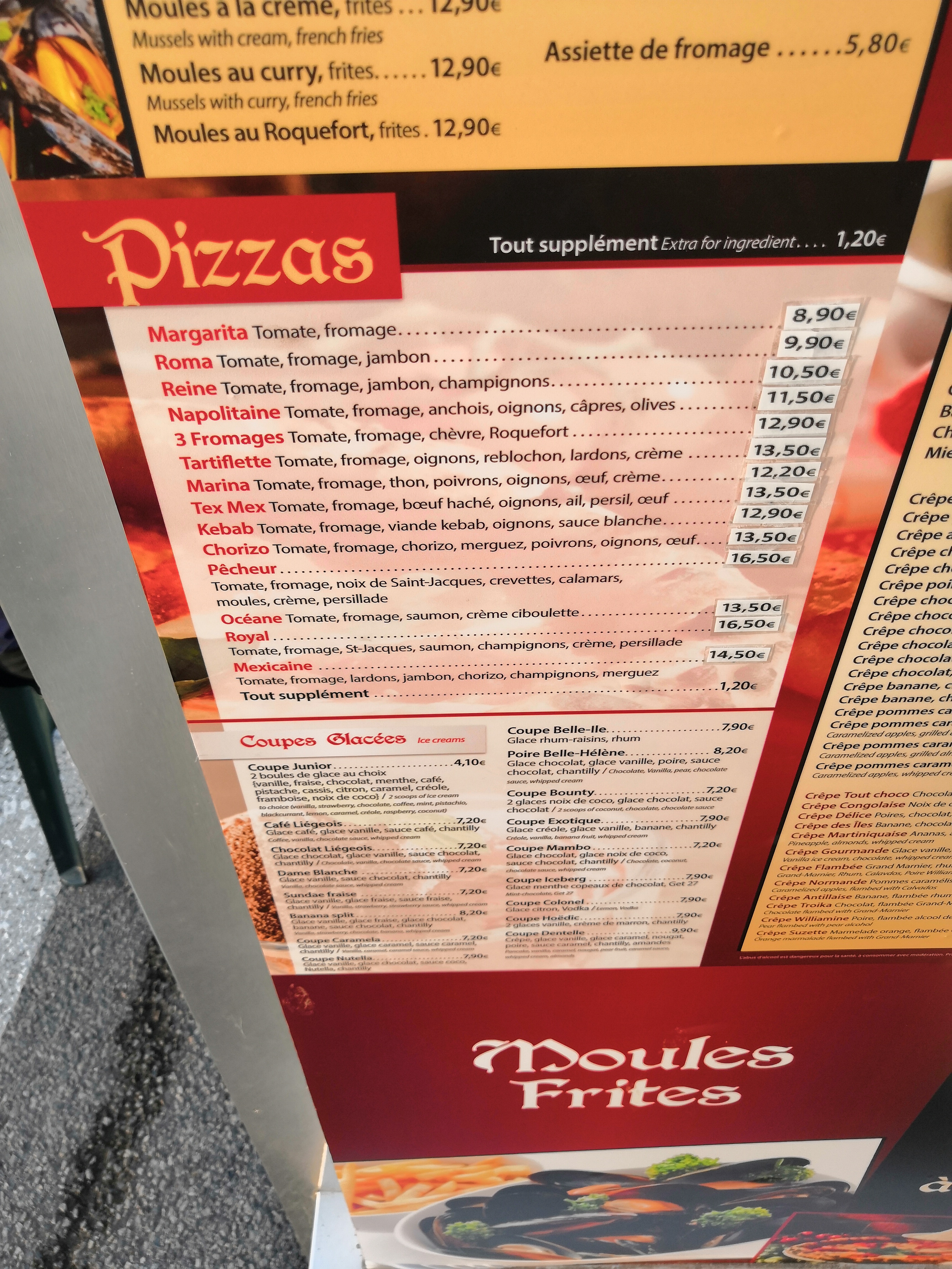 Nous sommes venu 2 jours de suite. Bon acceuil, carte variée, pizza, moule, crêpe, viande, y en a pour tout le monde. Pizza bien copieuse.