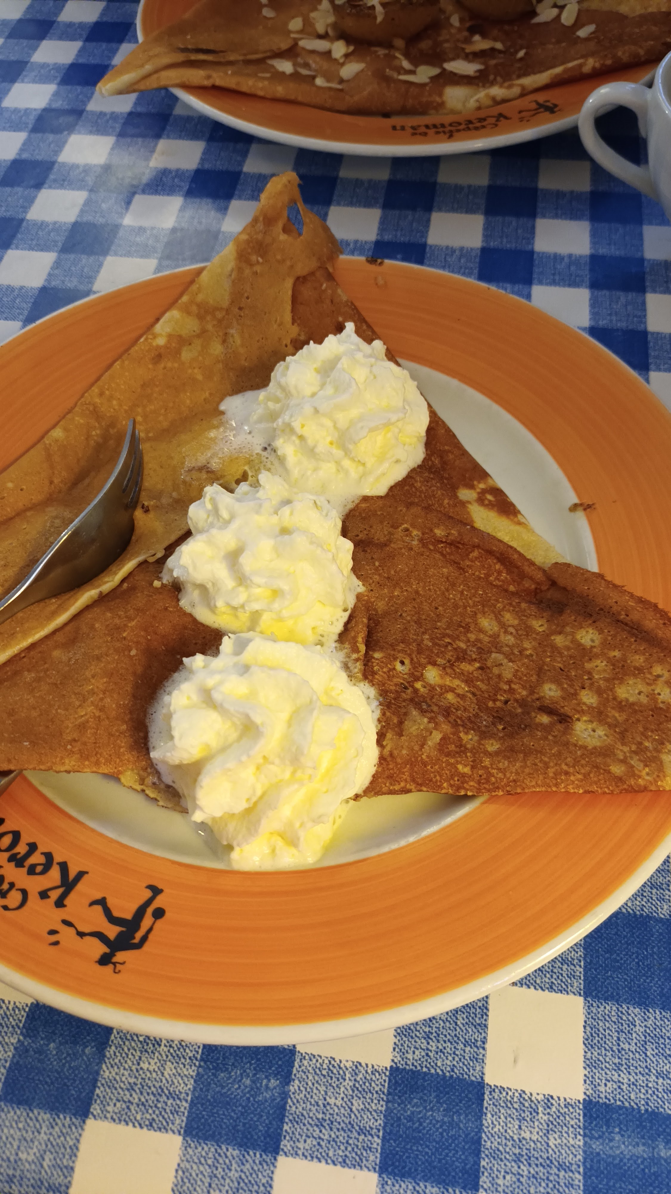 Je suis déçue malgré l'accueil du serveur qui était sympathique. Dans un premier temps nos verres n'étaient pas propre. Trace de doigts et mal lavé. Galette bretonne avec de la crème pas cuite du tout. Une grosse boule de crème fraîche épaisse et froide au goût acide. Salade sortie tout droit du sachet sous vide. C'est vraiment dommage. La crêpe collée à l'assiette. Pour la découpe c'est pas terrible.