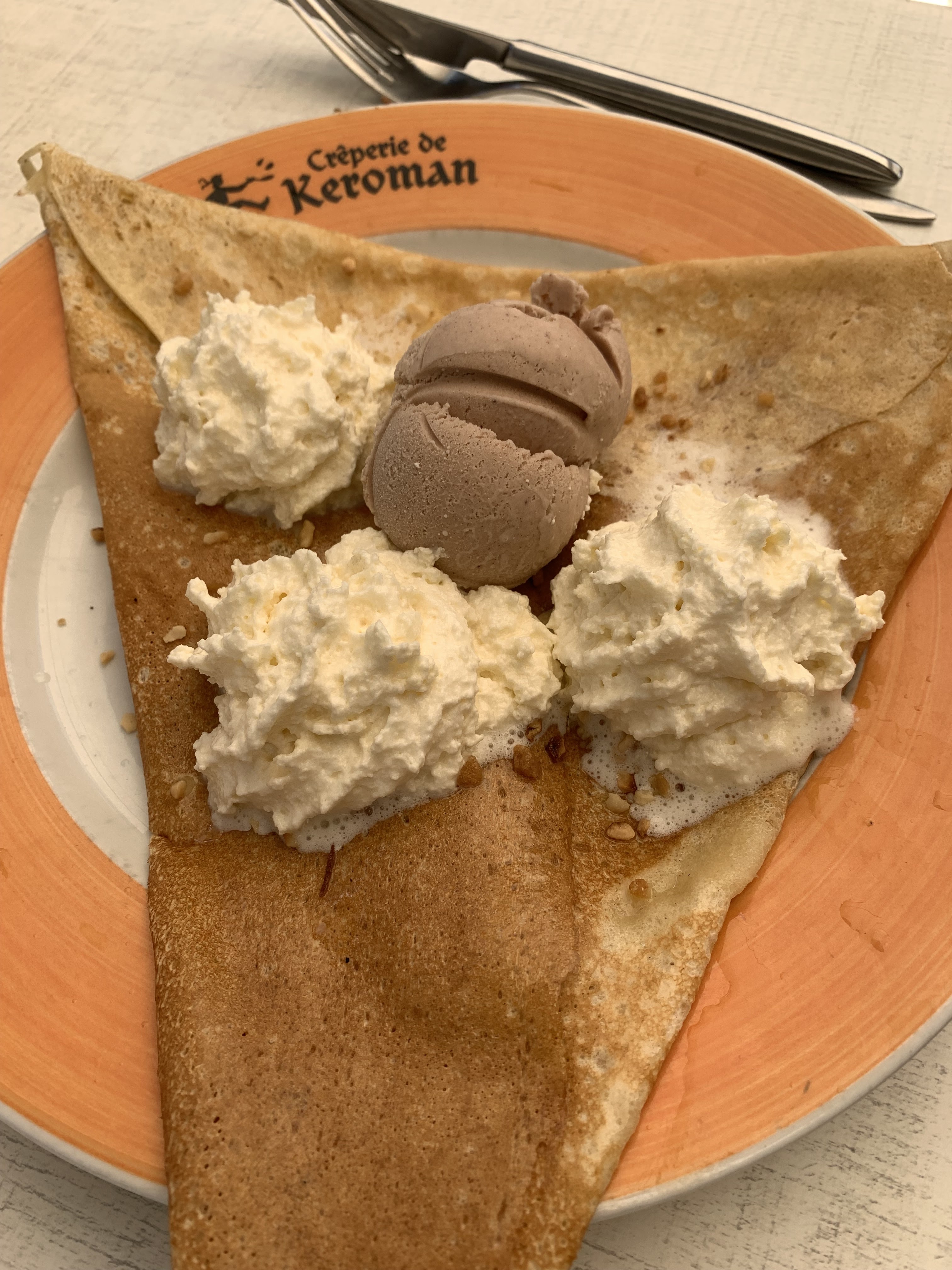 Crêperie Extra-Ordinaire! Vous souhaitez manger sainement avec des produits du terroir et fait maison pour un rapport qualite prix intéressant....il n y a pas à hésiter...c est ICI qu il faut aller. Les serveurs sont très agréables et nous sentons bien qu il y a un bon relationnel dans l équipe...et la cerise sur le gâteau...c est la glace...qui est fait maison....et qui mérite vraiment d être dégustée. La crêperie n a pas l intitulé glacier MAIS elle pourrait l obtenir . Enfin l eau est très bonne. Ce qui n est pas souvent le cas dans les autres restaurants...sans oublier le cadre...qui pour...les bretons des années 80 rappellent de très bons souvenirs d enfance.