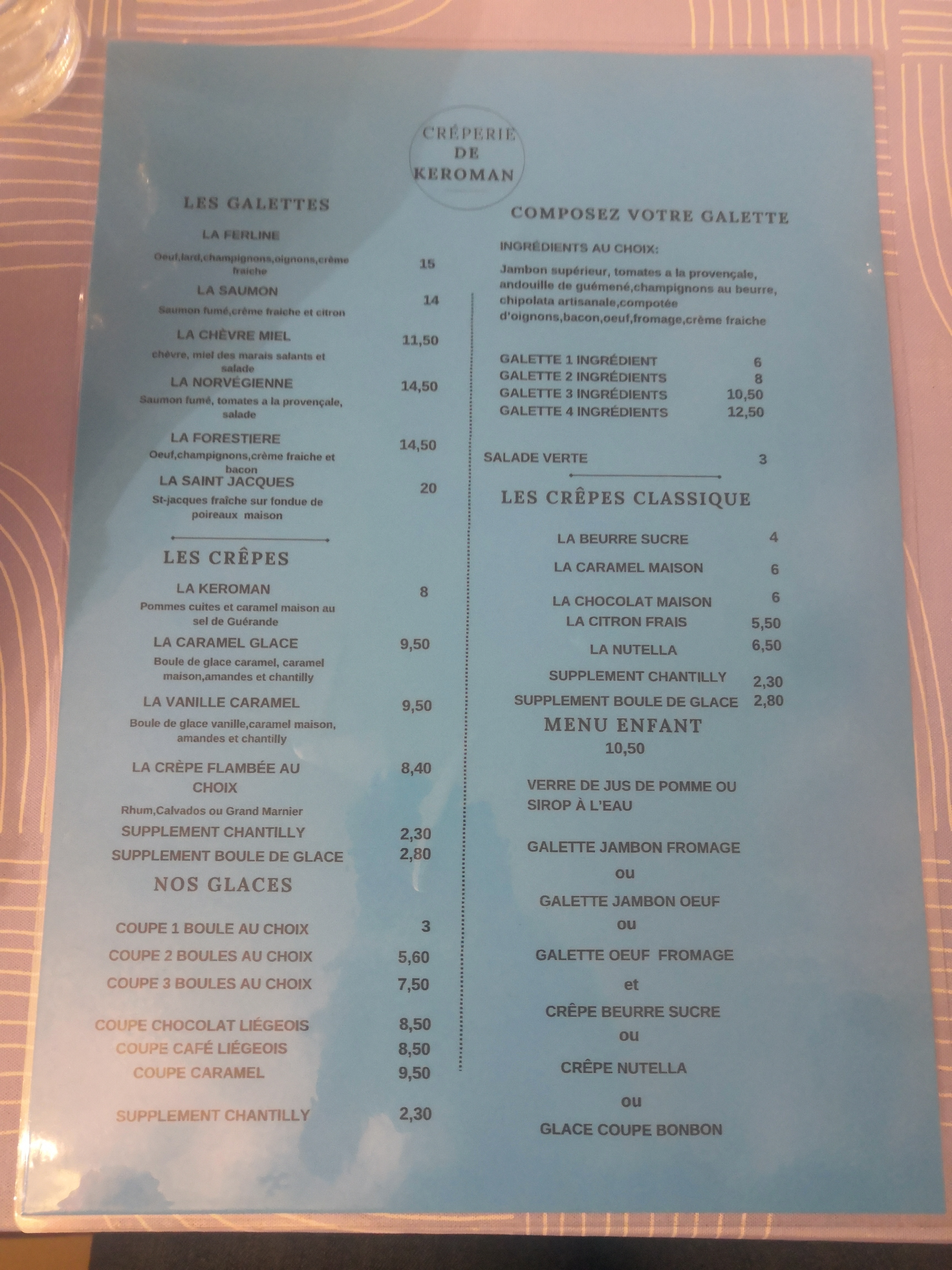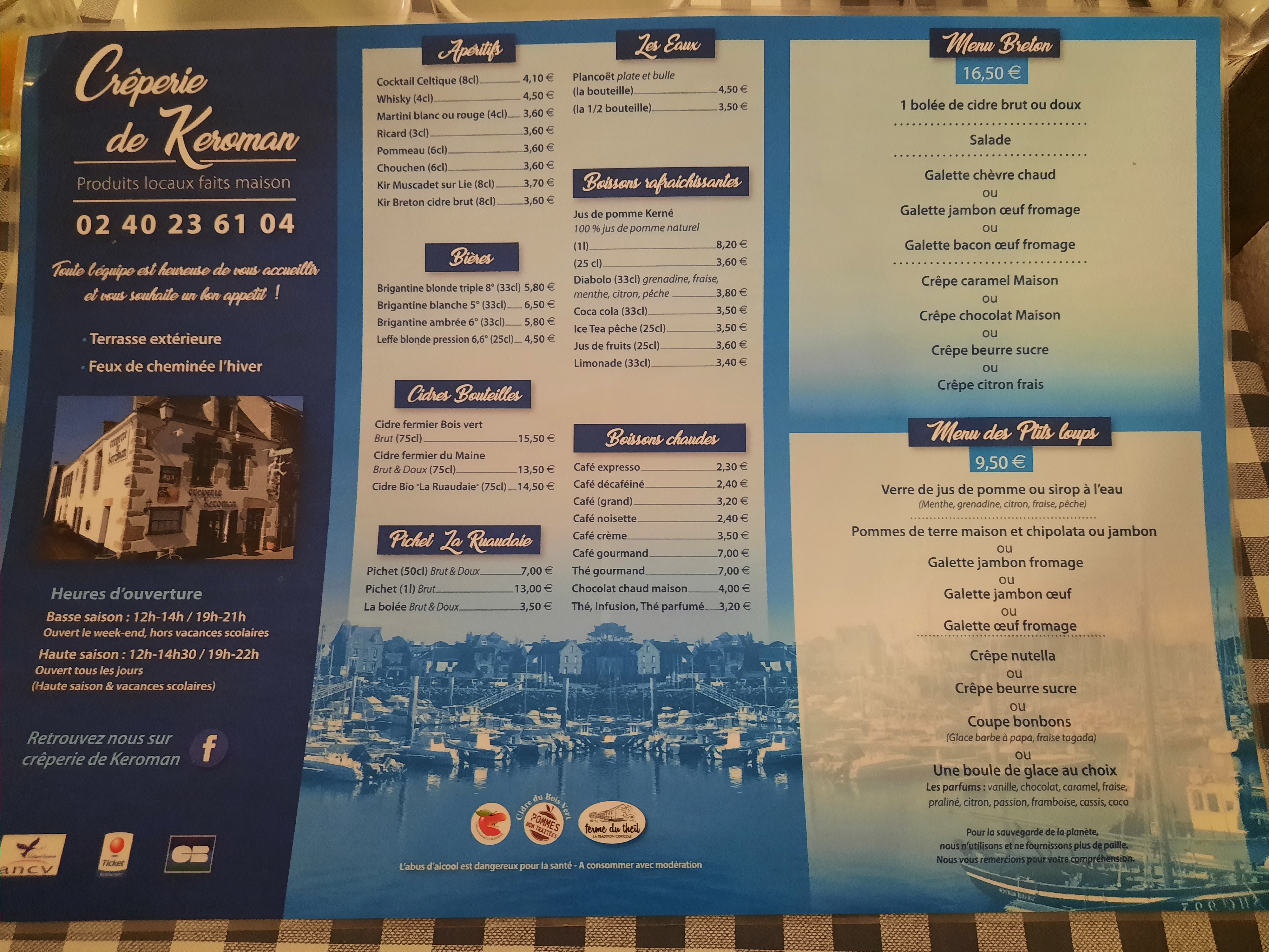 Un moment inoubliable!!!! Hélas pour le côté négatif. Lorsque la patronne vous demande si tout c'est bien passé n'ayez surtout pas l'idée de lui répondre que non, celà va avoir pour effet de la rendre hystérique et sa réponse sera: Monsieur vous êtes ici au Keroman!! Oh là ça rigole pas! mais un peu court comme argument,cela ne change rien au problème nos crêpes sont vraiment pas très bonnes. Galette saint jacques (19 euros) galette banale 3 petites coquilles vraiment juste pour le tarif, crêpe dessert caramel caoutchouteuse pourtant faite a la minute dixit le grand chef 5 étoiles expert en crêpes qui ne supporte que l'on veuille lui apprendre son métier mais qui se permet de faire une remarque sur votre âge et qui ajoute qu'il ne faut pas revenir dans son fameux établissement. Nous sommes d'accord sur ce point, et au vue des commentaires récents apparemment bon nombre de personnes partage mon ressenti. La crêperie Keroman le summum de la crêpe, le palais de la galette (comme semblent le penser les personnes citées) ou banal restaurant pour touristes ??? La réalité est dans l'avis. La réponse au commentaire est du même niveau que l'établissement.