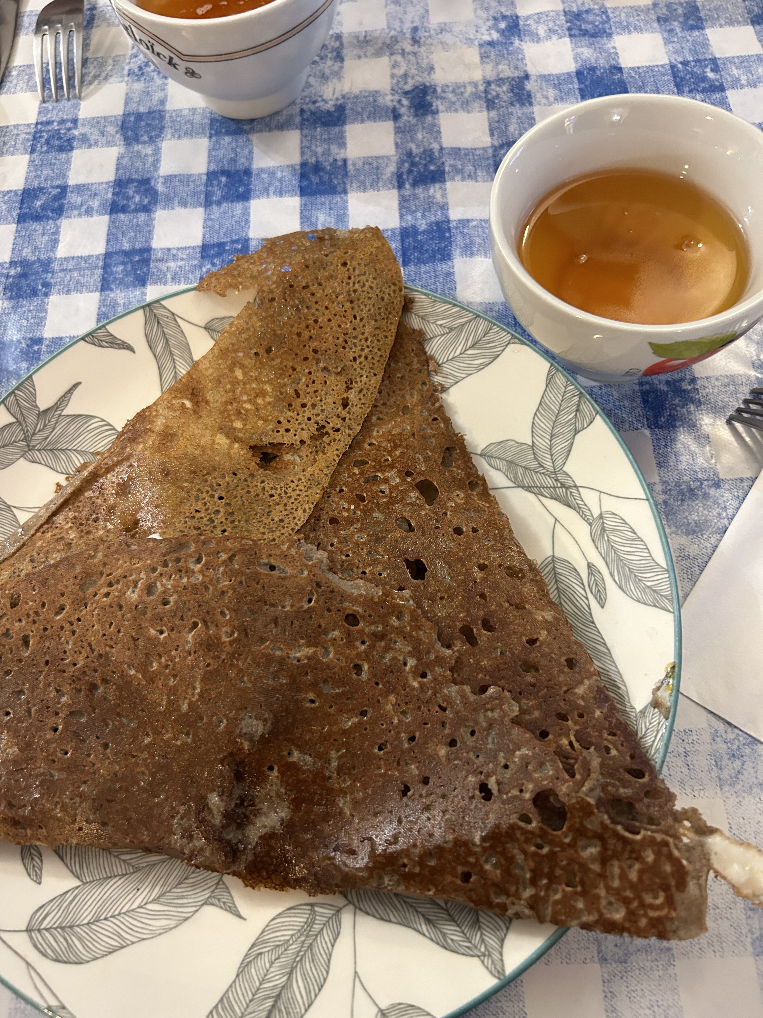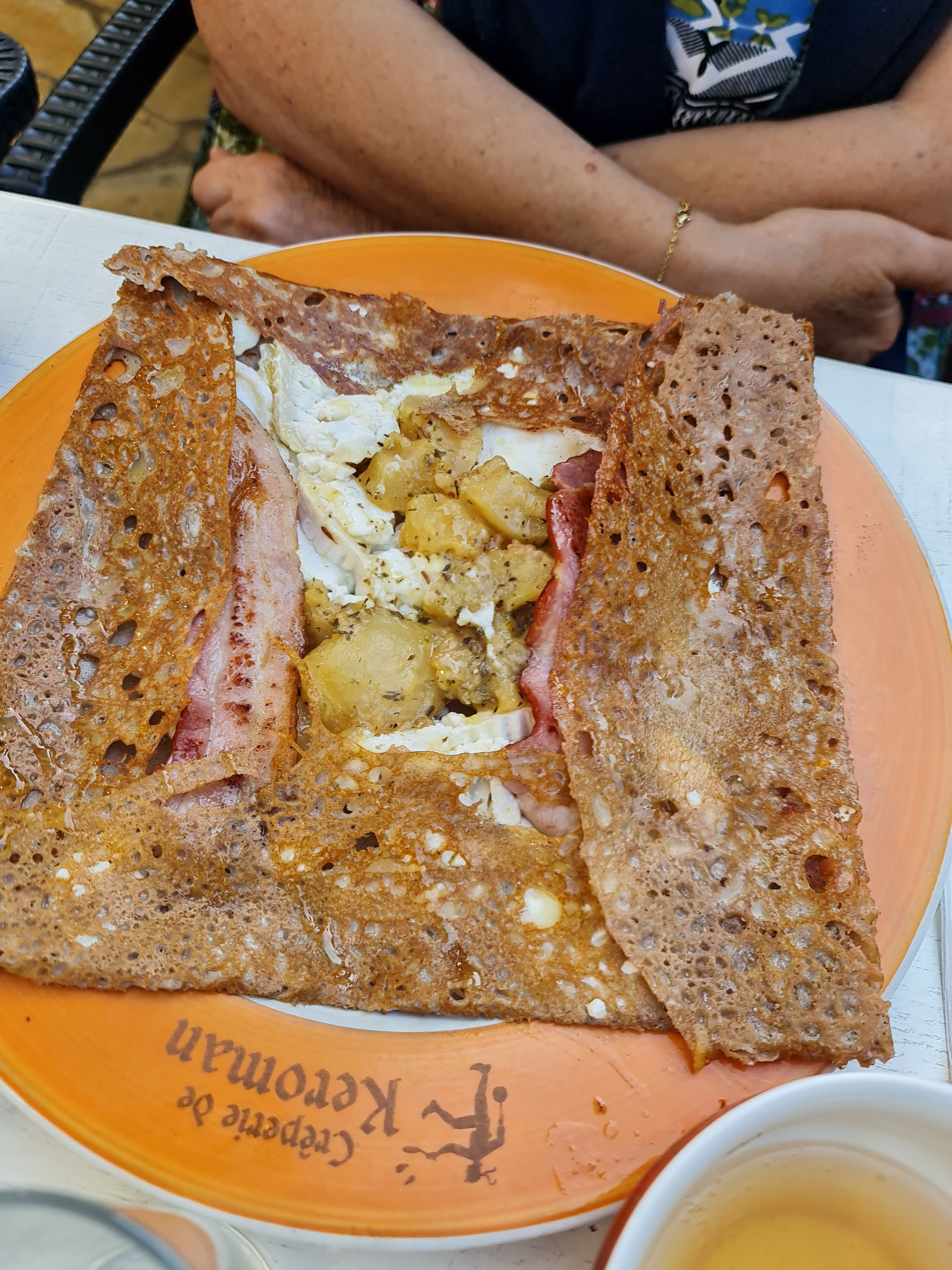 Galette trop sèche qui se brise dès qu'on la coupe. Garniture copieuse mais sans aucun goût. Quant à la crêpe pomme, goût de carton avec peu de pomme. Tout ça pour un prix pas très bon marché. Une crêperie à éviter si on veut garder un bon souvenir de la cuisine bretonne.