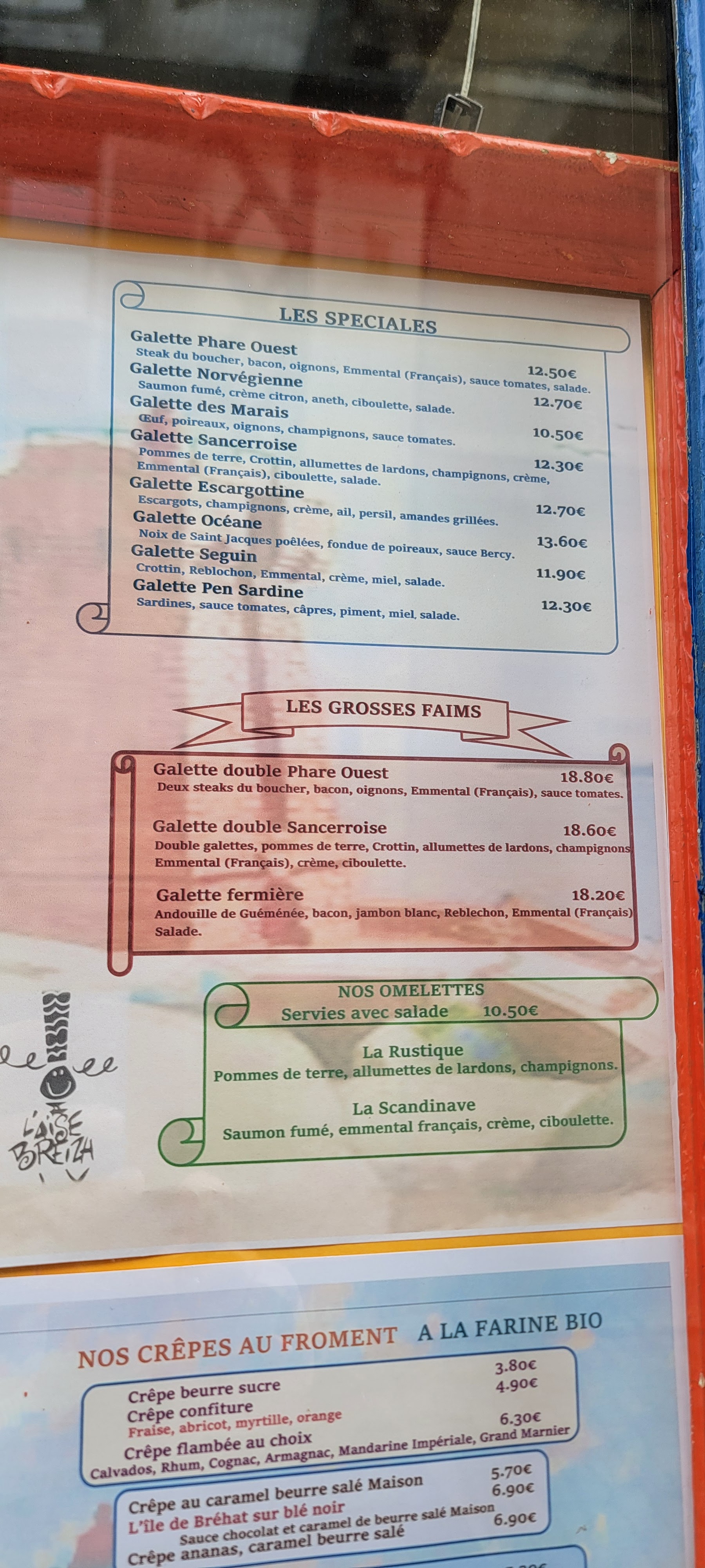 Des galettes et crêpes de froment avec des farine bio. Les galettes sont succulentes et copieusement garnis. La salle agréable avec des tableaux de bretons et bretonnes qui font rêver, on s'y croirait. Une terrasse en arrière cour au frais par grande chaleur, c'est appréciable. Quant au service, rien à y redire, on a toujours été agréablement accueilli avec sourire et sympathie Une crêperie que je recommande vivement.