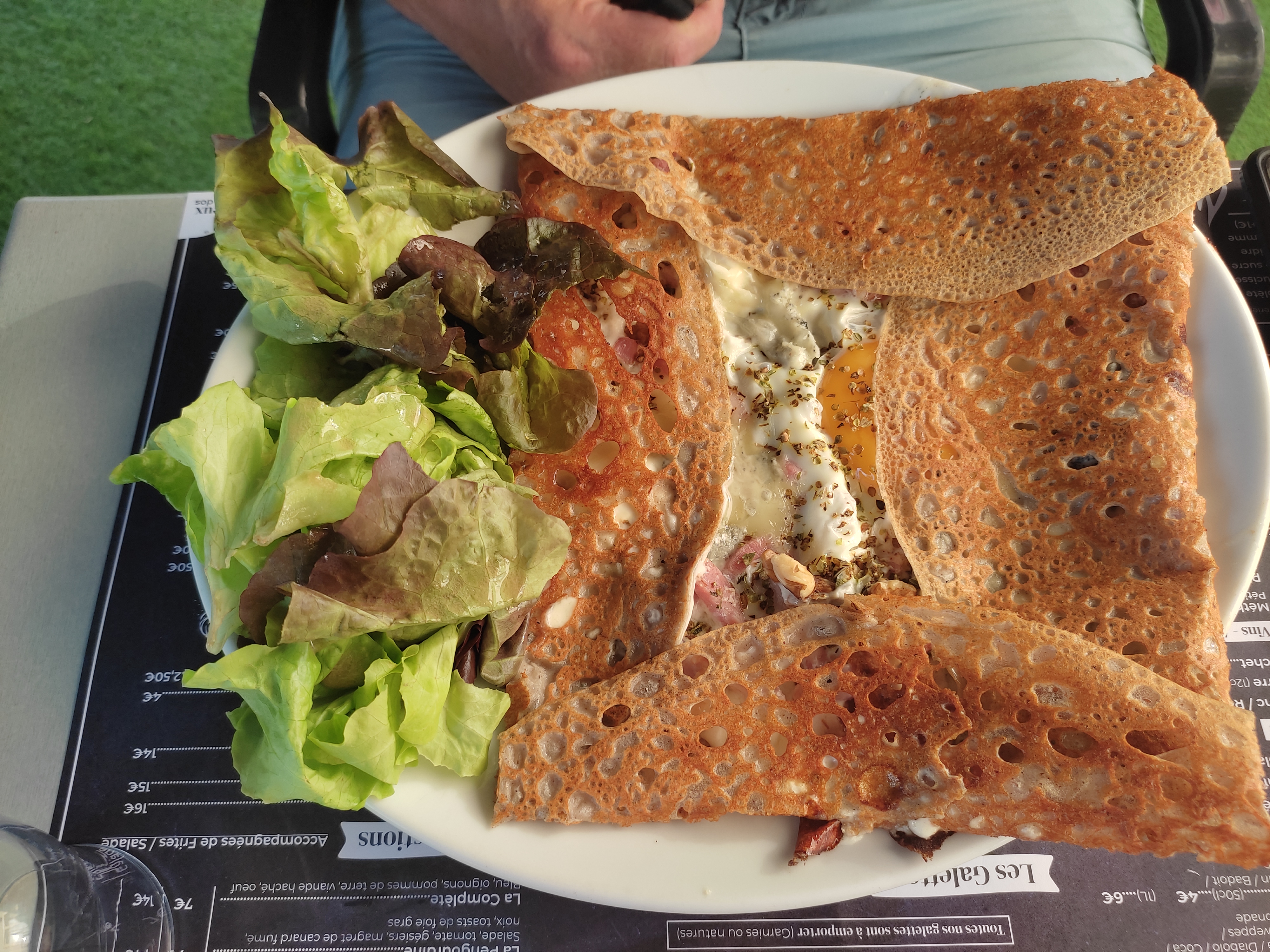 Accueil souriant. Terrasse agréable et ombragée. J'ai choisi une galette composée de 3 ingrédients parmi la liste proposée : œuf, reblochon et fondue de poireaux. Je regrette un léger manque de cuisson des poireaux qui en plus étaient assez fades. Petit bémol pour l'apéritif : pas d'accompagnement...dommage. Prix très corrects.