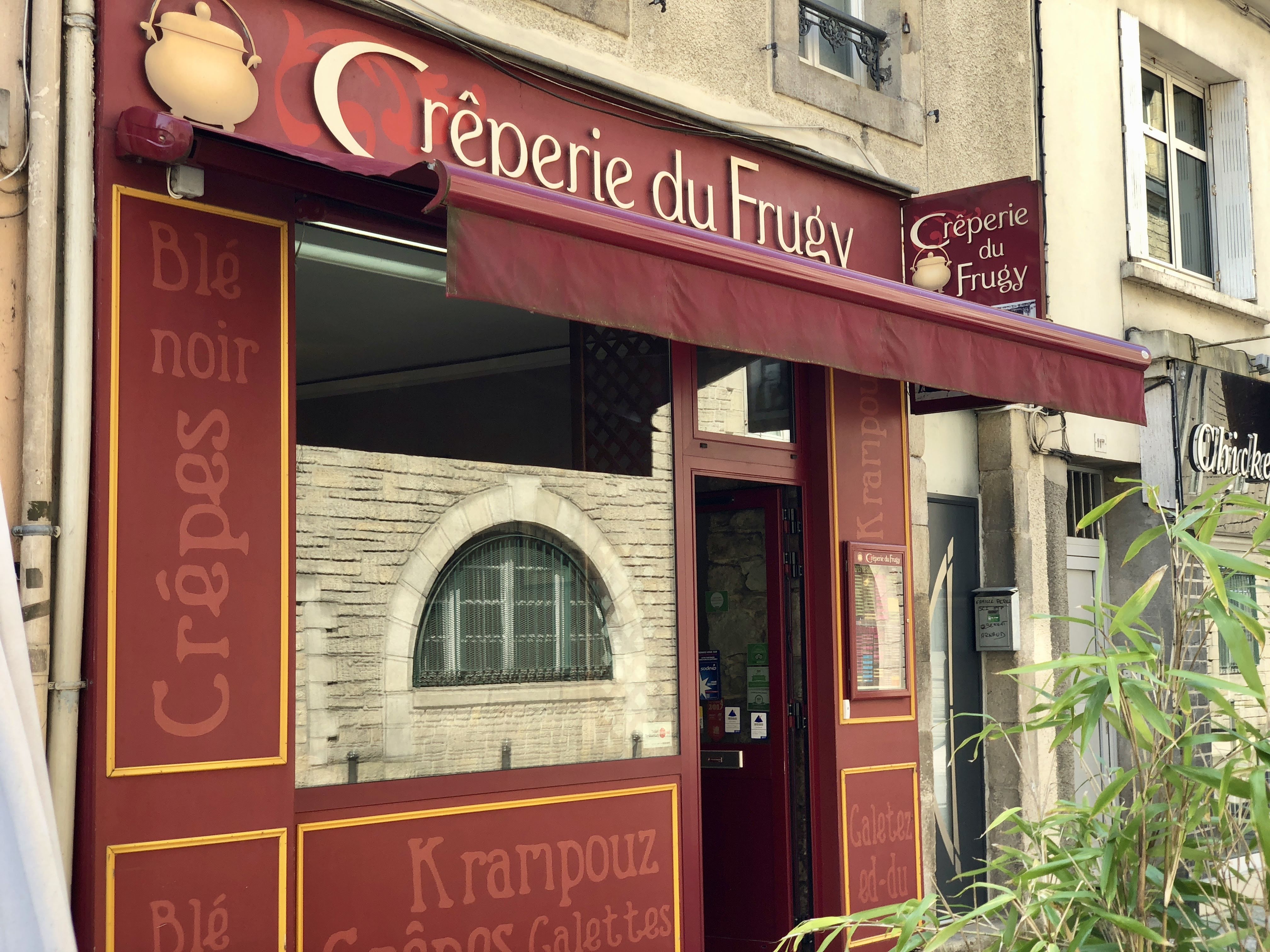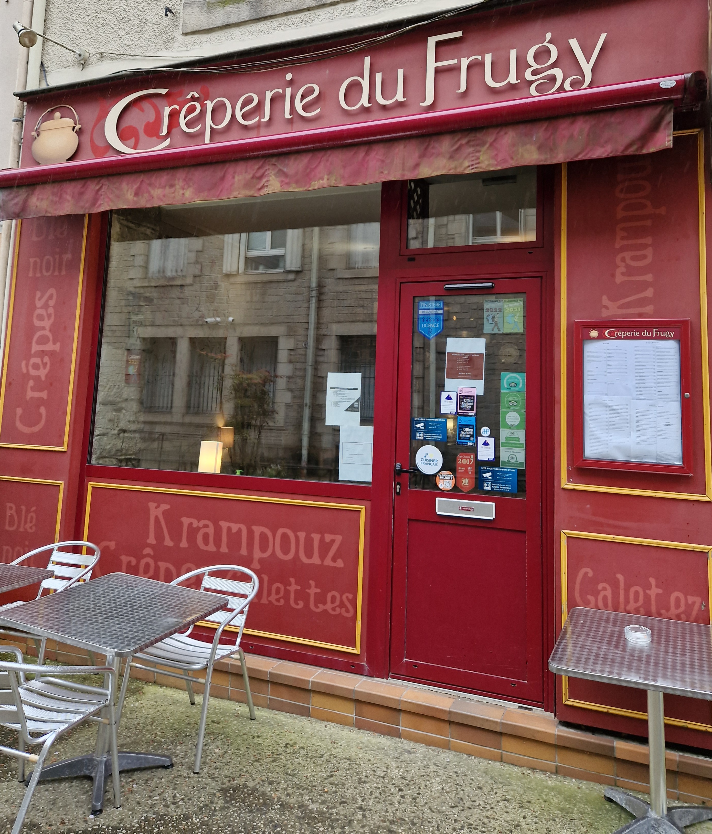 Quimper est sans doute une des villes de Bretagne qui compte le plus de crêperies et la place au beurre, la bien nommée, en est l'exemple. Il faut donc avoir la sagesse de se déporter jusqu'au 9 rue Sainte-Thérèse pour un très bon moment. Les crêpes du Frugy sont vraiment excellentes. La pâte certes, la cuisson aussi mais tous les ingrédients utilisés sont de qualité. Il y a un choix d'importance et les prix sont raisonnables. La décoration est originale, un rien old school avec des photos anciennes agrandies. Une immense broderie de Pascal Jaouen ( son école d'art est dans la ville) orné les murs. Pour finir, le service est prévenant, chaleureux et efficace. Une des meilleures crêperies du Finistère et je sais de quoi je parle, j'ai une crêperie moi même à Lyon depuis... 40 ans.