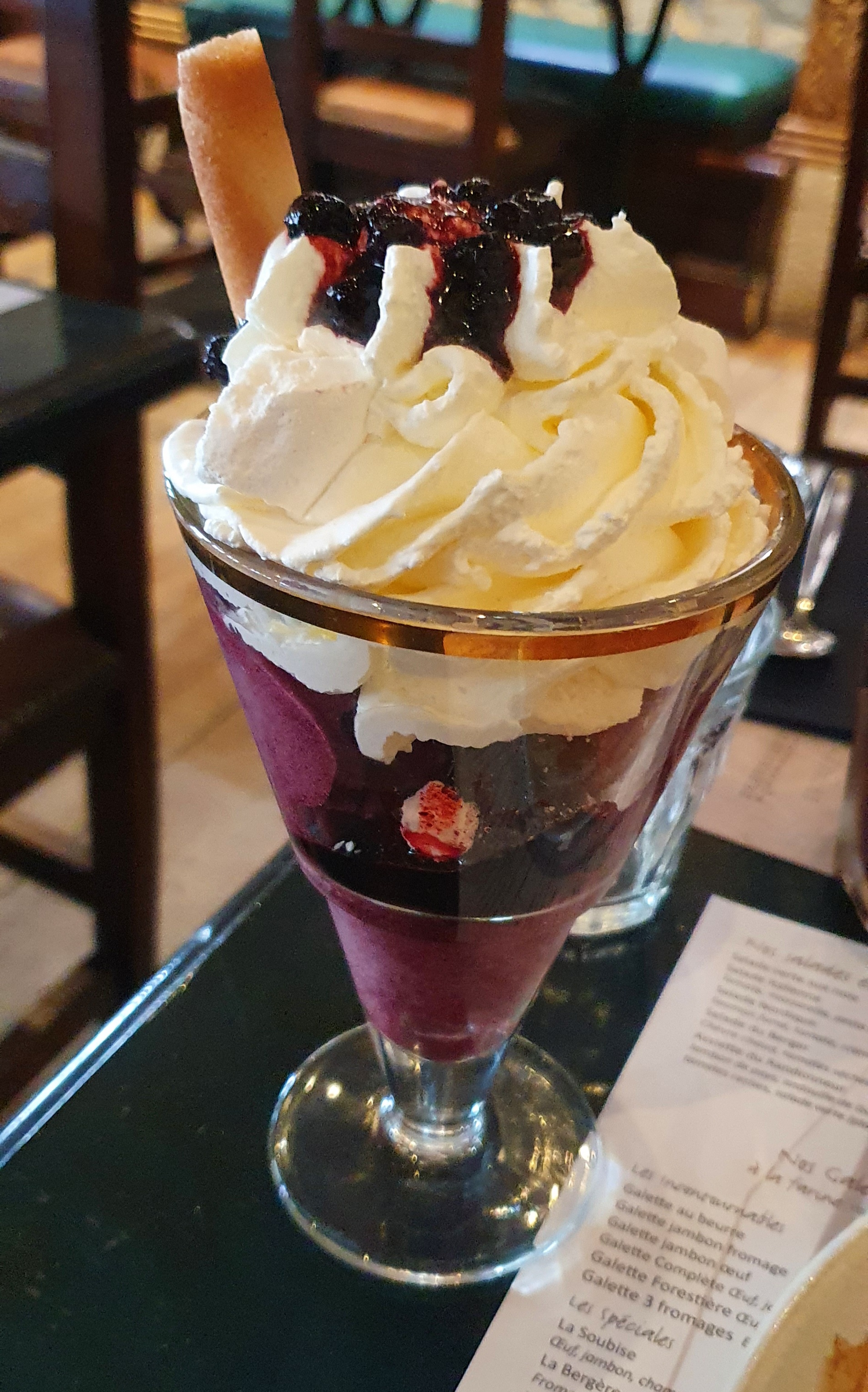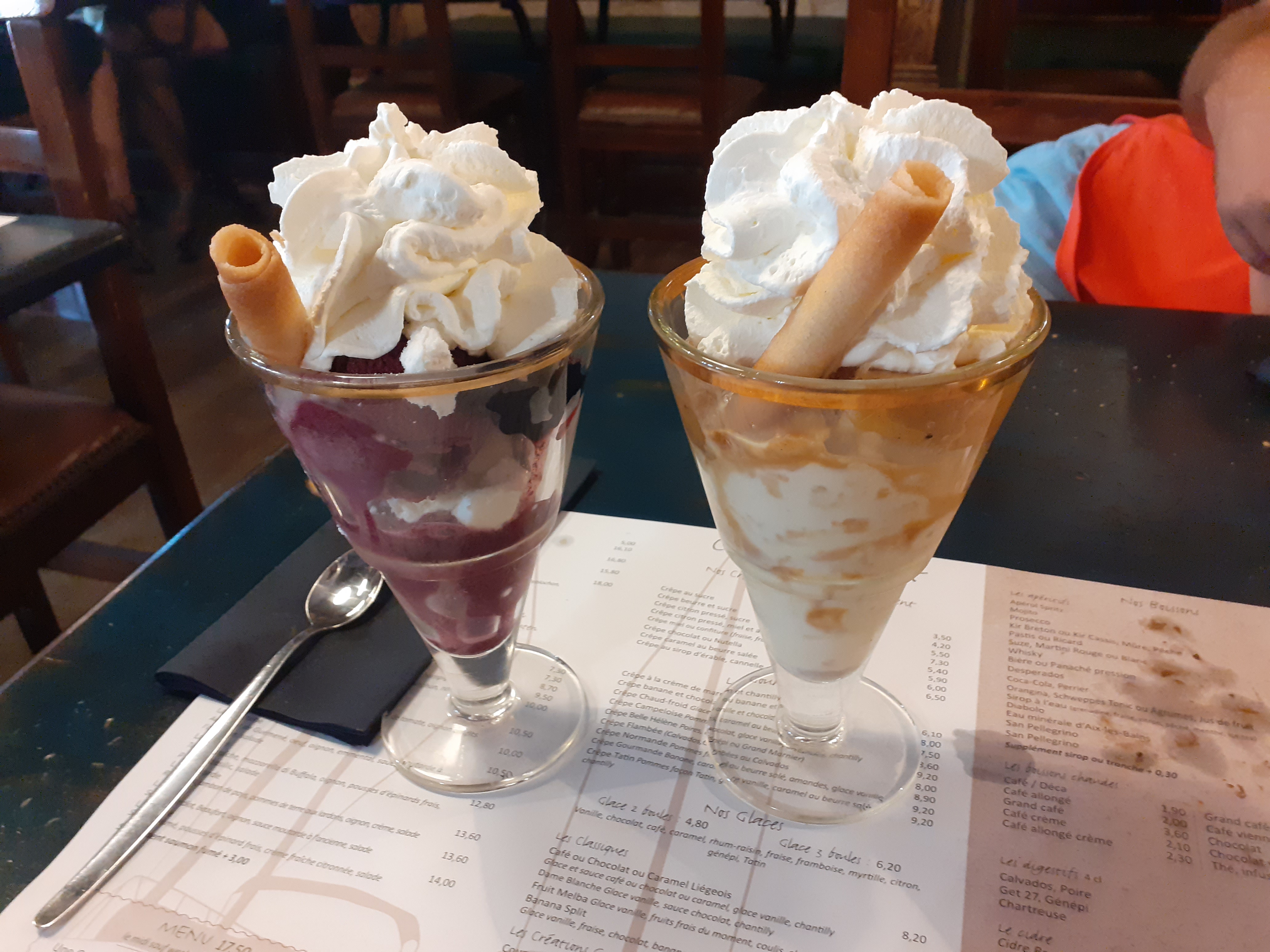 Il est malheureux de se retrouver à payer une glace immangeable 9€ à cause d'un surdosage en alcool de la serveuse (qu'elle même nous a avoué) et d'une réponse plus que hautaine de la part de la patronne qui refusa tout arrangement sous prétexte que si on dose une coupe glacée avec 80% d'alcool et 20% de glace ça aura le même goût que si on en dose une avec 10% d'alcool et 90% de glace. De plus ayant fait la remarque que le génépi dans cette coupe n'était pas bon, la patronne m'a jugé en me disant ce que devrait être un vrai génépi avant de se rétracter pour me dire que dans un restaurant il ne faut pas s'attendre à un bon alcool quel qu'il soit. Je n'y reviendrai jamais malgré leur bonnes crêpes, car la patronne n'est pas du tout commerciale ou compréhensive d'un quelconque désappointement.