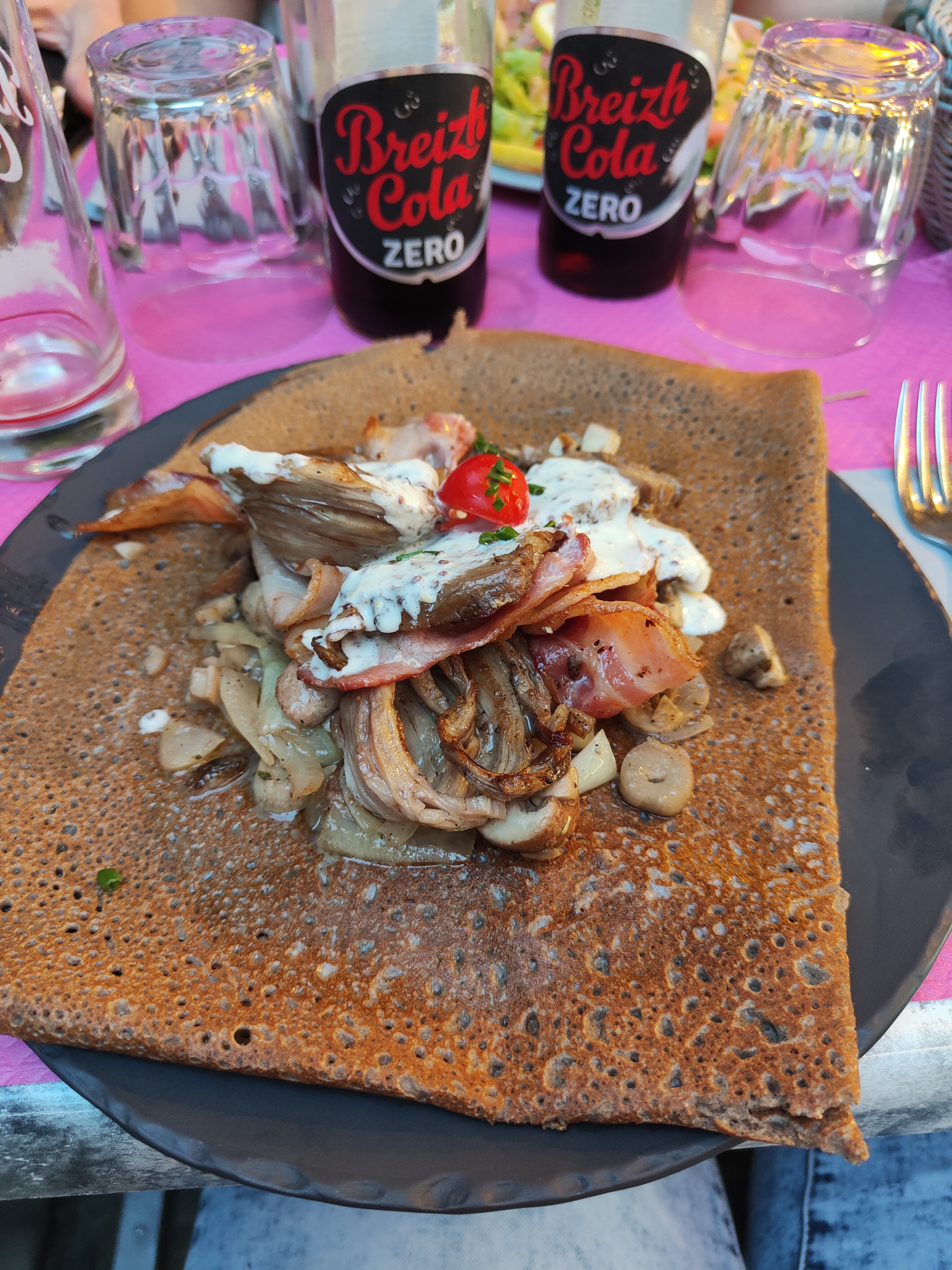 Pensez à réserver 📞, parce que malgré les prix 10 à 15 euros la crêpe, 16 euros la bouteille de cidre 💶💶, c'est très prisé. Du Morbihan jusqu'au Finistère, on consomme souvent la crêpe « kraz » : bien cuite, croustillante et beurré. Mais ici on est sur du « soupic », une crêpe plus molle et par définition moins cuite. Conclusion : des galettes/crêpes, mais pas bretonnes.