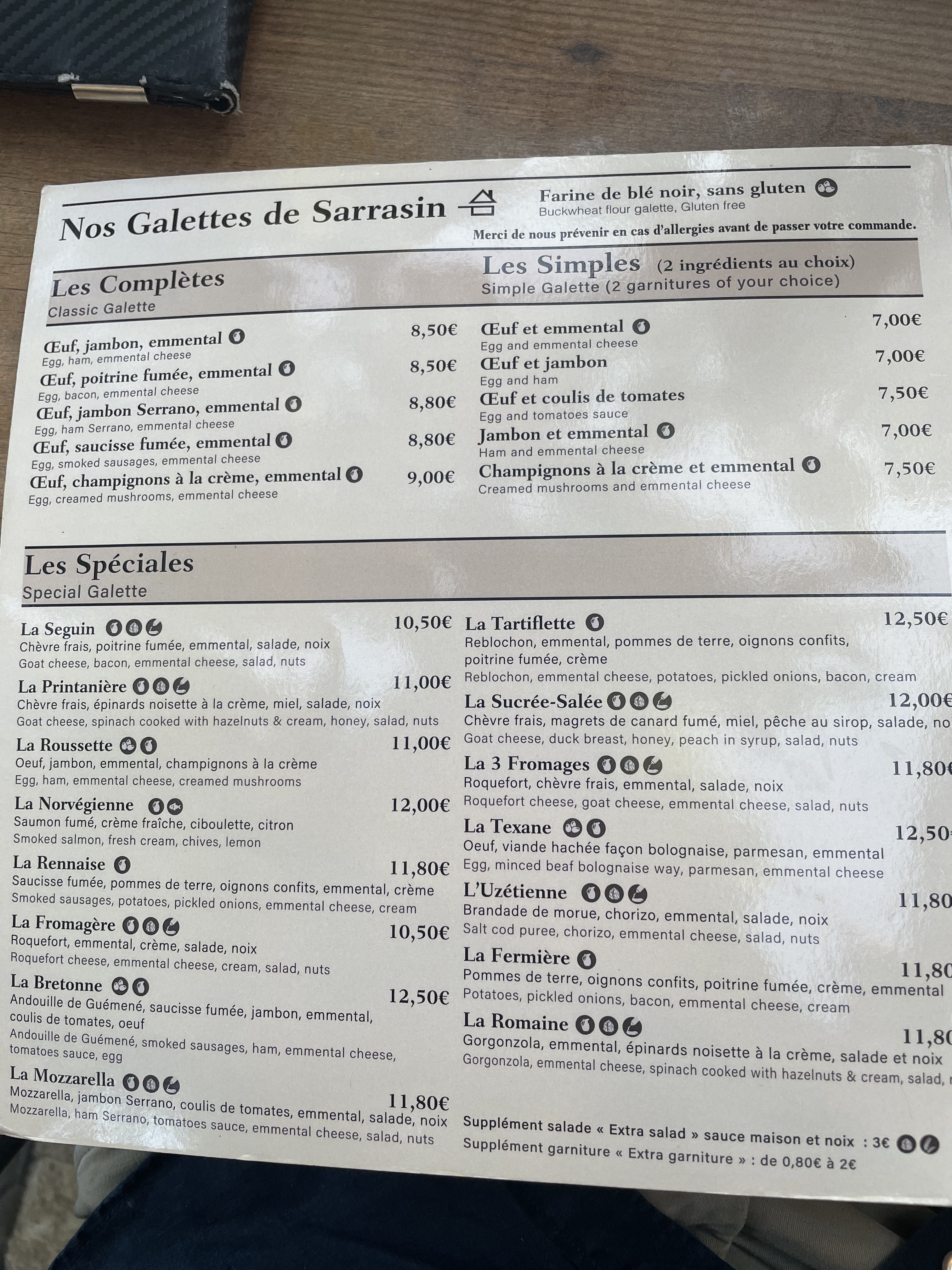 Nous avons mangé dehors car il n'y avait pas de place à l'intérieur. Ils nous ont servi rapidement mais il leur a fallu du temps pour nous servir. Bonne nourriture. Une option économique compte tenu des prix des restaurants en France. Toutes les galettes sont accompagnées d'une salade particulièrement délicieuse grâce à la sauce vinaigrette qu'elles ont ajoutée.