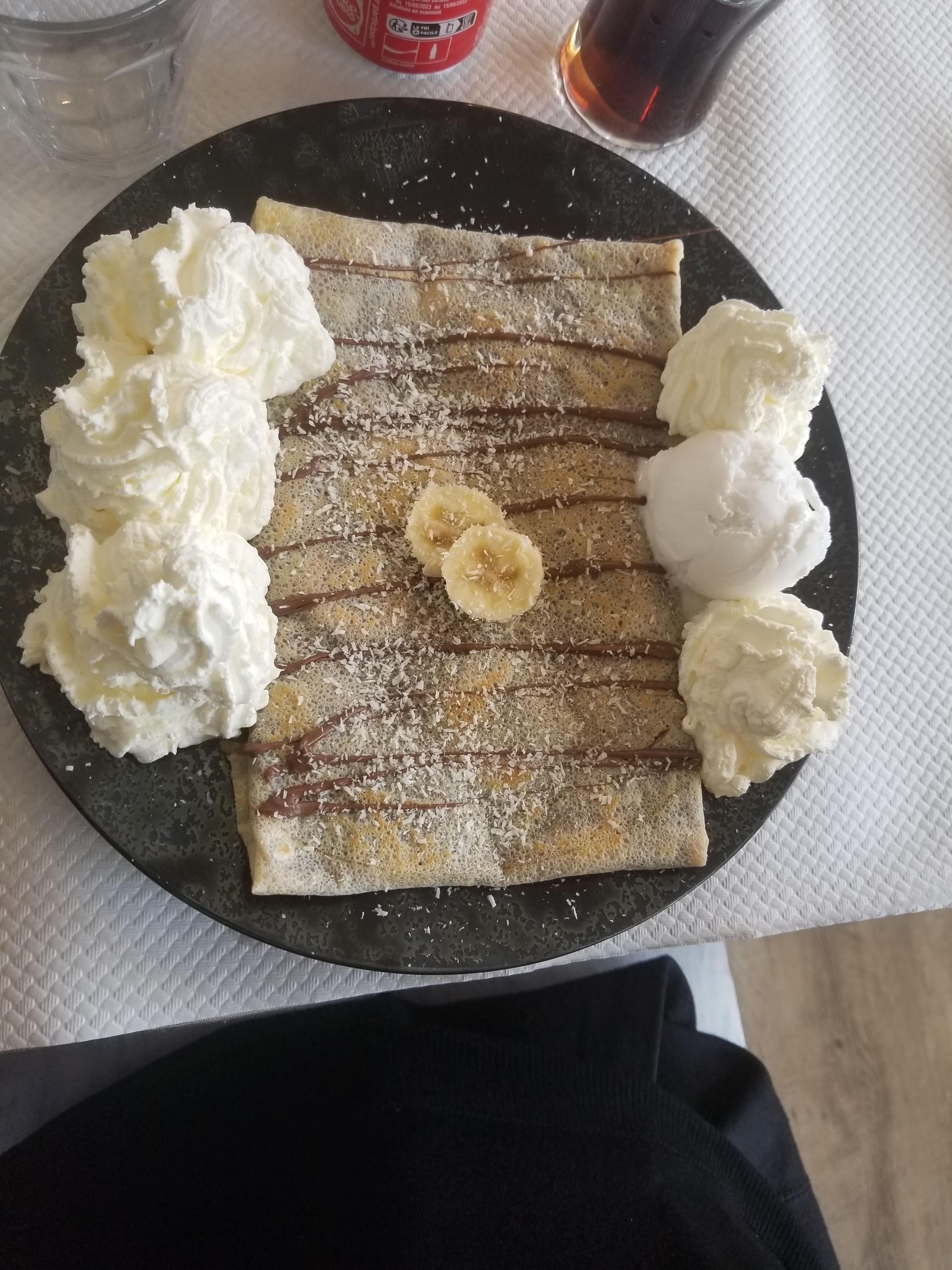 Ma sœur et moi avons eu une crêpe à partager et des glaces, j'ai eu du café et elle du chocolat et de la menthe. Tout était très bien. Après que notre serveuse ait réalisé que nous ne connaissions qu'un peu de français, elle a parlé en anglais pour nous aider.