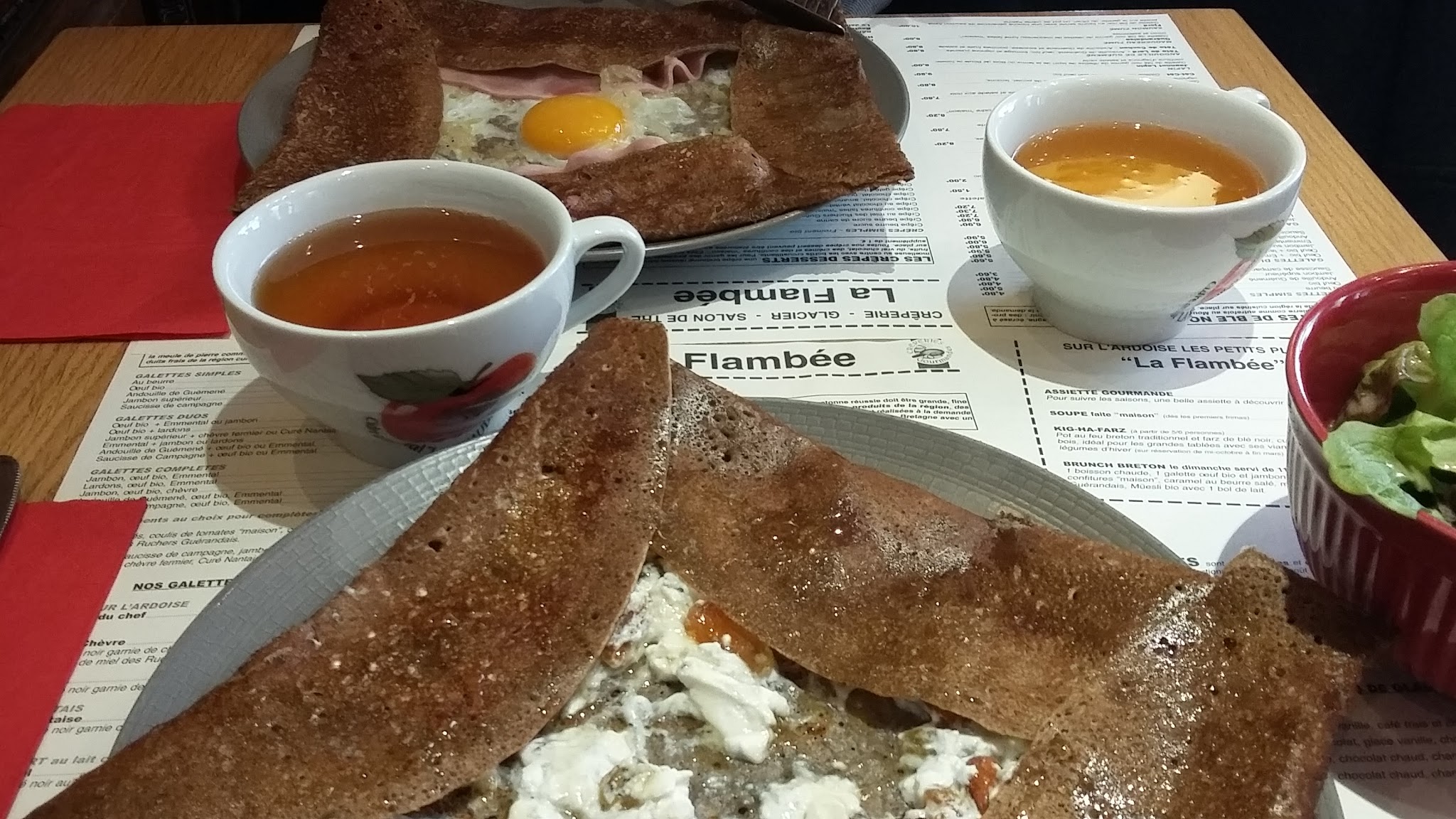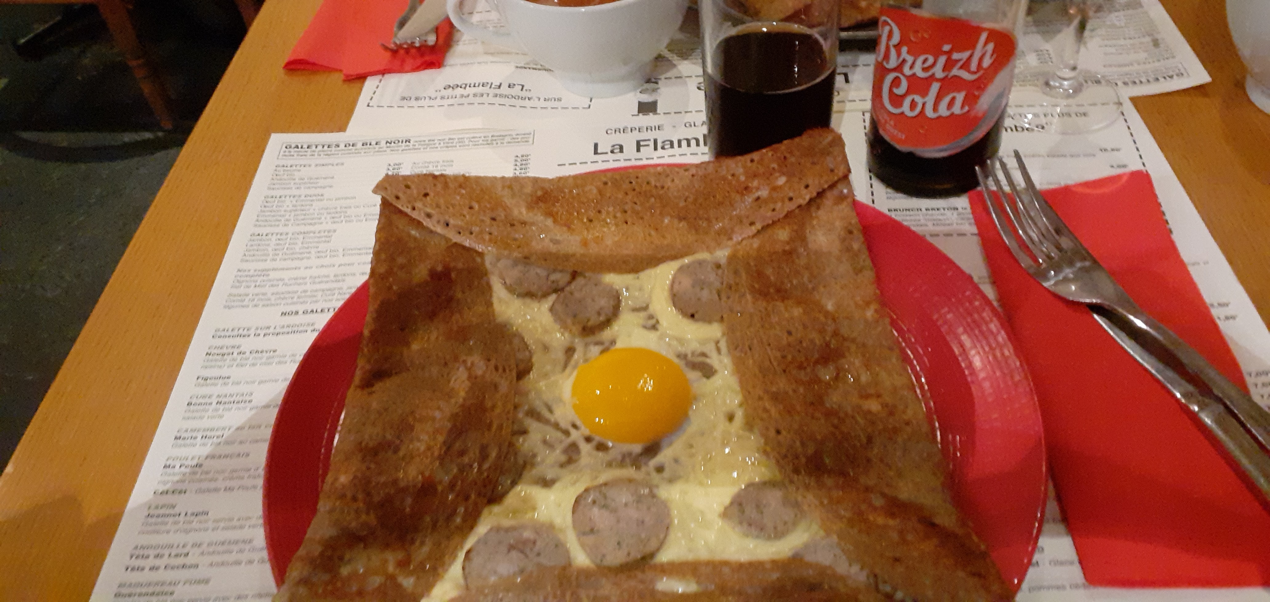 Lors d'une balade sur Guérande nous découvrons La Flambée, crêperie bretonne accueillante avec ambiance et décoration très agréable. Les garnitures des galettes sont originales et les galettes particulièrement savoureuses. 👍🏻 Néanmoins celles que nous avons choisies nous ont parues mal réalisées et peu délicates (Ma poule et Jeanneau-lapin). C'est bien dommage.