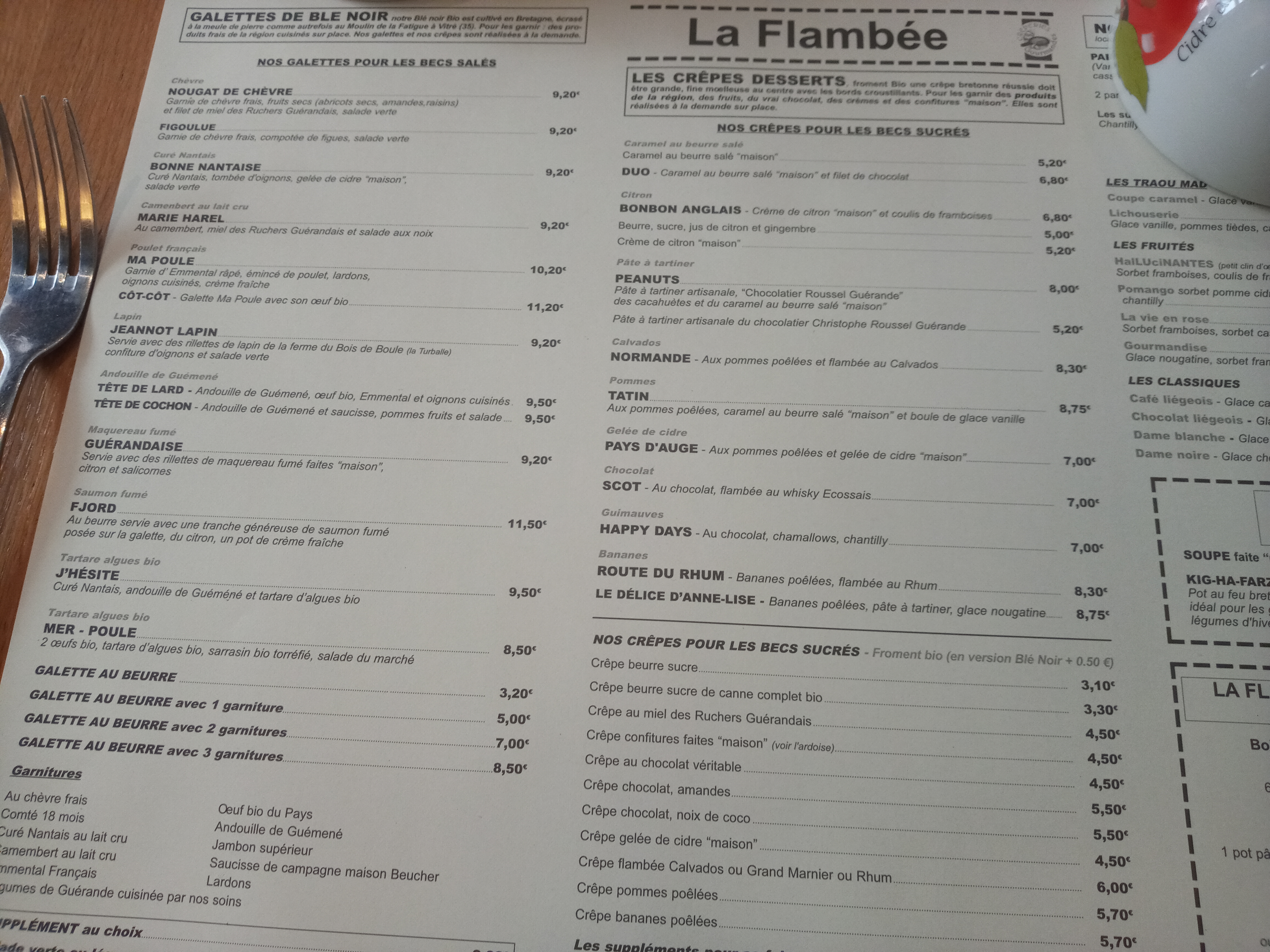 Lors de notre séjour dans la belle petite ville de Guérande, nous avons déjeuné deux fois à La Flambée (à l'étage car il y avait beaucoup de monde mais la salle est bien agréable). Les galettes y sont délicieuses (je les préfère kraz) et garnies pour tous les goûts (il est possible de composer sa garniture personnalisée). J'ai particulièrement apprécié la J'hésite et en dessert la G plus faim (ça ne s'invente pas !!!). Les deux serveuses et la patronne ont été très agréables et professionnelles.