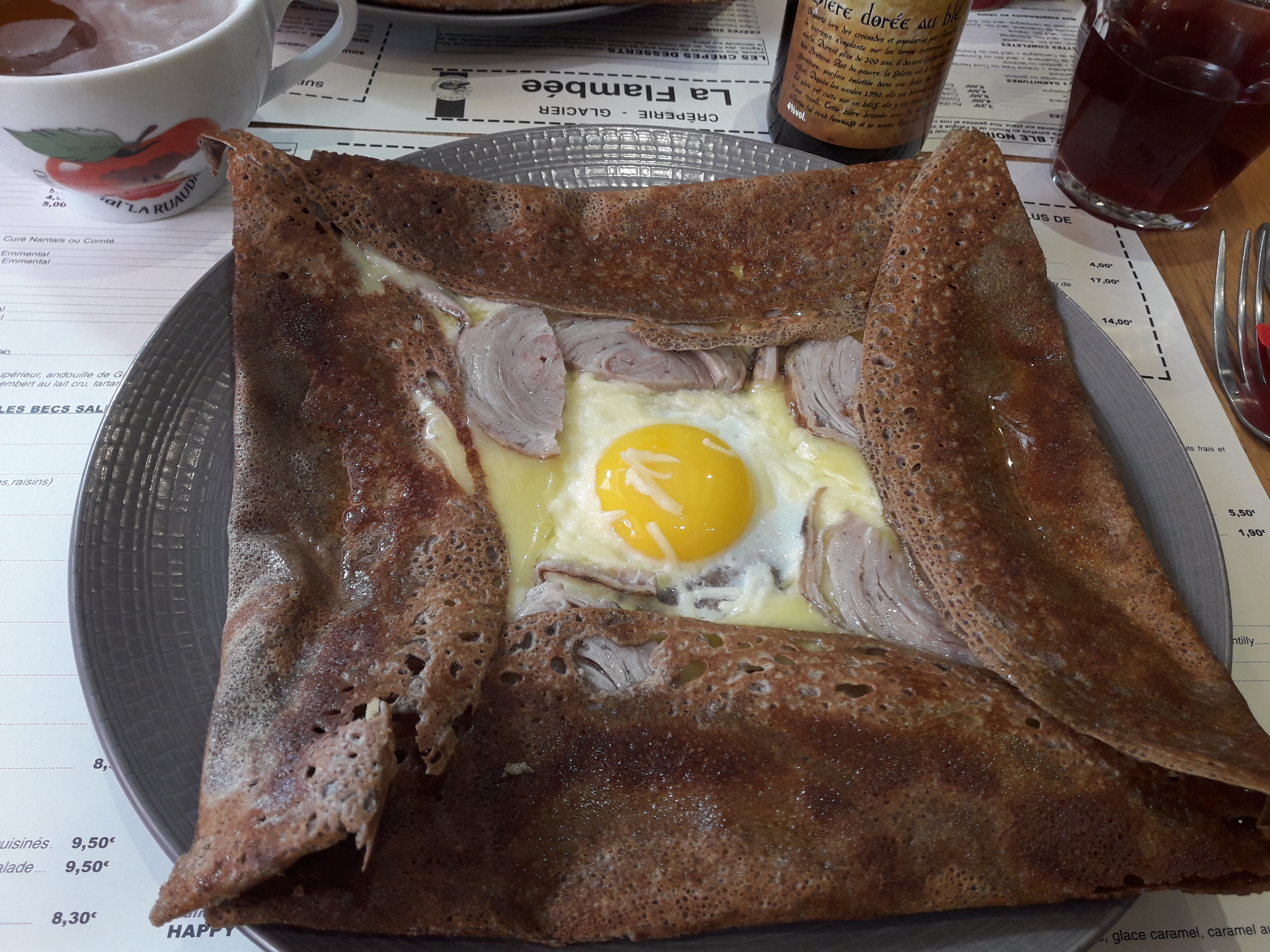 Galette très peu garni d'ingrédients bas de gamme, galette tranche de truite fumée et un pot de crème liquide 18% a côté ET C'EST TOUT! Peu franchement mieux faire! Quant à la gérante très désagréable, elle n'a vraisemblablement pas le commerce dans le sang. Serveur efficace. On en ressort pas avec un super souvenir !!!