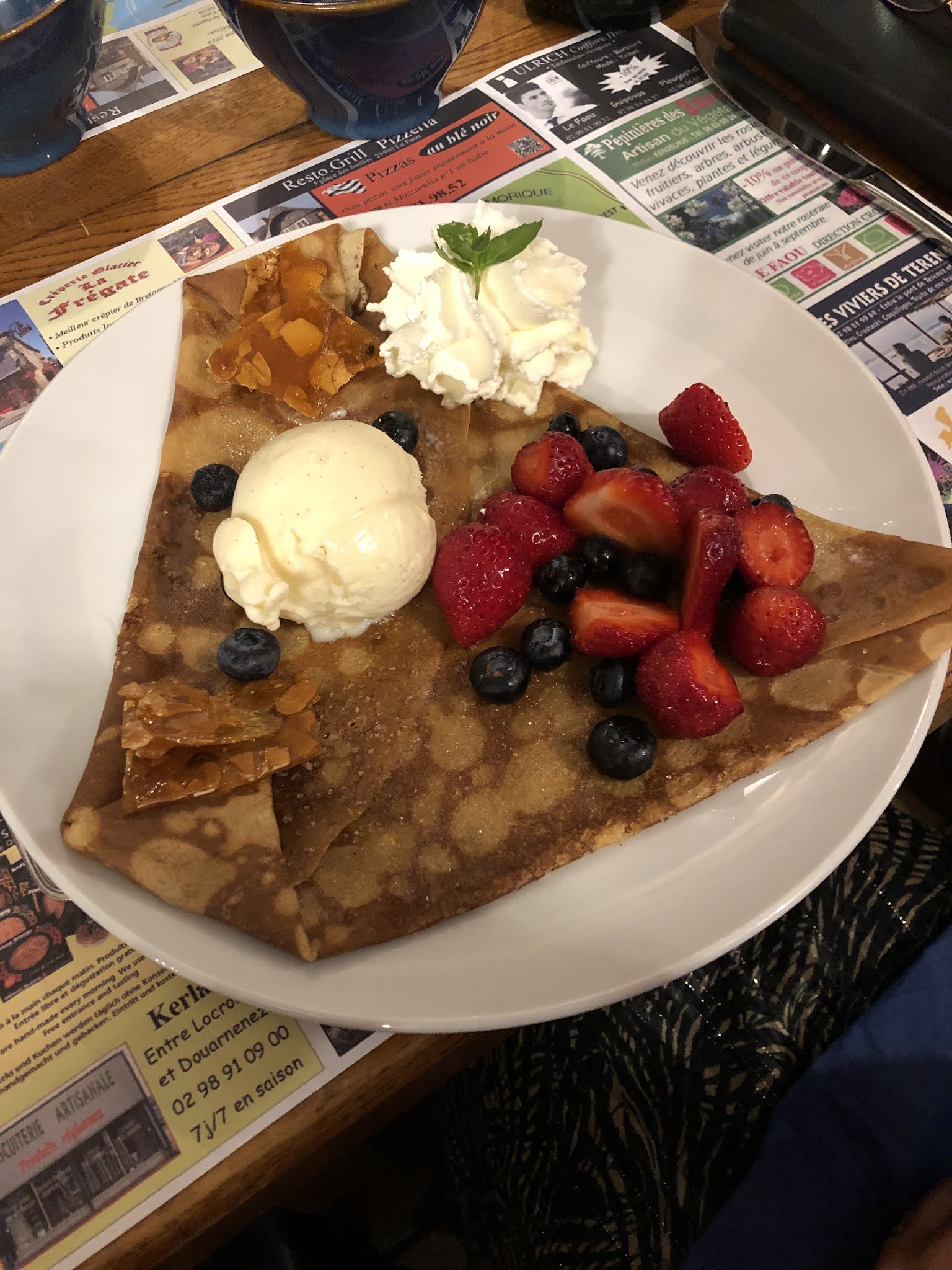 Petit apéro très sympa, le Plougastel, (cidre, crème de fraise de Plougastel, calvados) et très bon. Ensuite la crêpe de blé noir la savoyarde servie avec sa petite salade, je me suis vraiment régalé, et pour finir la caranougat, alors beaucoup de nougat mais bon c'est le but. 😉 Dommage la crêpe sucrée un peu trop salée à mon goût, mais bon malgré tout, un très bon repas, avec un bon accueil. Parcontre pour les intéressés, prenez soin de réserver à l'avance, établissement très demandé. 👍😉 Bon appétit à tous