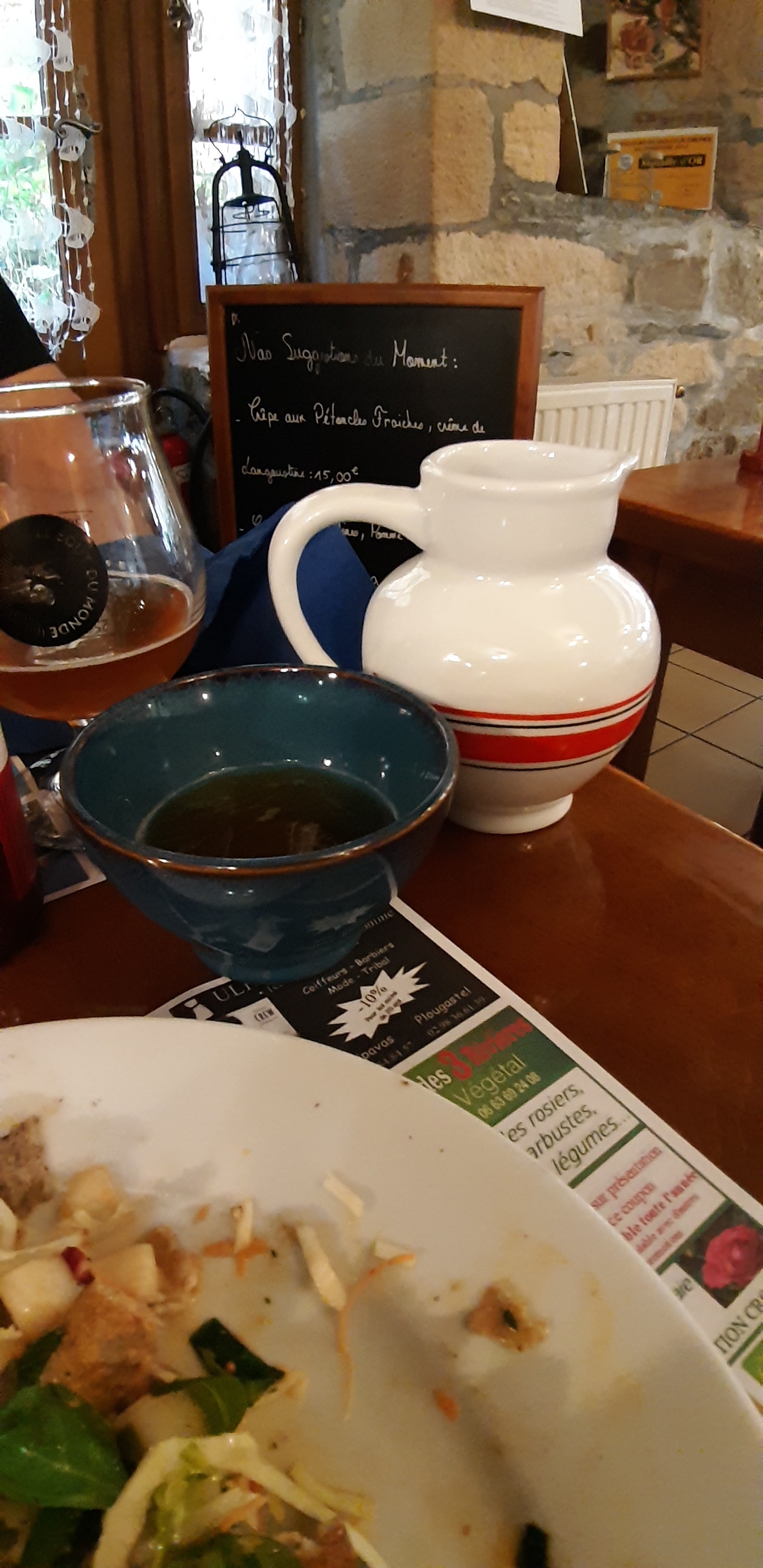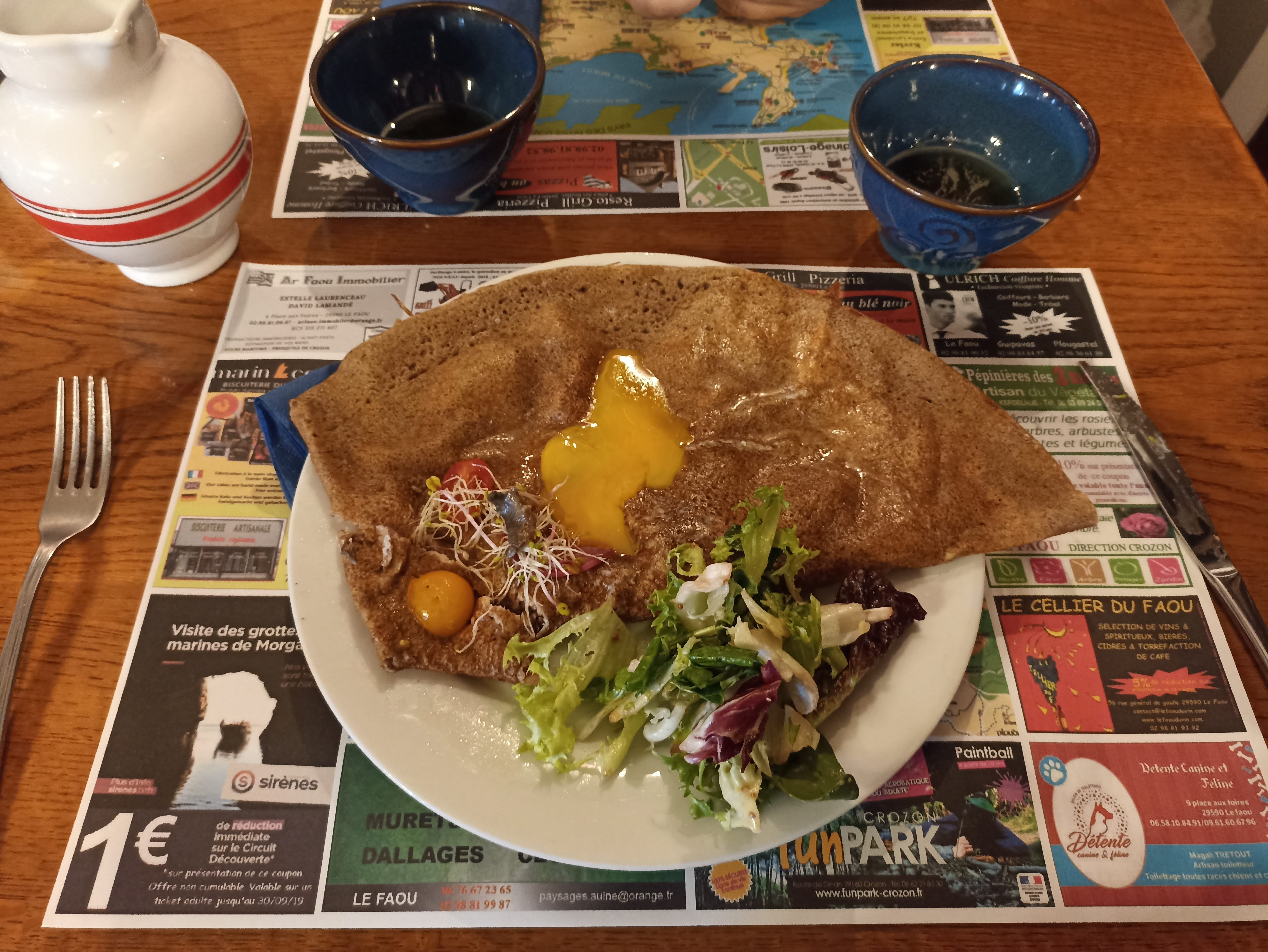 Une vrai crêperie bretonne dans un petit village finistérien Le Faou. C’est beau, c’est bon, c’est agréable. Goûtez aux crêpes composées, elles sont divines et buvez un lait ribot, c’est un lait de vache fermenté et une spécialité culinaire bretonne.