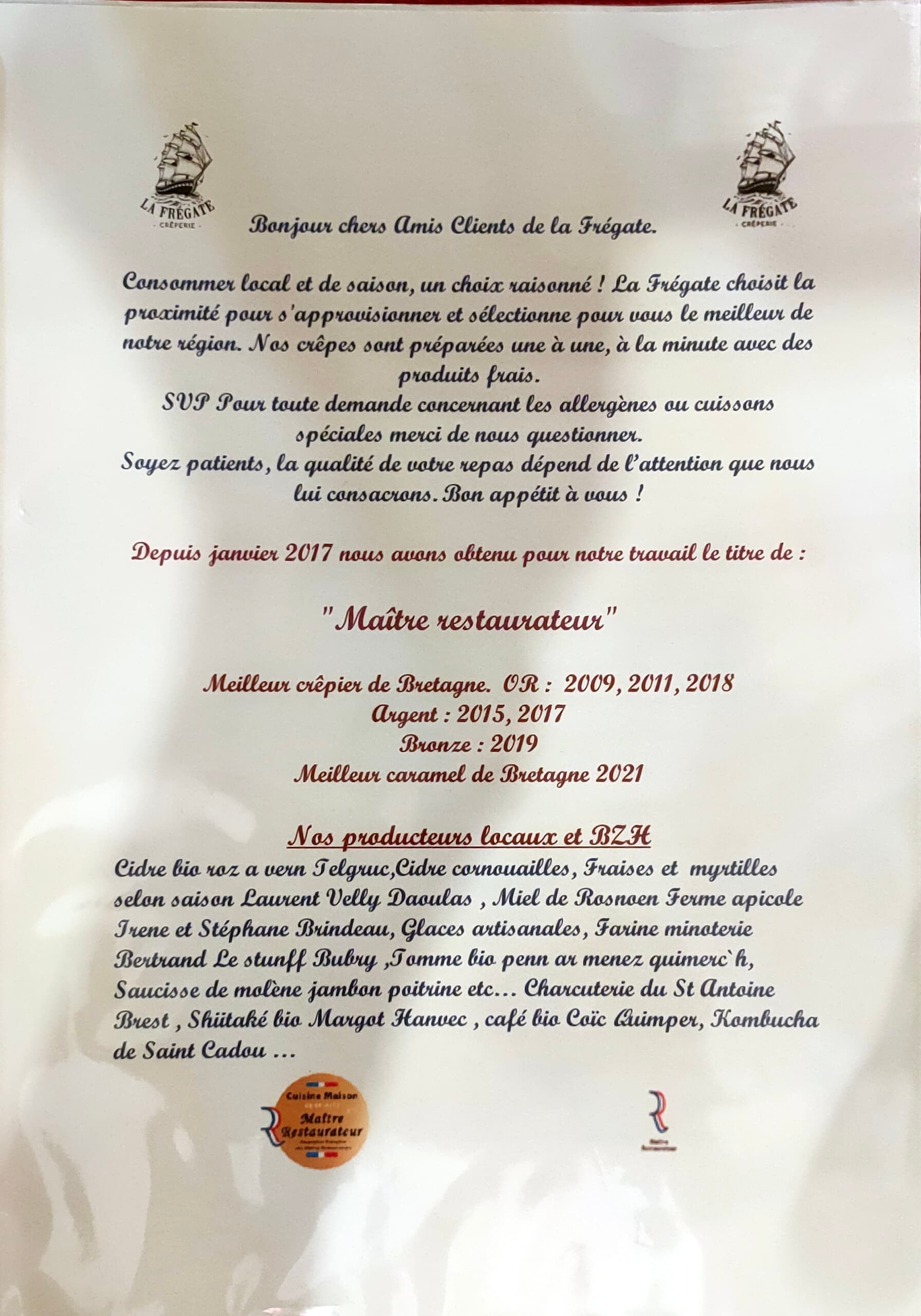 Des crêpes delicieuses et originales. On sent la recherche dans le mélange des saveurs. Que c est agréable quand le talent et l amour du métier sont au rendez-vous ! Le cidre très bien choisi. Un cadre authentique. Nous sommes venus après avoir vu une émission les concernant qui expliquait que la Fregate etait la meilleure creperie de Bretagne. Effectivement nous leur decernons également notre prix familial de meilleure crêperie du MONDE ! Et nous sommes gourmands et gourmets! Mon conseil : il faut réserver plusieurs jours en avance si vous voulez les goûter. Votre Fregate est magnifique comme vous. On vous adore. Quel souvenir impérissable de notre semaine dans le Finistère ! Bon vent à vous 3.