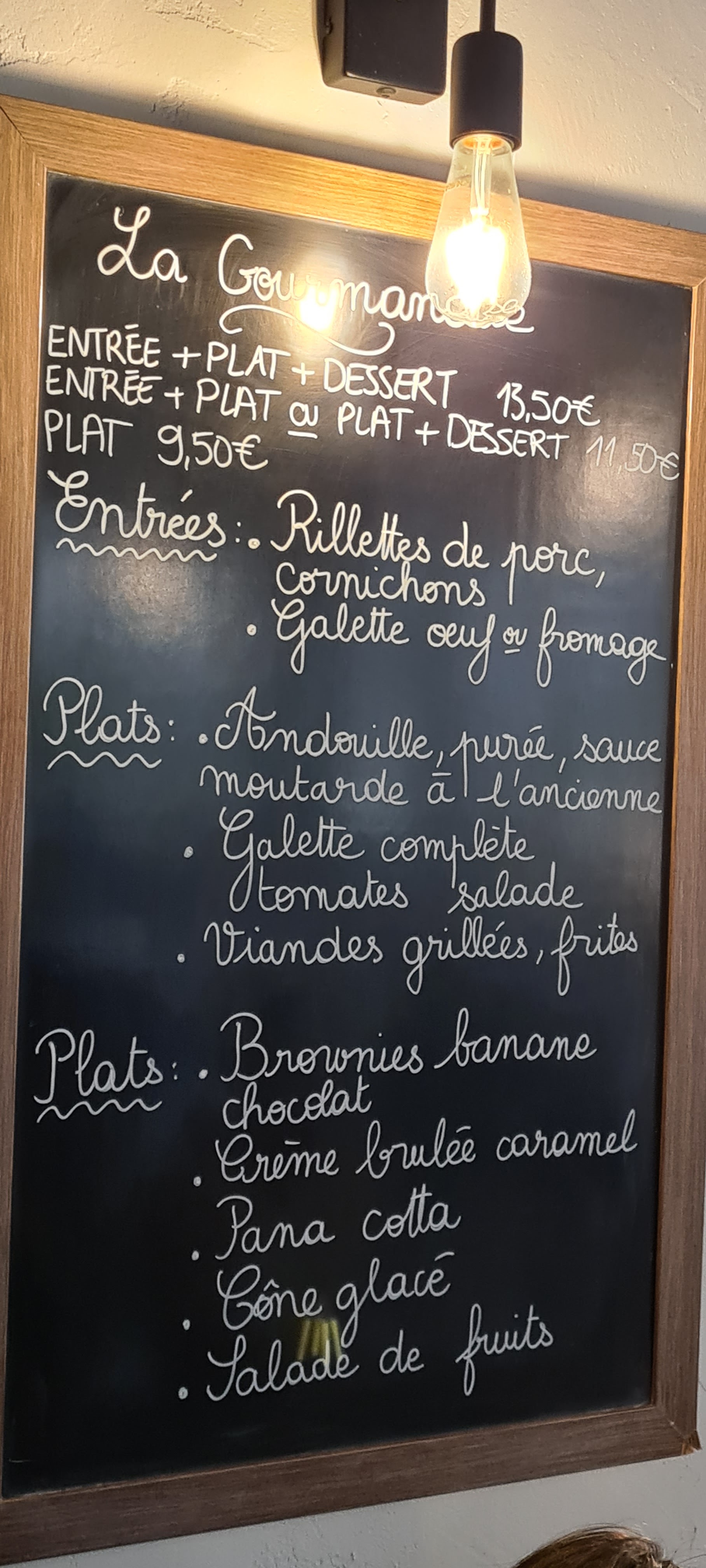 De passage je me suis arrêté à la gourmandise. Menu simple à 11 euros Mais bonne galette et plat du jour avec des produits faits maison sauce frites etc Je recommande et vu les plats hors menu je recommande