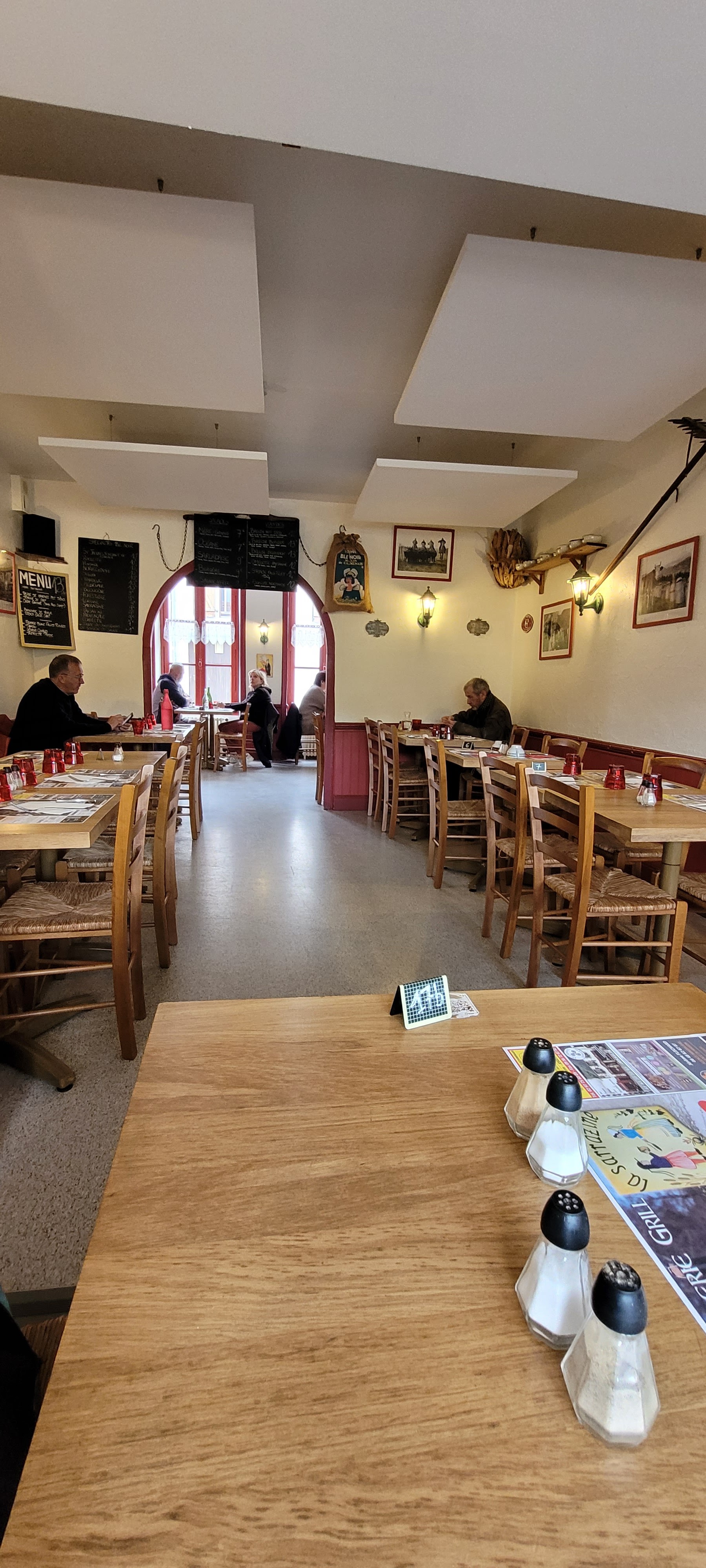 Déjeuner samedi midi en famille. Le restaurant était plein, nous acceptons d'attendre sans problème. Côté cuisine, pour le tarif je m'attendais à une galette un peu plus garnie (médiévale), salade sachet sans vinaigrette, moyen ; mais produits bien cuisinés. Crêpe dessert très bien (bocage) Côté déco, cadre vieillot et demande un coup de dépoussiérage. Pas beaucoup d'espace entre les tables, on a l'impression des fois de gêner pour le passage du service.
